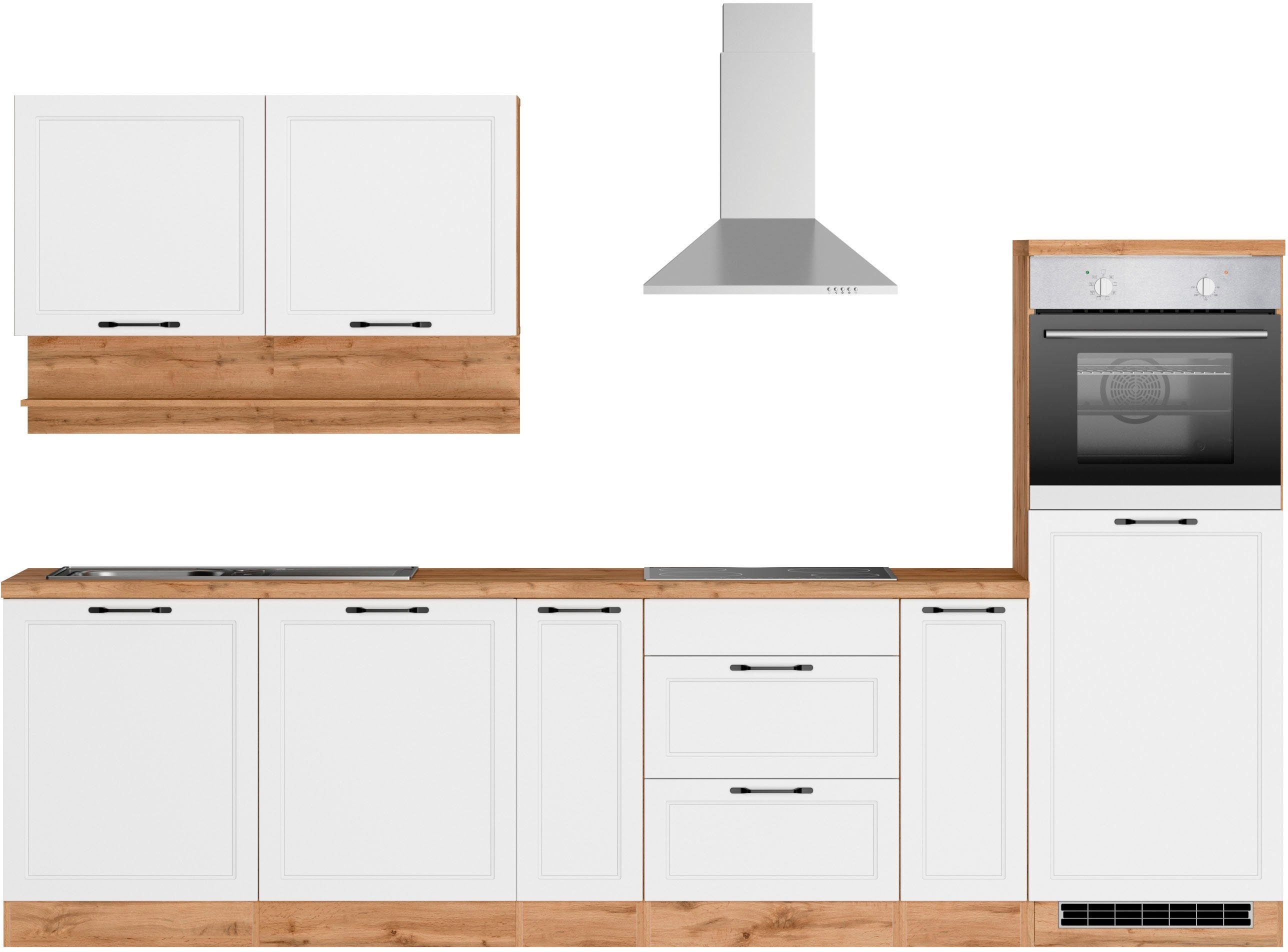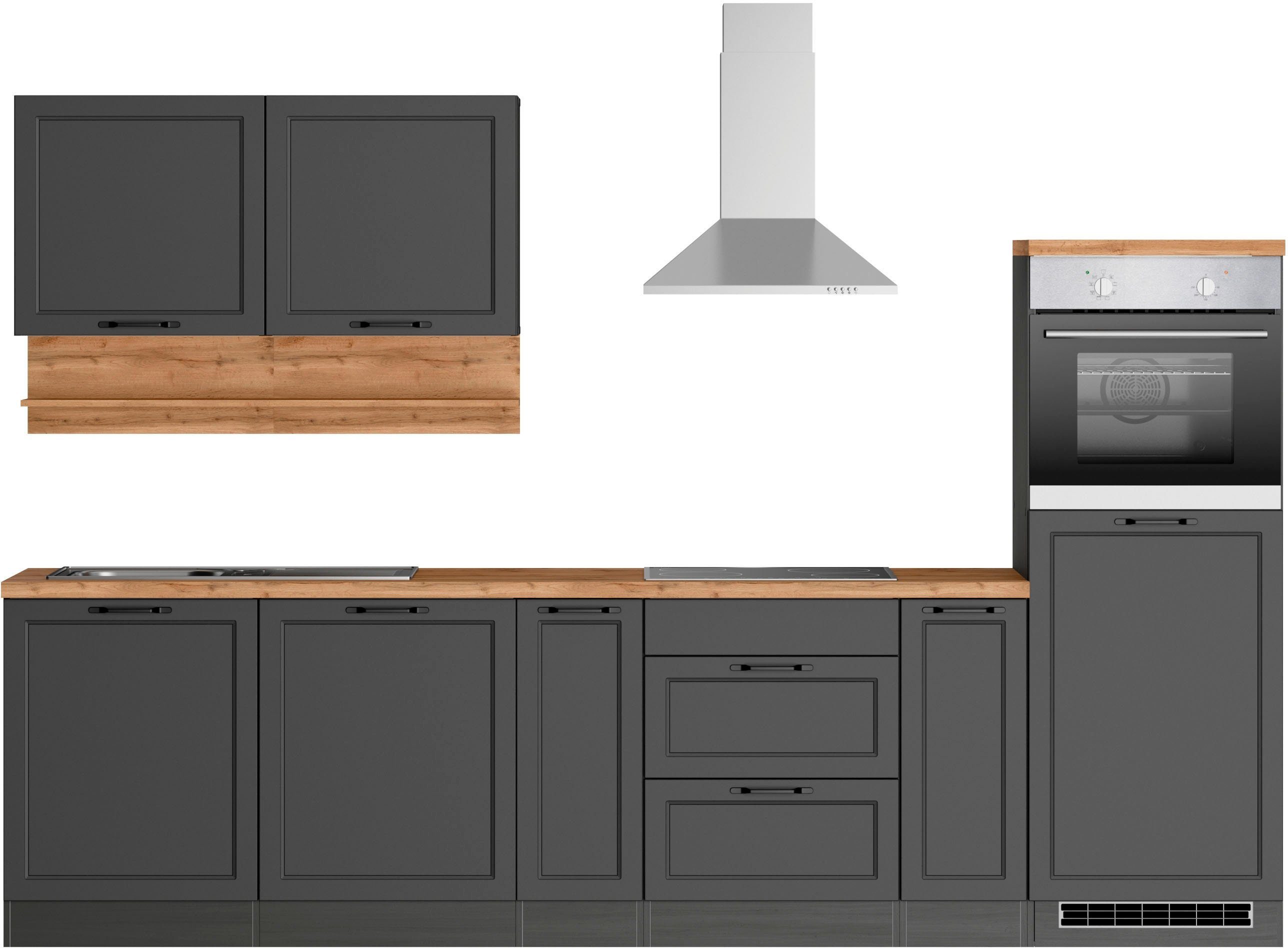 Ausstattung | Durchgehende Arbeitsplatte Einlegeböden höhenverstellbar Laufleisten der Schubkästen aus Metall Metallgriffe inkl. Edelstahl-Auflagespüle, mit Abtropffläche ohne E-Geräte |