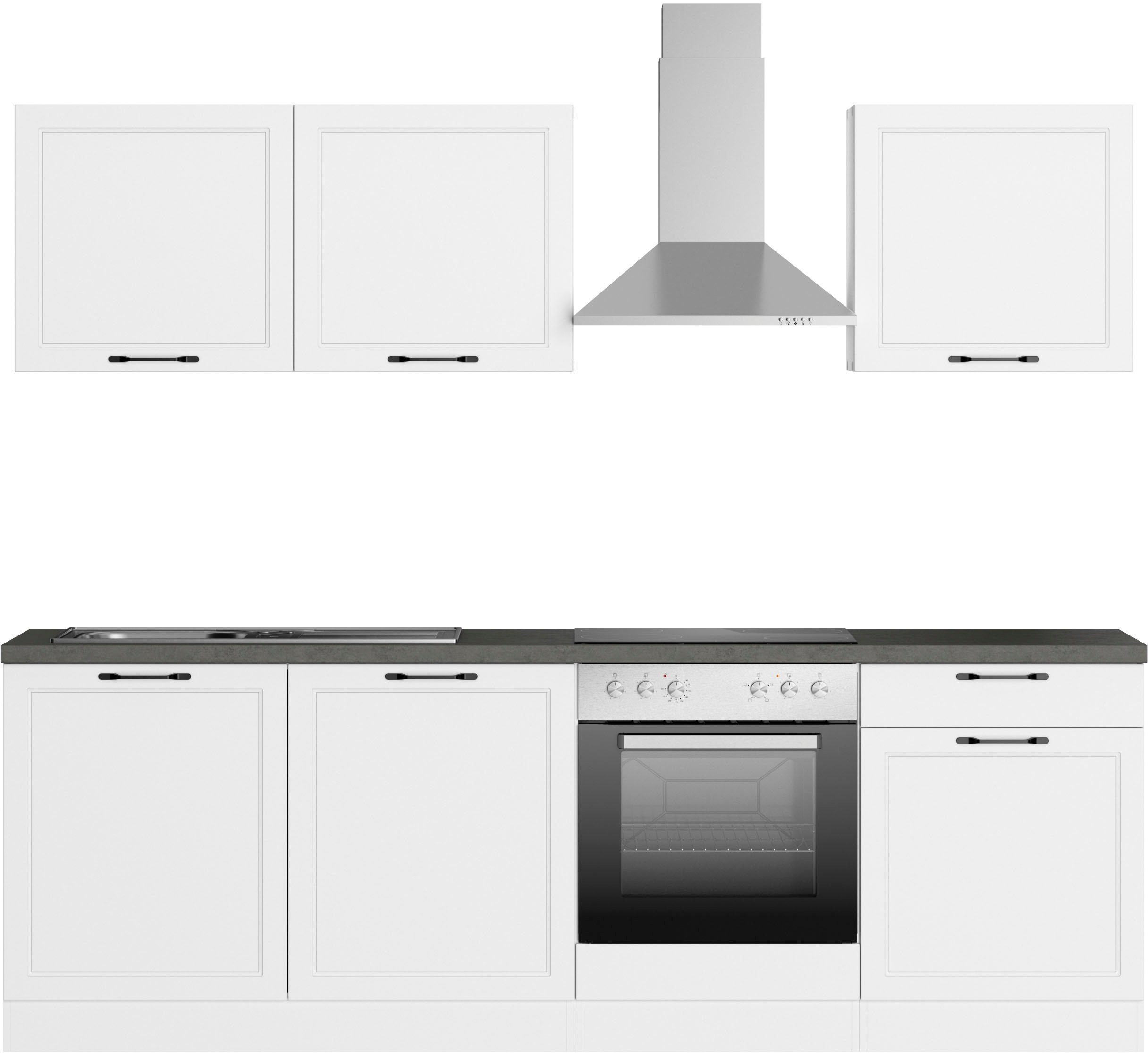 Ausstattung | Durchgehende Arbeitsplatte Metallgriffe Seitenverkehrt stellbar Stabile Metallauszüge inkl. Edelstahl-Einbauspüle, mit Abtropffläche |