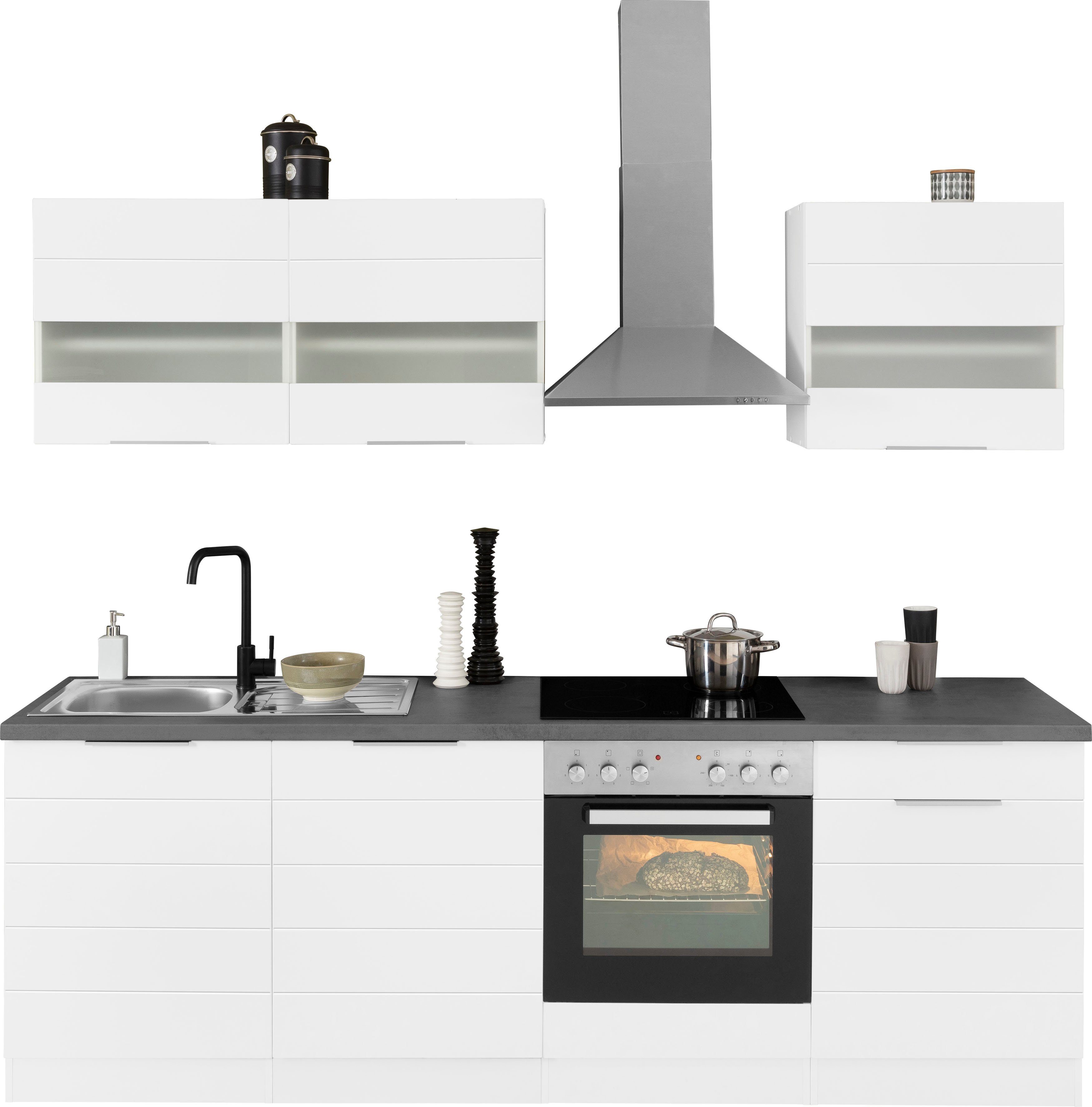 Ausstattung | Durchgehende Arbeitsplatte Einlegeböden höhenverstellbar Griffleiste Metallgriffe Seitenverkehrt stellbar Türen wahlweise rechts/links montierbar inkl. Edelstahl-Einbauspüle, mit Abtropffläche ohne E-Geräte |