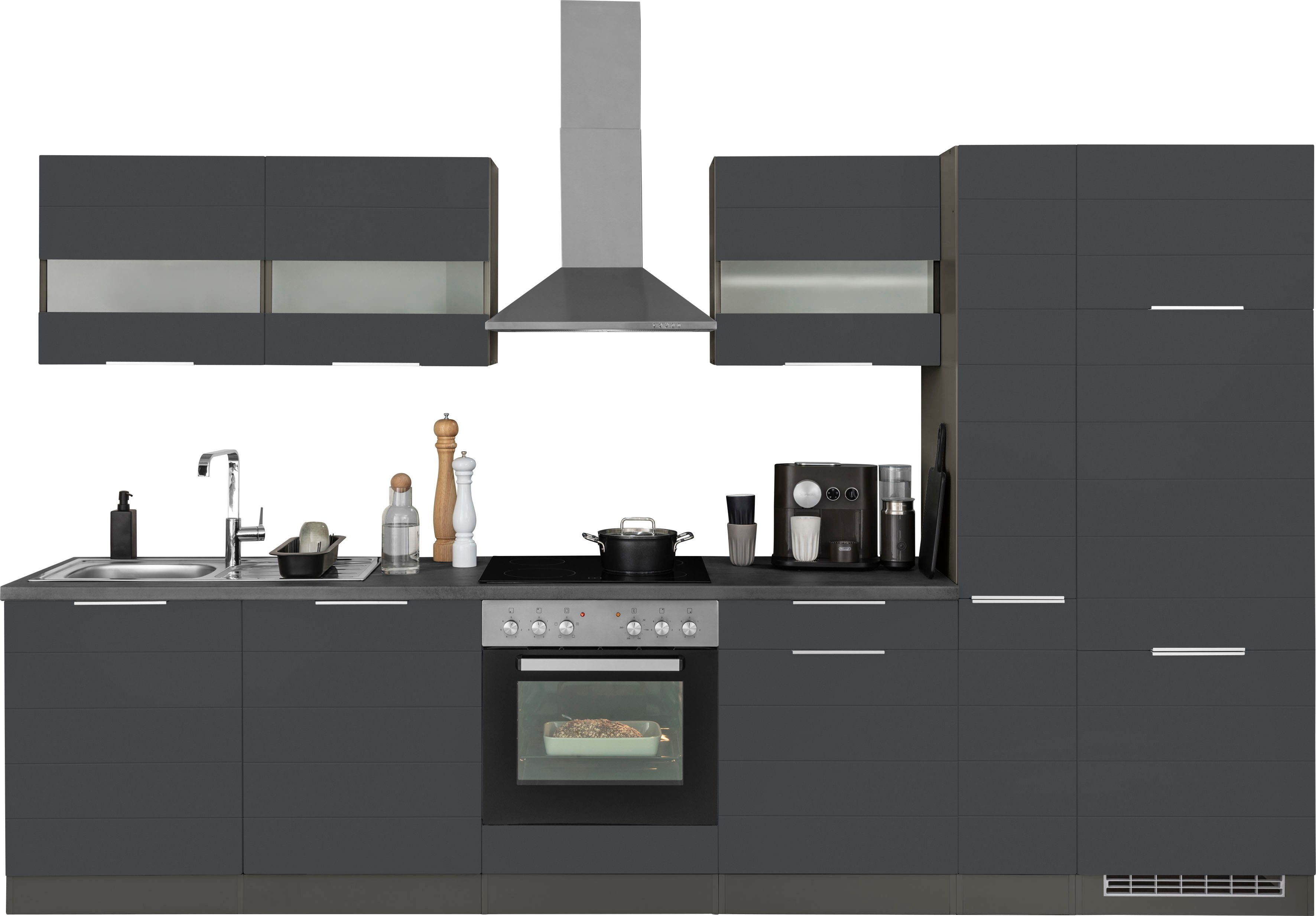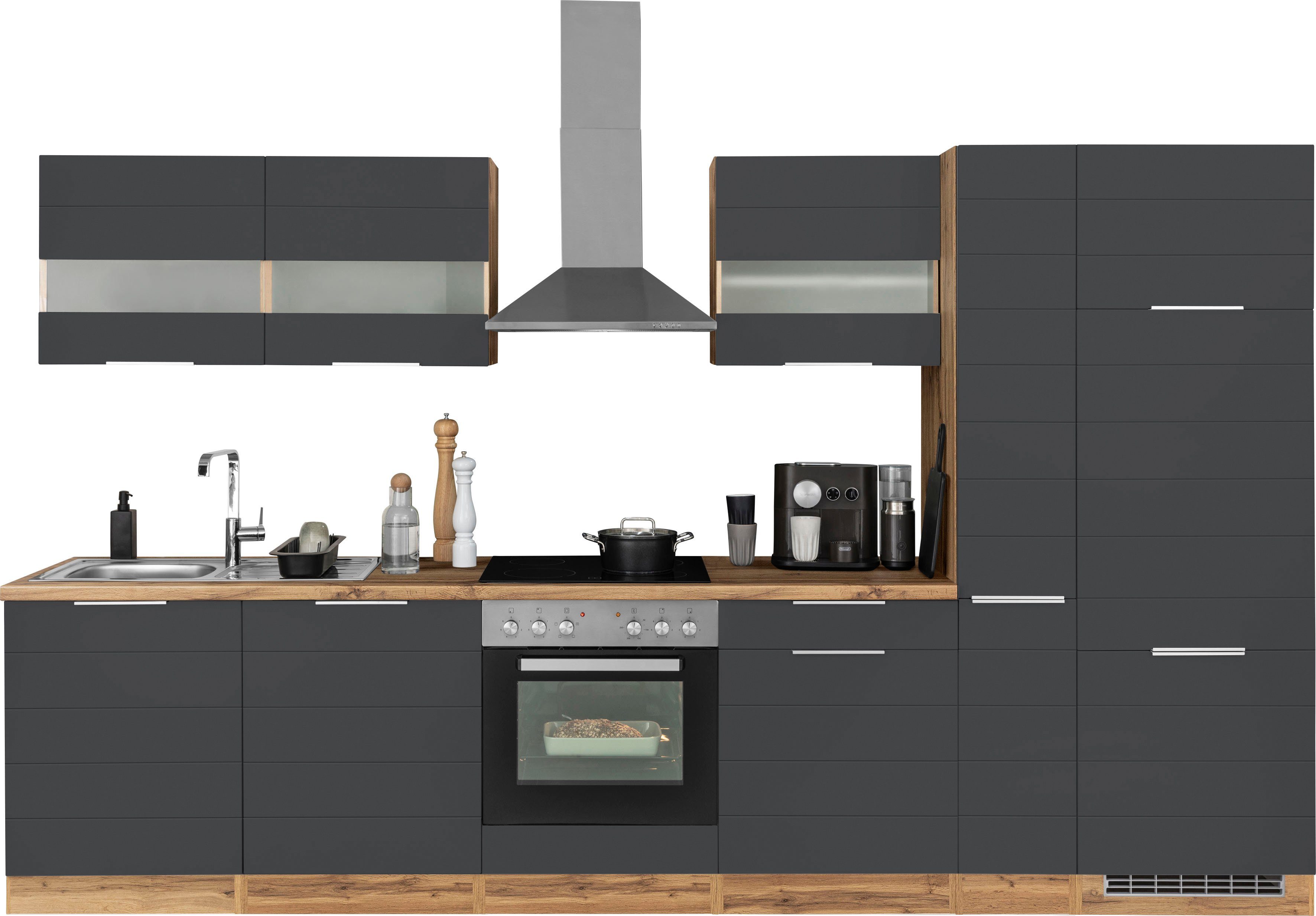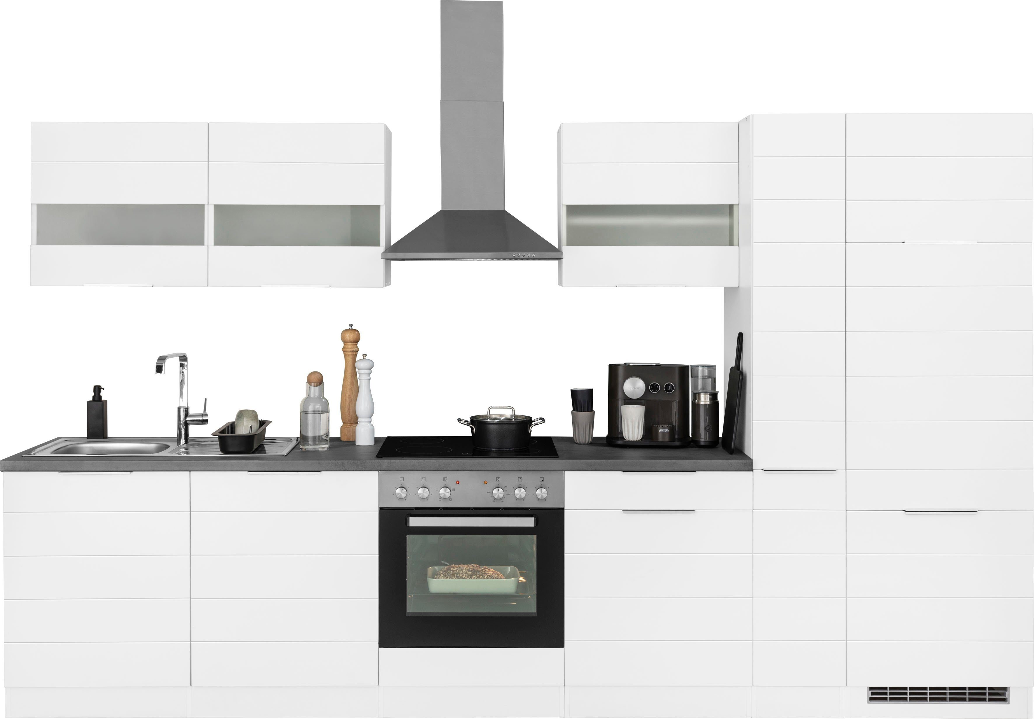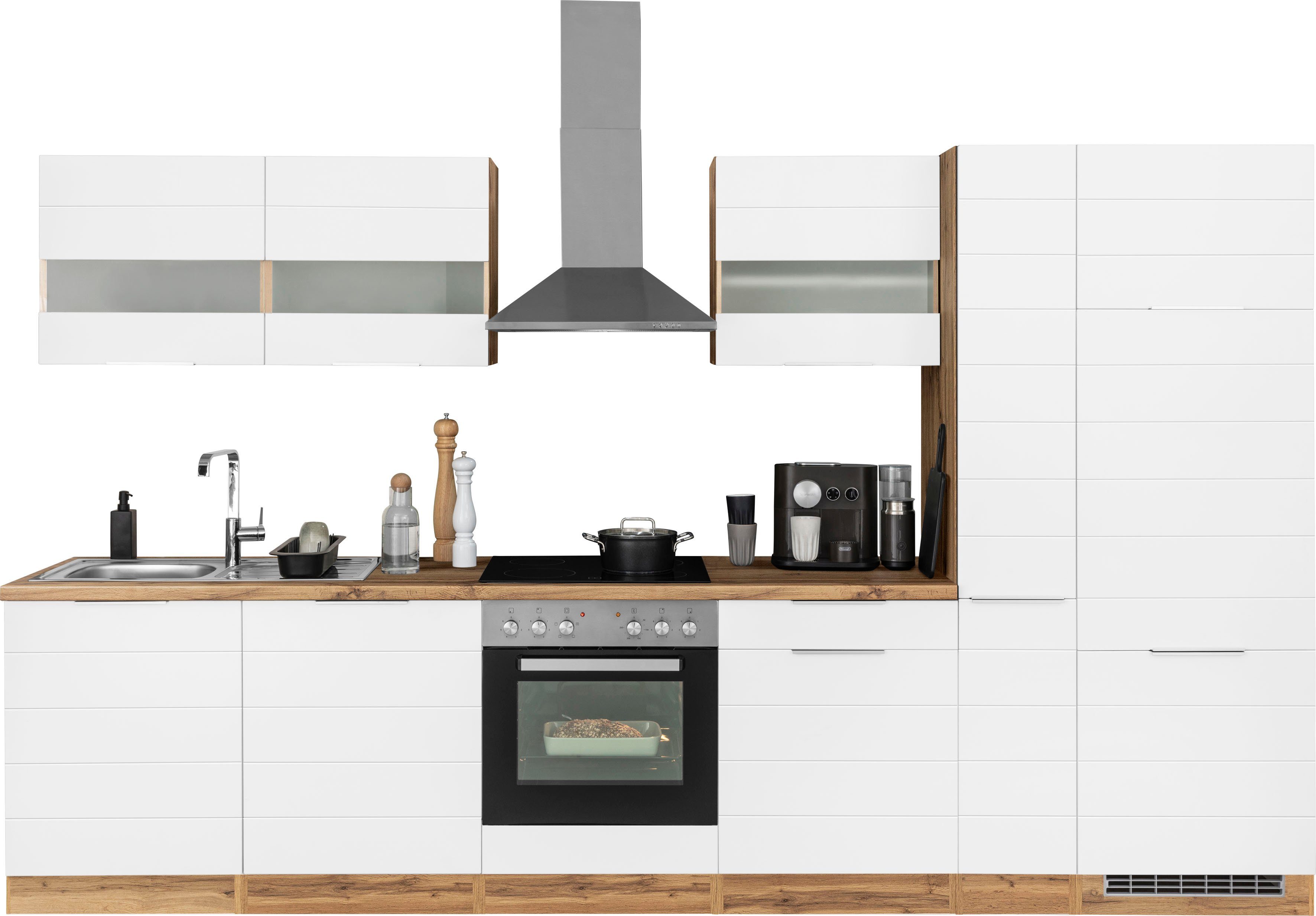 Ausstattung | Durchgehende Arbeitsplatte Einlegeböden höhenverstellbar Griffleiste Metallgriffe Seitenverkehrt stellbar Türen wahlweise rechts/links montierbar inkl. Edelstahl-Einbauspüle, mit Abtropffläche ohne E-Geräte |