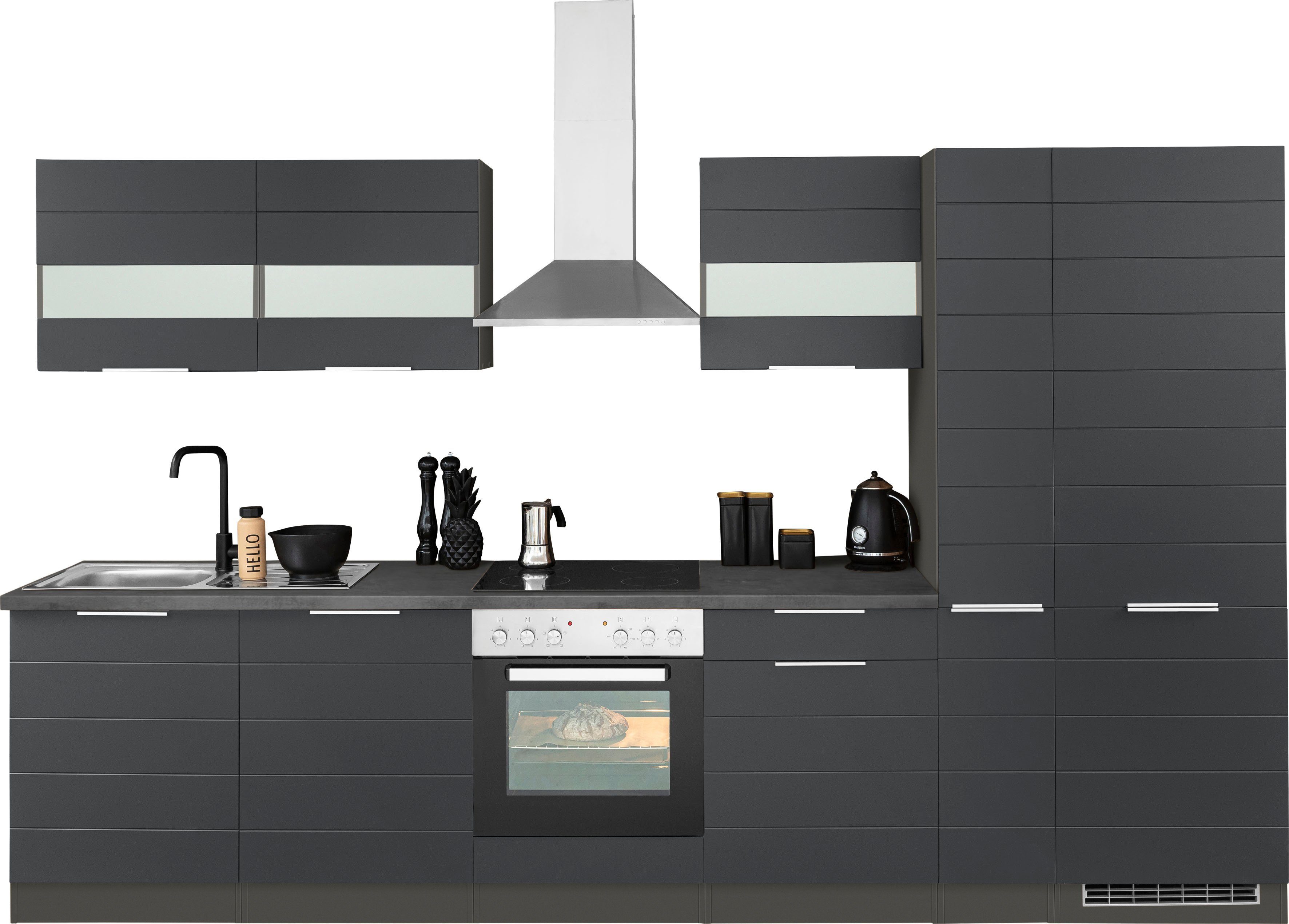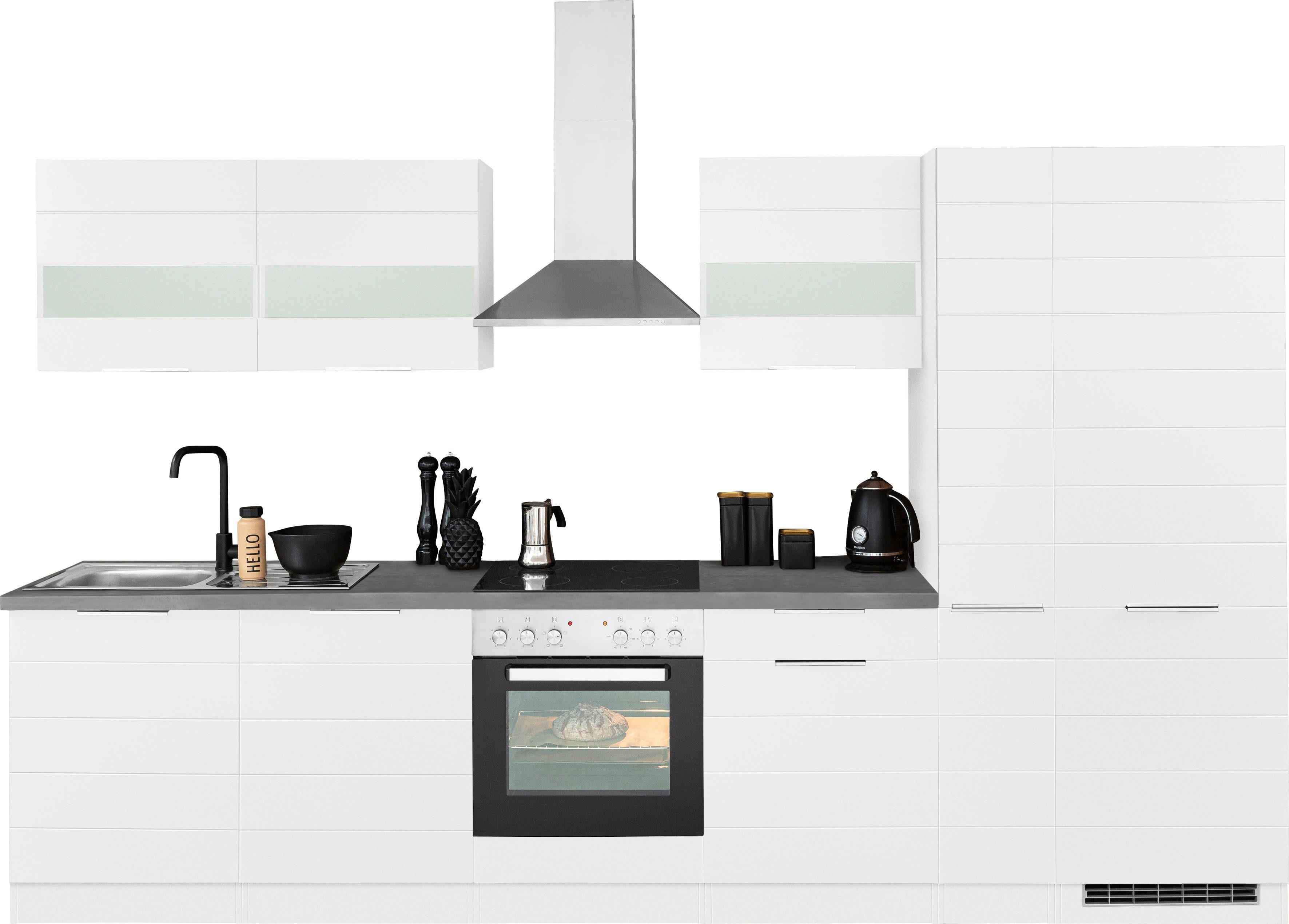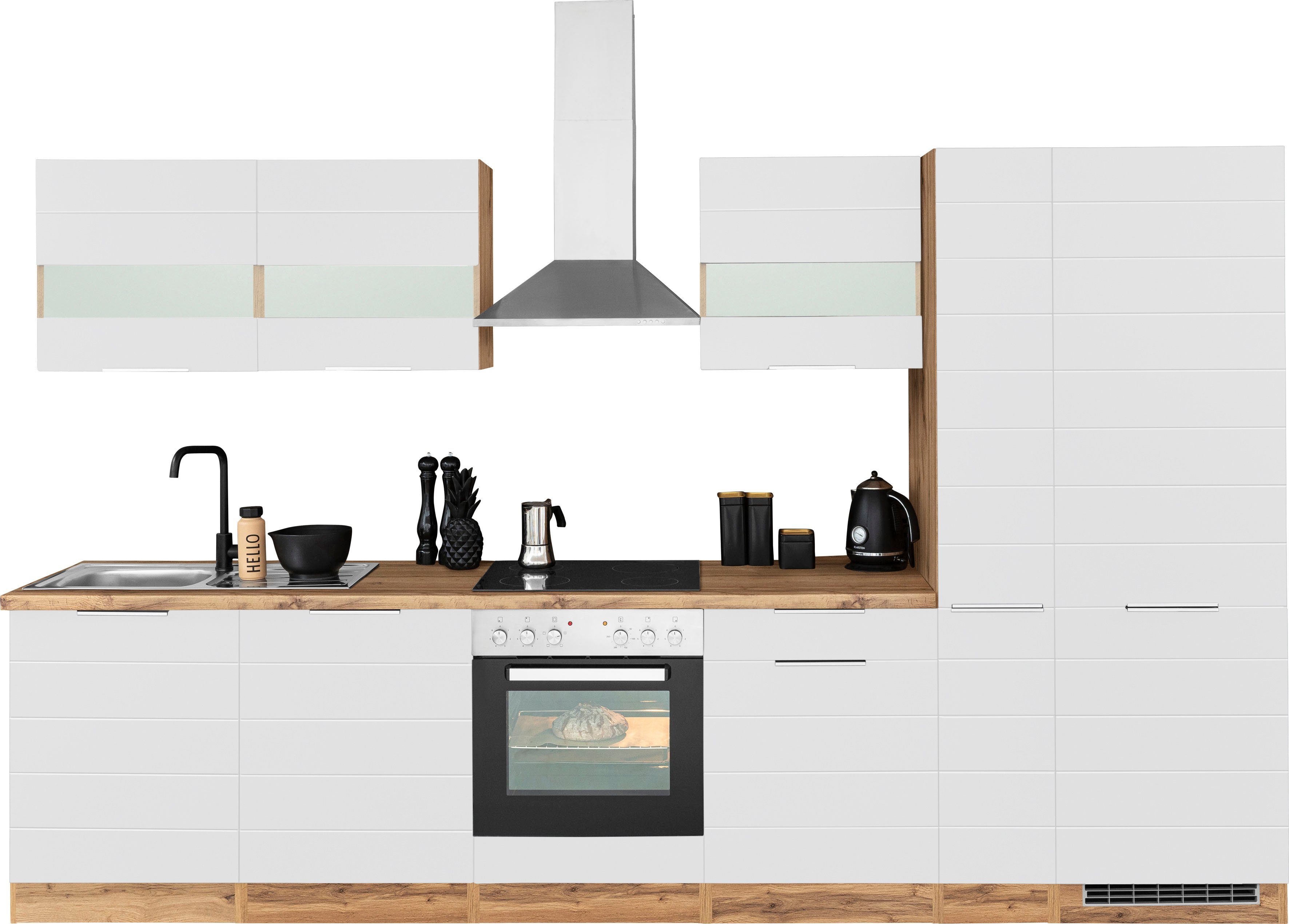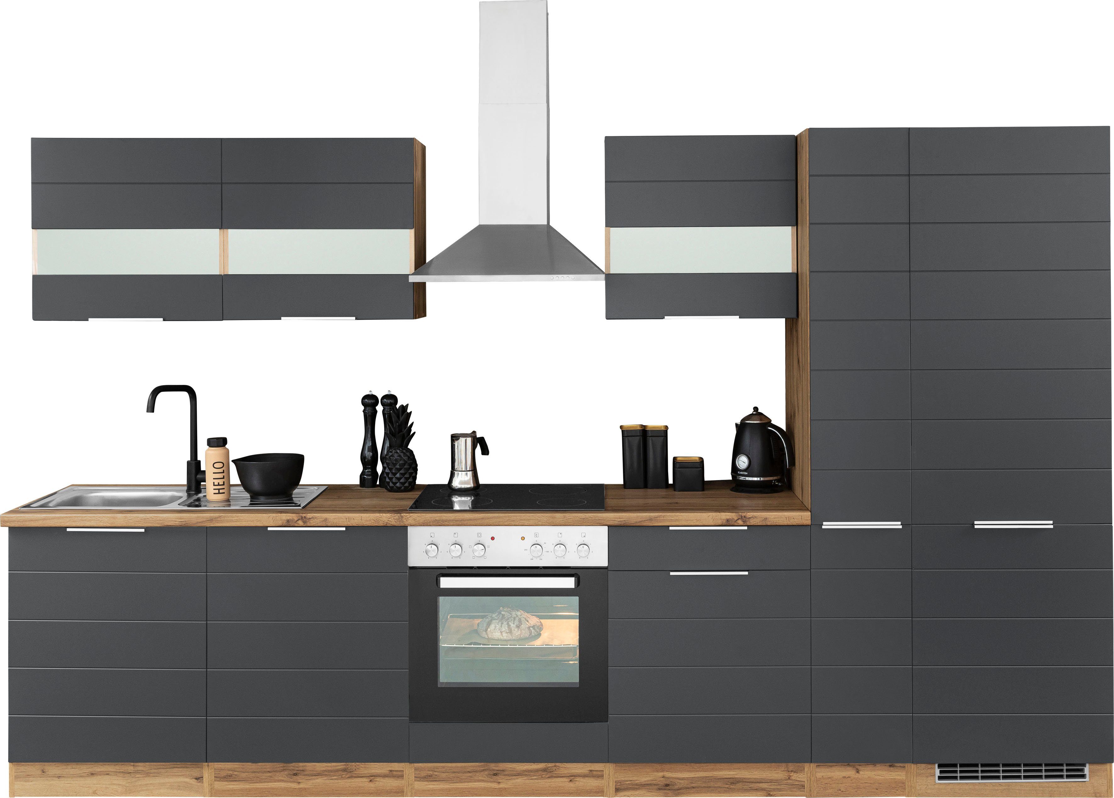 Ausstattung | Durchgehende Arbeitsplatte Einlegeböden höhenverstellbar Griffleiste Metallgriffe Seitenverkehrt stellbar Türen wahlweise rechts/links montierbar inkl. Edelstahl-Einbauspüle, mit Abtropffläche ohne E-Geräte |