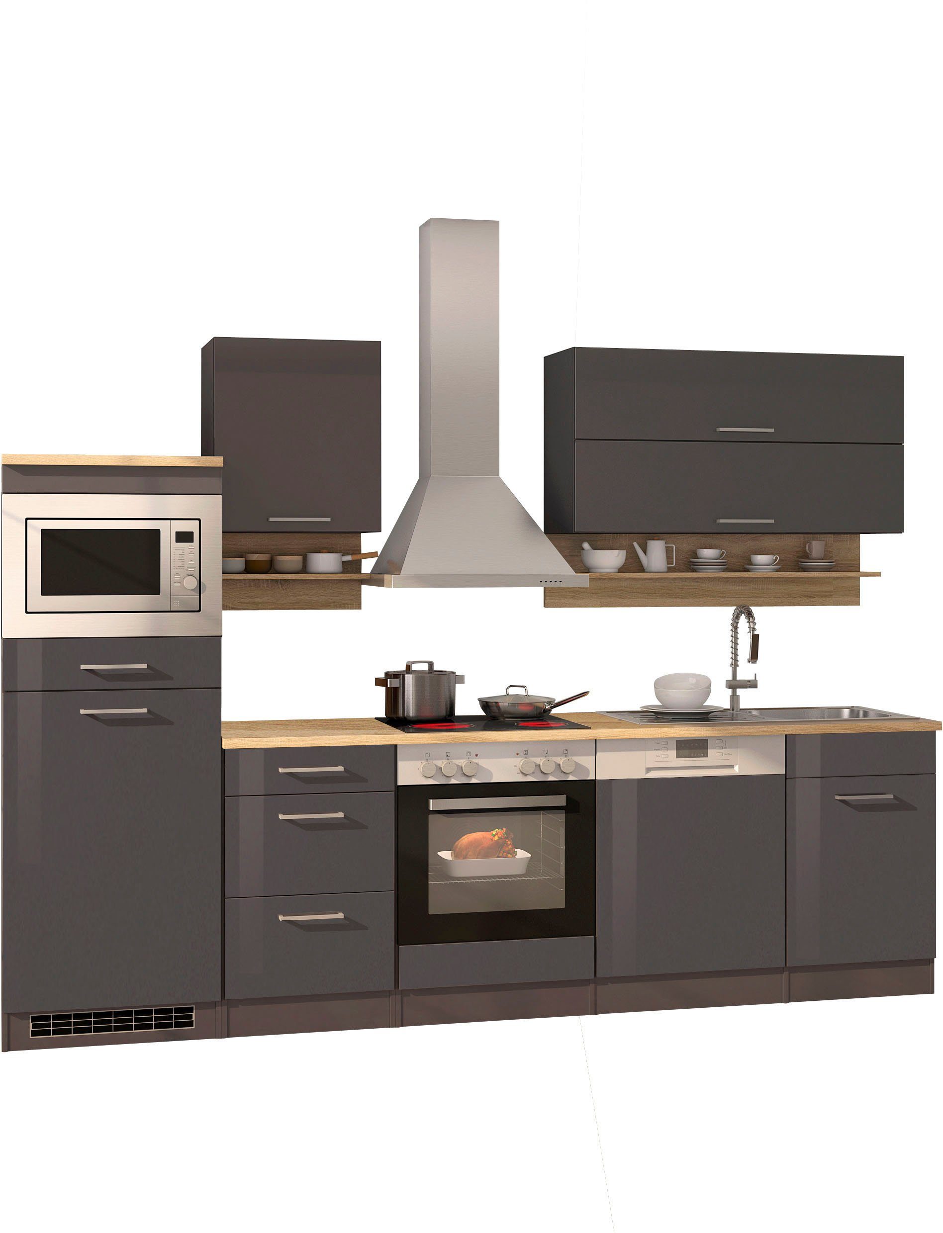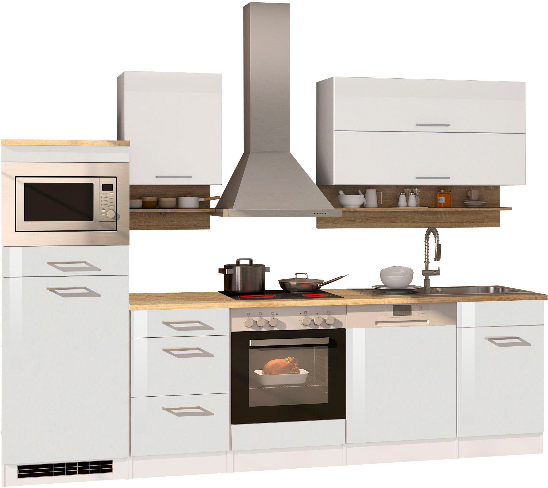 Set beinhaltet | Produktdetails Set bestehend aus: Hängeschrank, Regal, Auszugsschrank, Herdumbauschrank, Spülenschrank, Arbeitsplatte, Spüle, Herd, Kühlschrank, Geschirrspüler, Backofen Gesamtbreite: 280 cm Frontmaterial: MDF Frontstruktur: hochglänzend Korpusmaterial: melaminbeschichtete Spanplatte Griffe: chromglänzend Sockelhöhe: 11 cm, Sockel nicht verstellbar Setdetails Hängeschrank Art: Hängeschrank Maße (B/T/H): 50/34/57 cm Türanschlag: wechselbar Hängeschrank Art: Hängeschrank Maße (B/T/H): 110/34/57 cm Auszugsschrank Maße (B/T/H): 50/60/82 cm Material: Holzwerkstoff Spülenschrank Spüle: Edelstahlspüle Maße (B/T/H): 110/60/82 cm Herdumbauschrank Maße (B/T/H): 60/60/82 cm Fachmaß Herd (B/T/H): 59/56/59 cm Umbauschrank für Ofen und Kühlschrank Einbau-Fachmaß Kühlschrank (B/T/H): 59/56/88 cm Einbau-Fachmaß Ofen (B/T/H): 59/56/44 cm Zusatzinformationen: Mikrowellen-Midischrank Türanschlag: wechselbar Maße (B/T/H): 60/60/165 cm Regal Anzahl Einlegeböden: 1 Maße (B/T/H): 50/16/16 cm Regal Maße (B/T/H): 100/16/16 cm Arbeitsplatte Maße (L/B/H): 220/60/3 cm Material: Holzwerkstoff Arbeitsplattendekor: eichefarben |