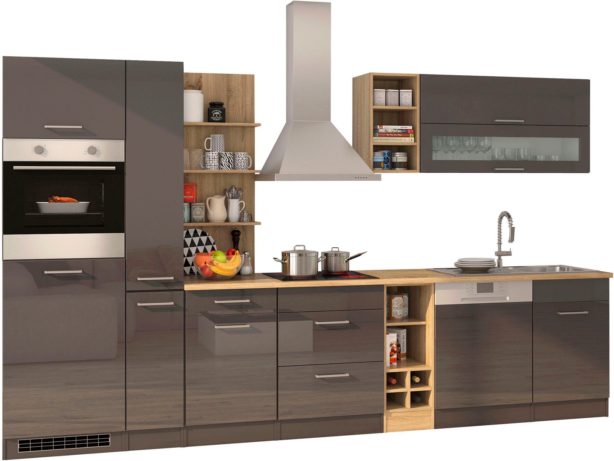 Set beinhaltet | Produktdetails Set bestehend aus: Umbauschrank für Ofen und Kühlschrank, Unterschrank, Kochfeldunterschrank, Spüle, Apothekerschrank, Arbeitsplatte, Dunstabzugshaube, Kochfeld, Backofen, Kühlschrank, Geschirrspüler Gesamtbreite: 340 cm Türanschlag: beliebig Frontmaterial: MDF, Struktur: hochglänzend Korpusmaterial: melaminbeschichtete Spanplatte Griffe: chromglänzend Sockelhöhe: 11 cm, nicht verstellbar Füße nicht höhenverstellbar Setdetails Hängeschrank Art: Glasrahmen-Klapphängeschrank Anzahl Klappen: 2 Maße (B/T/H): 110/34/57 cm Unterschrank Material: Holzwerkstoff Frontdekor: glänzend Korpusdekor: matt Maße (B/T/H): 60/60/82 cm Türanschlag: wechselbar Anzahl Türen: 1 Anzahl Schubladen: 1 Schubkasteninnenmaß (B/T/H): 41/39/11 cm Anzahl Einlegeböden: 1 Kochfeldunterschrank Maße (B/T/H): 60/60/82 cm Anzahl Auszüge: 2 Auszugsinnenmaß (B/T/H): 51/39/25 cm Apothekerschrank Maße (B/T/H): 30/60/200 cm Anzahl Fächer: 5 Anzahl Auszüge: 2 Material Zarge: Metall Spülenschrank Maße (B/T/H): 110/60/82 cm Anzahl Türen: 1 Spülenmaße: 86/43/14 cm Umbauschrank für Ofen und Kühlschrank Maße (B/T/H): 60/60/200 cm Einbau-Fachmaß Kühlschrank (B/T/H): 59/56/88 cm Einbau-Fachmaß Ofen (B/T/H): 59/56/59 cm Mit Arbeitsplatte: Nein Anzahl Türen: 2 Türanschlag: wechselbar Regal Maße (B/T/H): 50/17/115 cm Korpusdekor: eichefarben Anzahl Einlegeböden: 3 Arbeitsplatte Maße (L/B/H): 250/60/3 cm Material: Holzwerkstoff Arbeitsplattendekor: eichefarben |