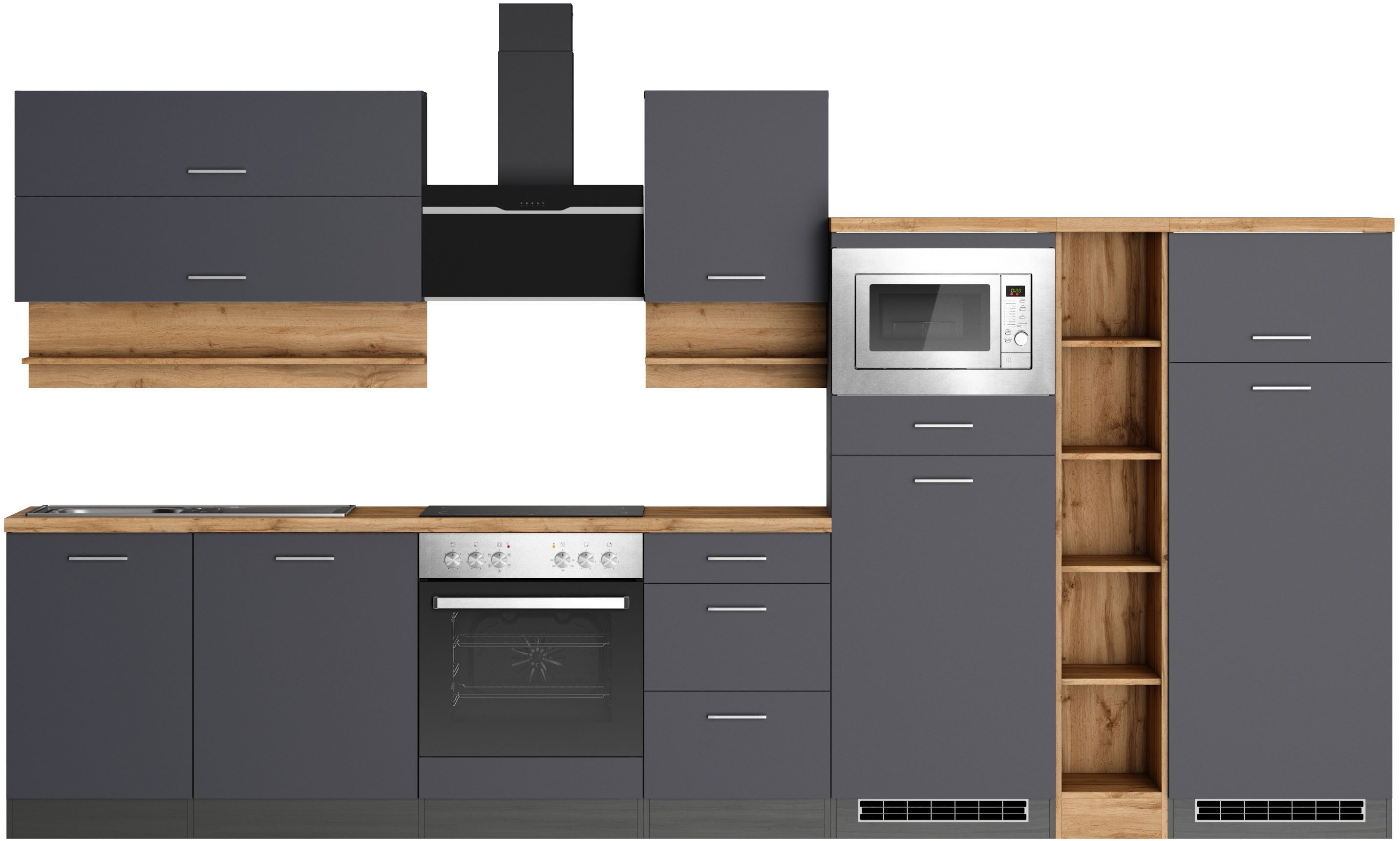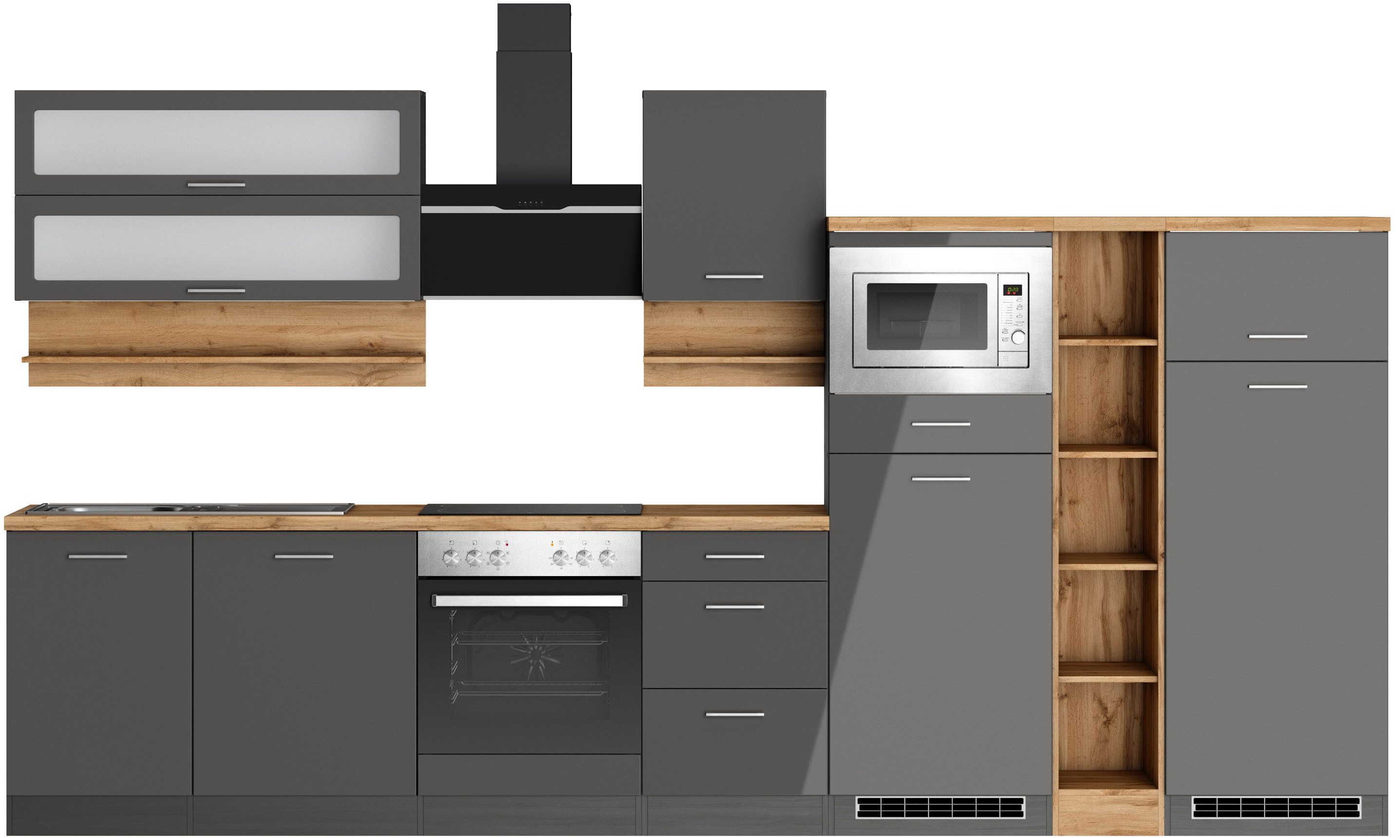 Ausstattung | Durchgehende Arbeitsplatte Einlegeböden höhenverstellbar Laufleisten der Schubkästen aus Metall Stellschrauben in den Unterschränken als Montagehilfe zum Ausgleichen von Unebenheiten: 0-4 cm inkl. Edelstahl-Auflagespüle, mit Abtropffläche ohne E-Geräte |