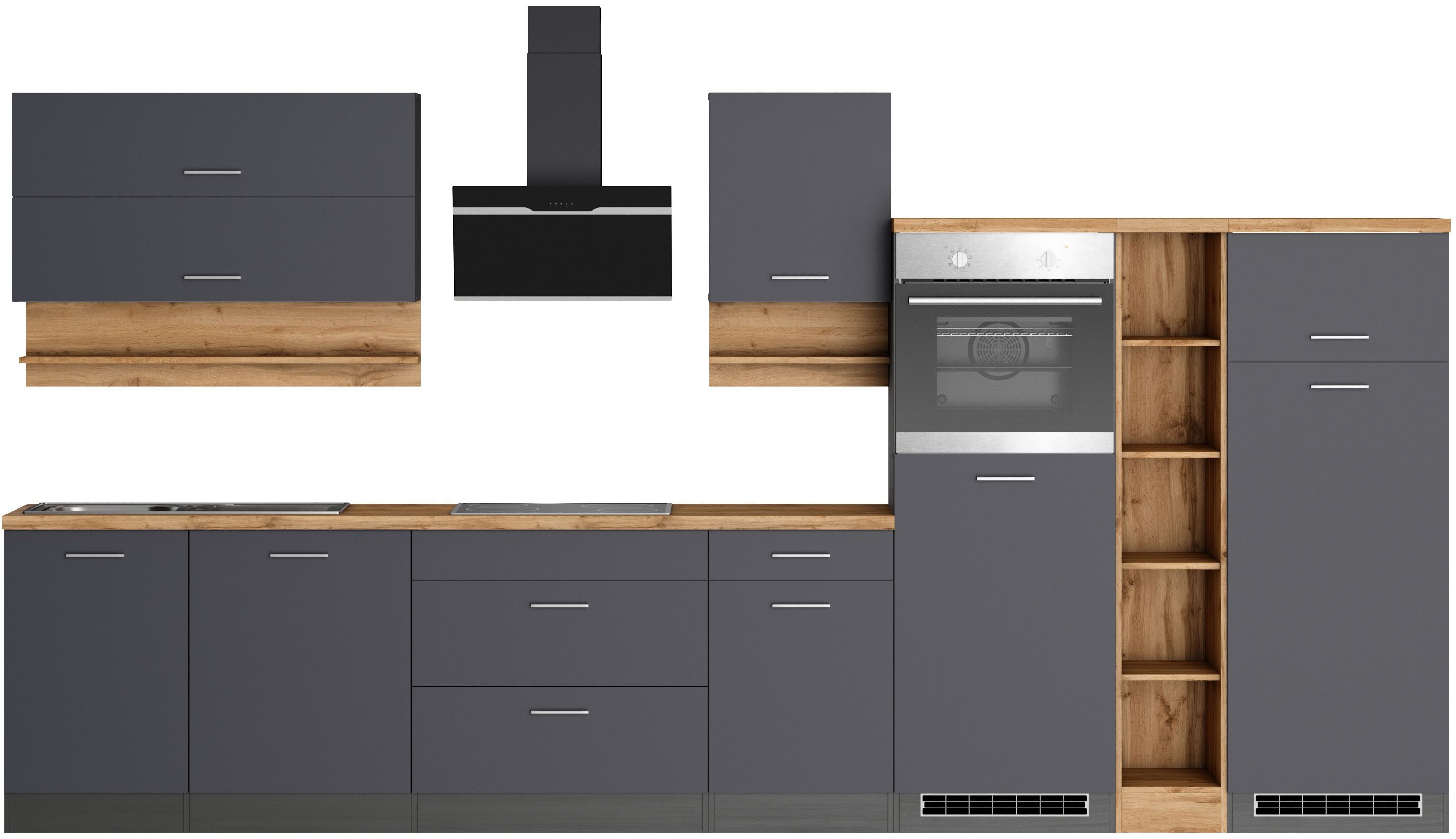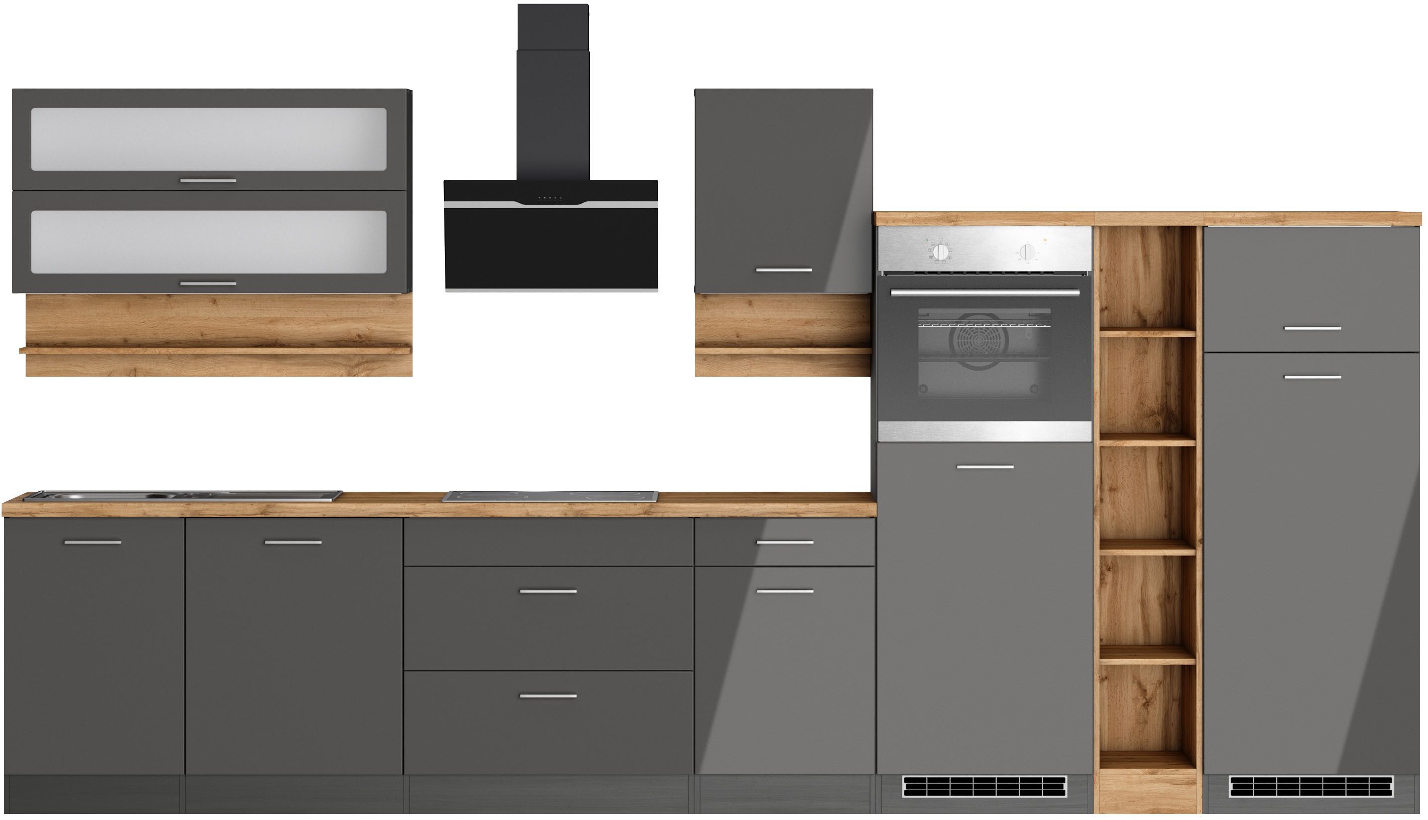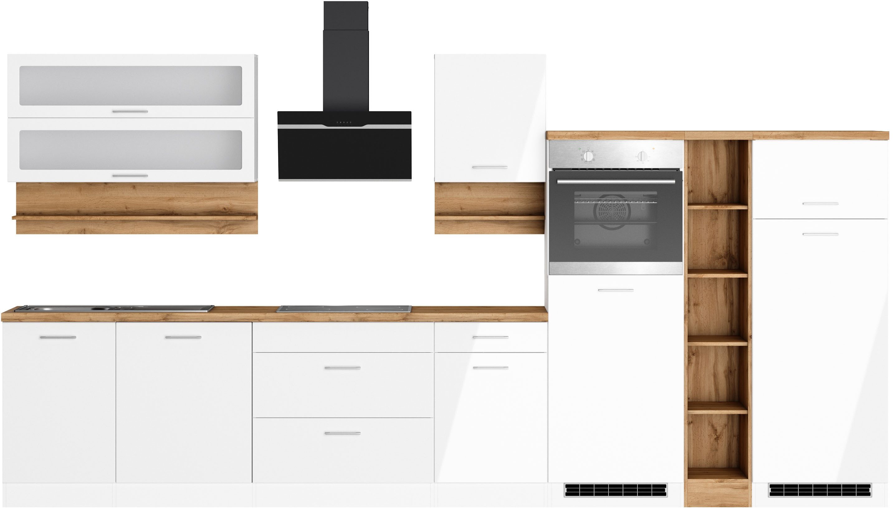 Ausstattung | Durchgehende Arbeitsplatte Einlegeböden höhenverstellbar Laufleisten der Schubkästen aus Metall Stellschrauben in den Unterschränken als Montagehilfe zum Ausgleichen von Unebenheiten: 0-4 cm inkl. Edelstahl-Auflagespüle, mit Abtropffläche ohne E-Geräte |