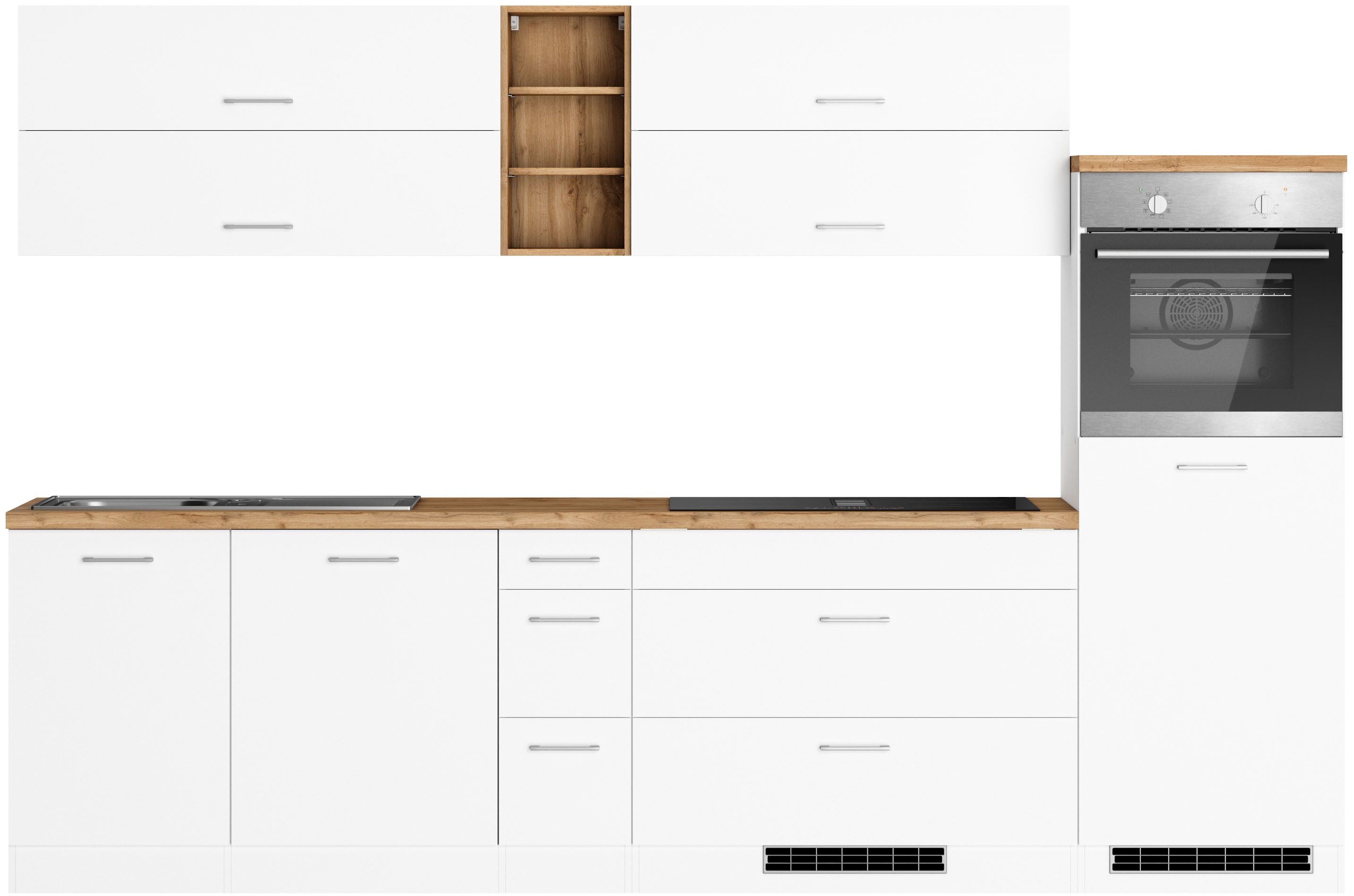 Ausstattung | Durchgehende Arbeitsplatte Seitenverkehrt stellbar Stabile Metallauszüge Stellschrauben in den Unterschränken als Montagehilfe zum Ausgleichen von Unebenheiten: 0-4 cm inkl. Edelstahl-Auflagespüle, mit Abtropffläche |
