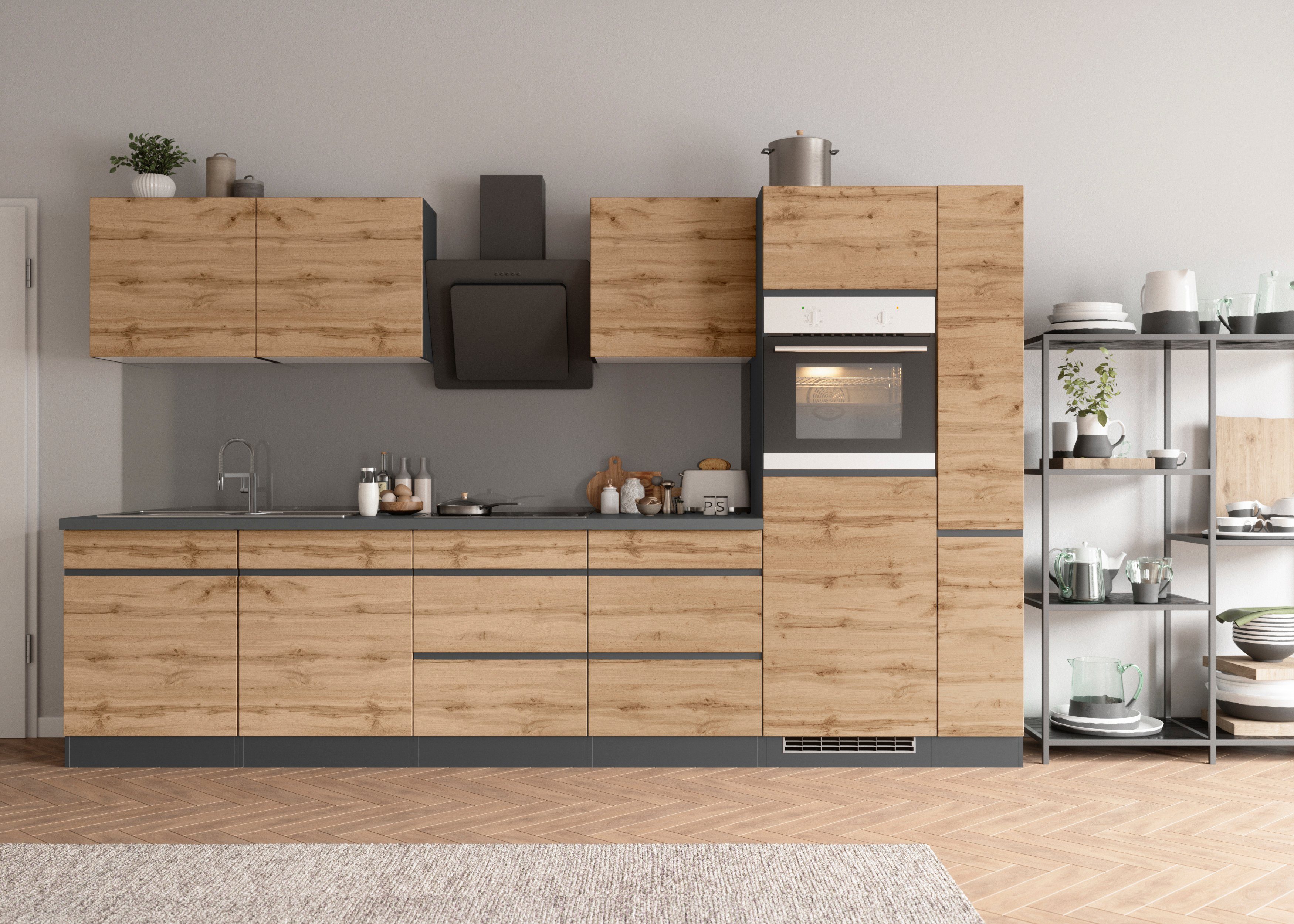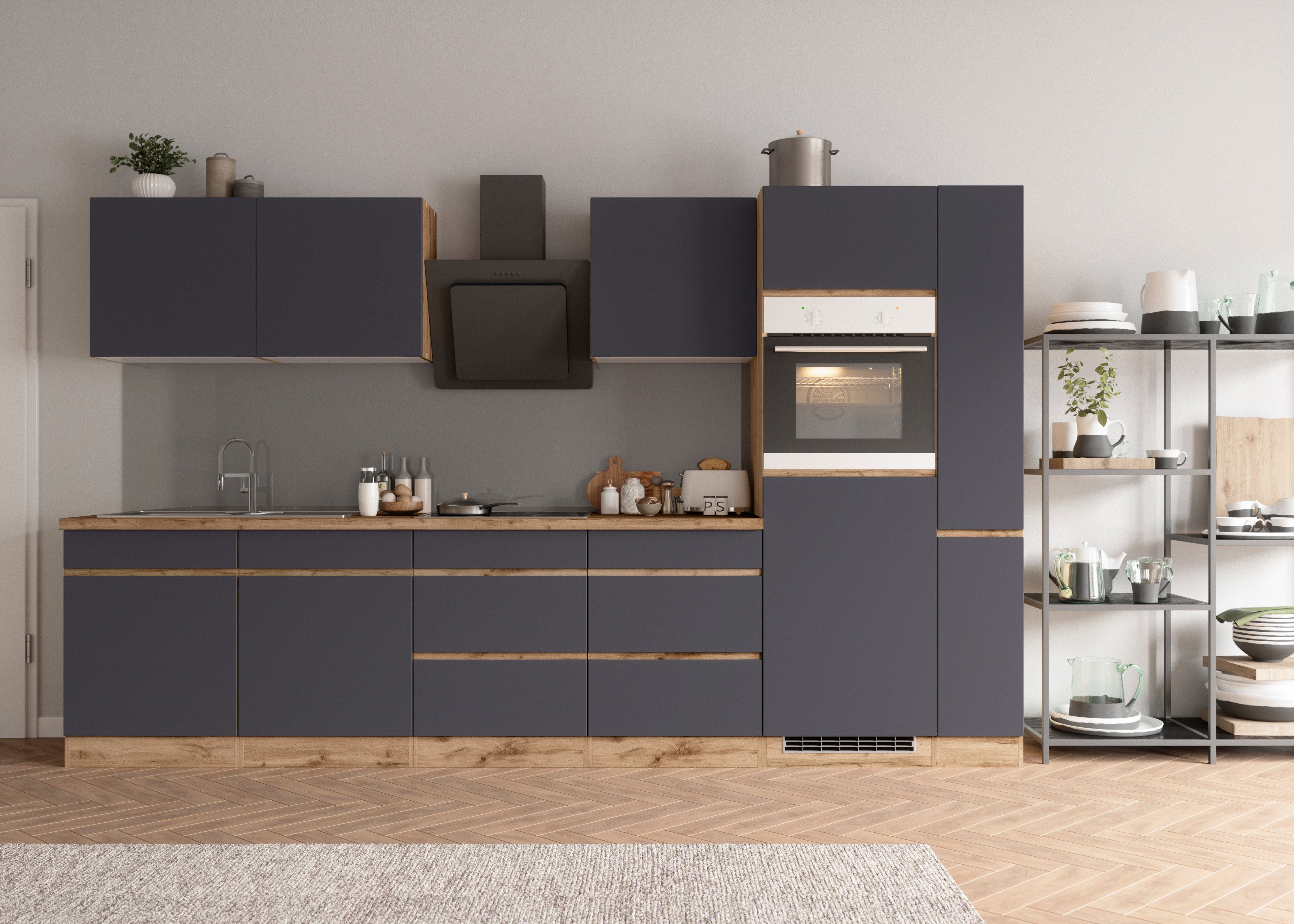 Ausstattung | Durchgehende Arbeitsplatte Einlegeböden höhenverstellbar Seitenverkehrt stellbar Sockelhöhe nicht verstellbar Stellschrauben in den Unterschränken als Montagehilfe zum Ausgleichen von Unebenheiten: 0-4 cm Türen wahlweise rechts/links montierbar inkl. Edelstahl-Auflagespüle, mit Abtropffläche mit E-Geräten weitere Informationen zu Elektrogeräten: siehe Спецификации товара (на немецком) |
