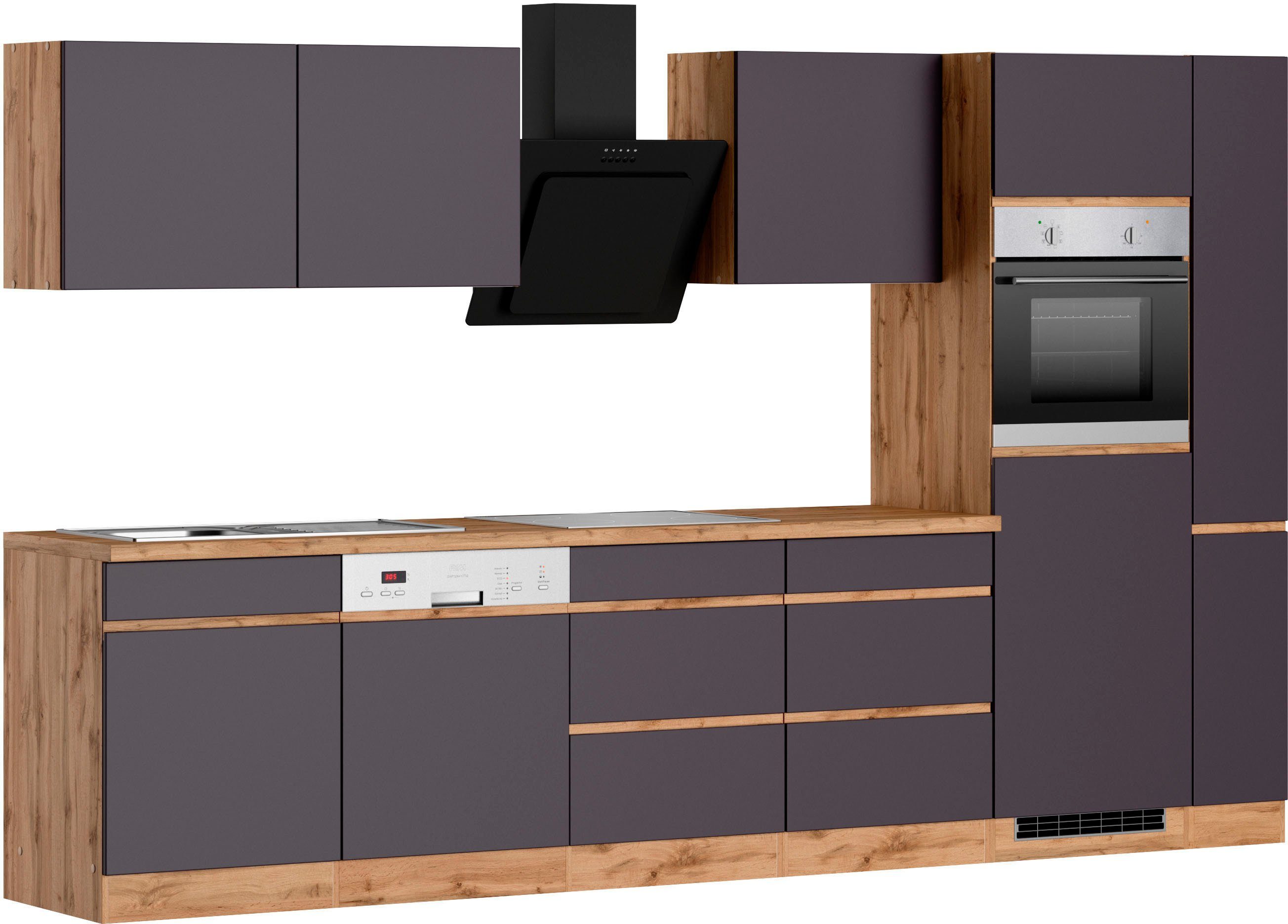 Ausstattung | Durchgehende Arbeitsplatte Einlegeböden höhenverstellbar Seitenverkehrt stellbar Sockelhöhe nicht verstellbar Stellschrauben in den Unterschränken als Montagehilfe zum Ausgleichen von Unebenheiten: 0-4 cm Türen wahlweise rechts/links montierbar inkl. Edelstahl-Auflagespüle, mit Abtropffläche mit E-Geräten weitere Informationen zu Elektrogeräten: siehe Спецификации товара (на немецком) |