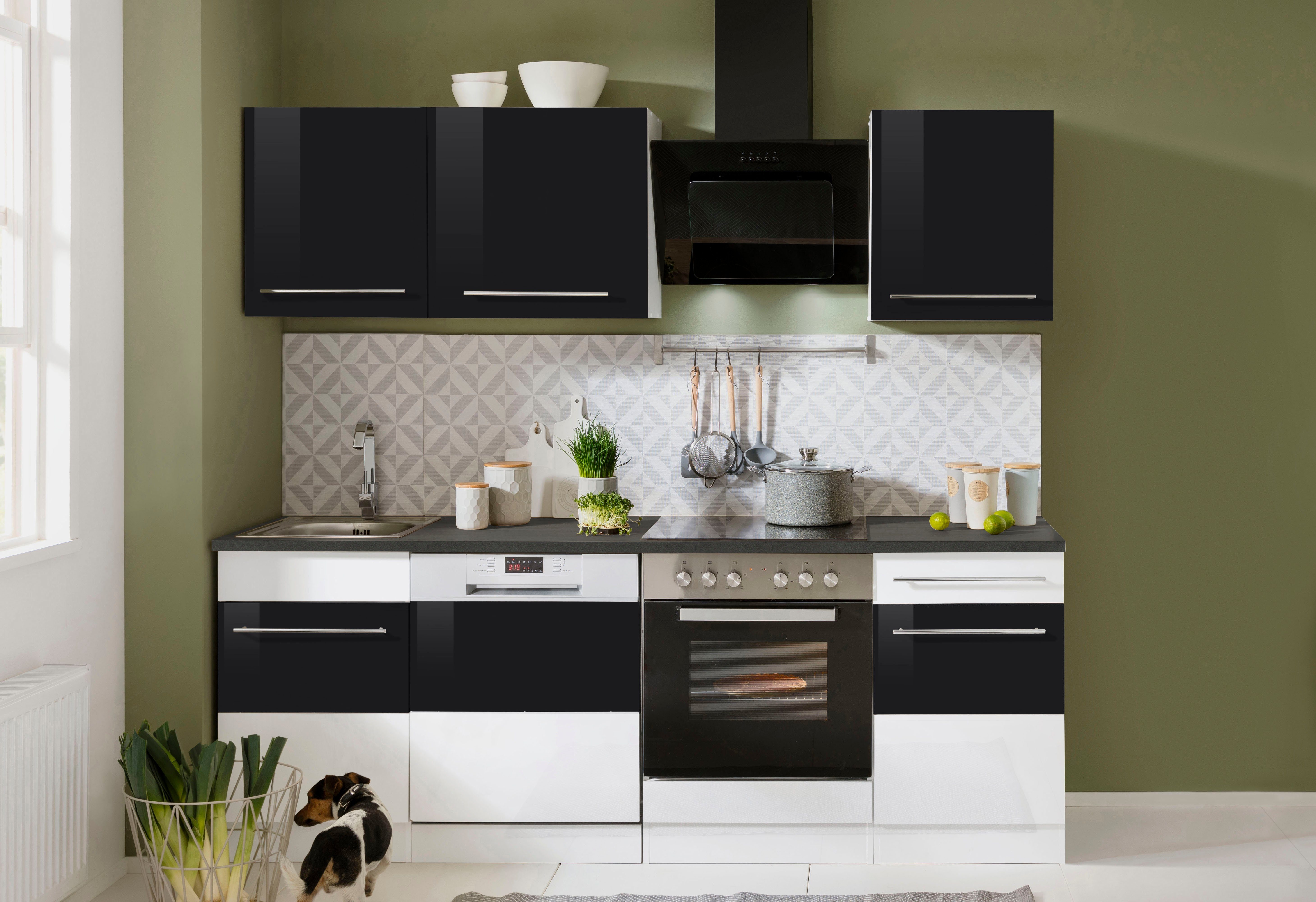 Ausstattung | Durchgehende Arbeitsplatte Einlegeböden der Hängeschränke höhenverstellbar Griffe glänzend verchromt inkl. Edelstahl-Auflagespüle, mit Abtropffläche |