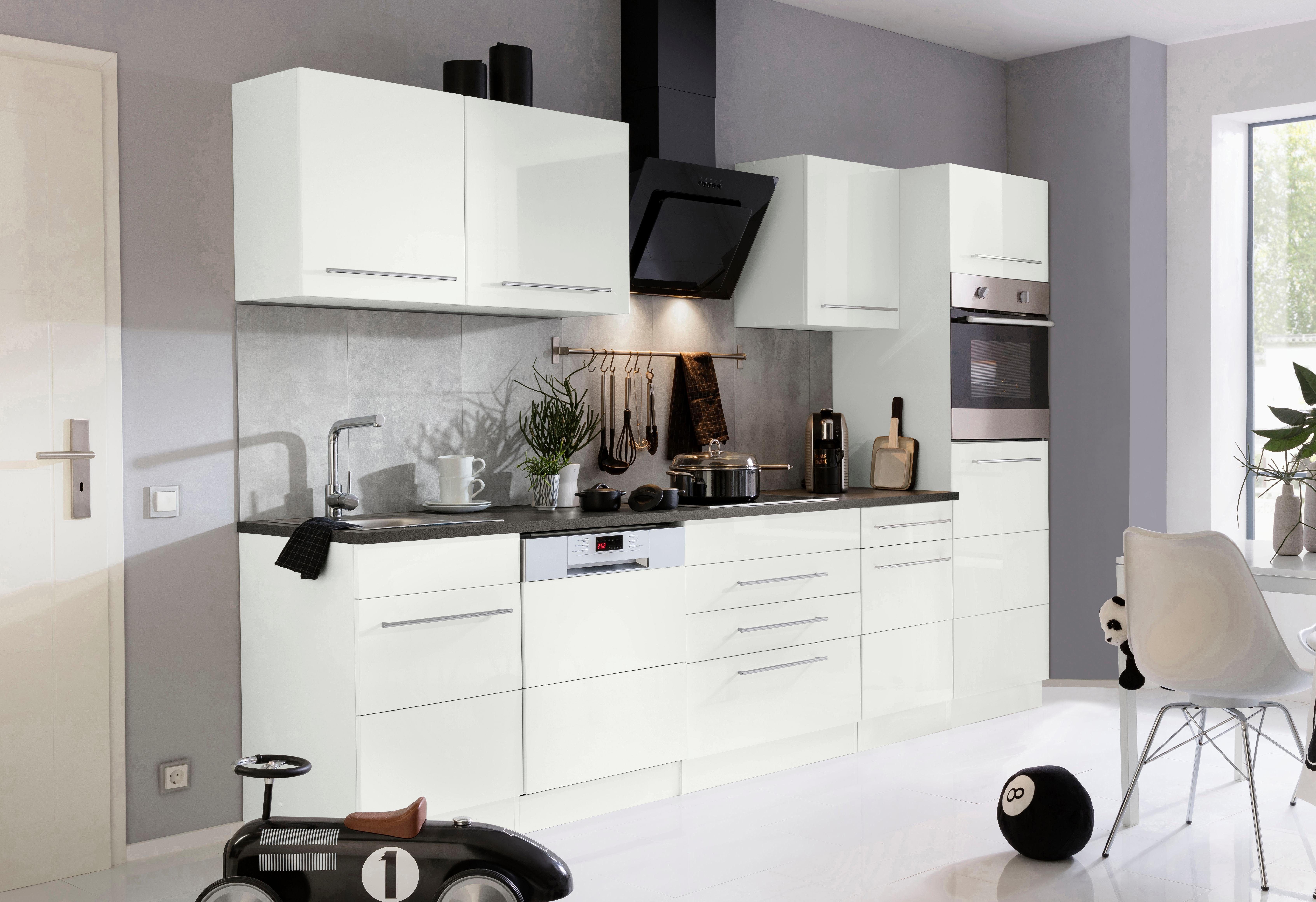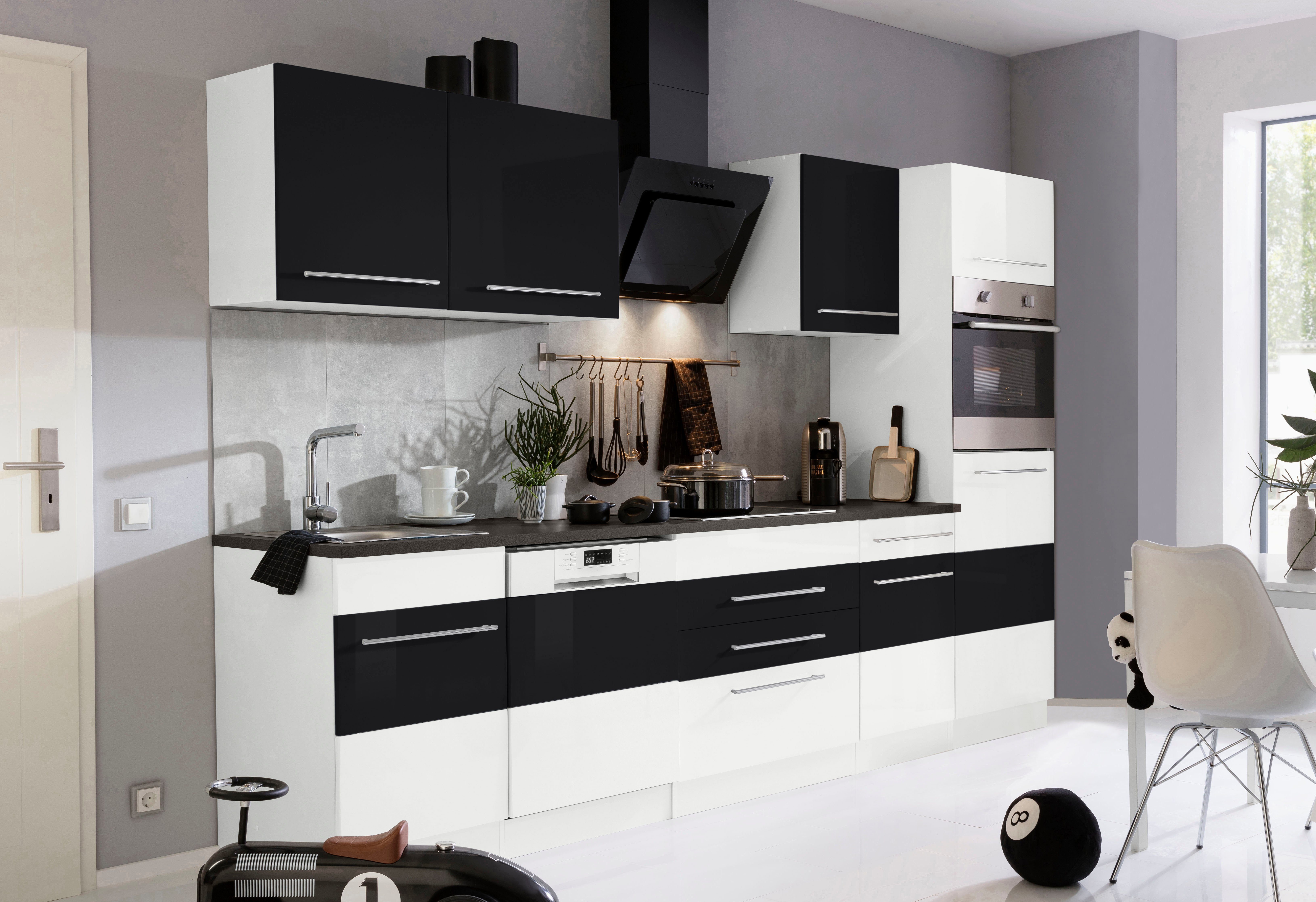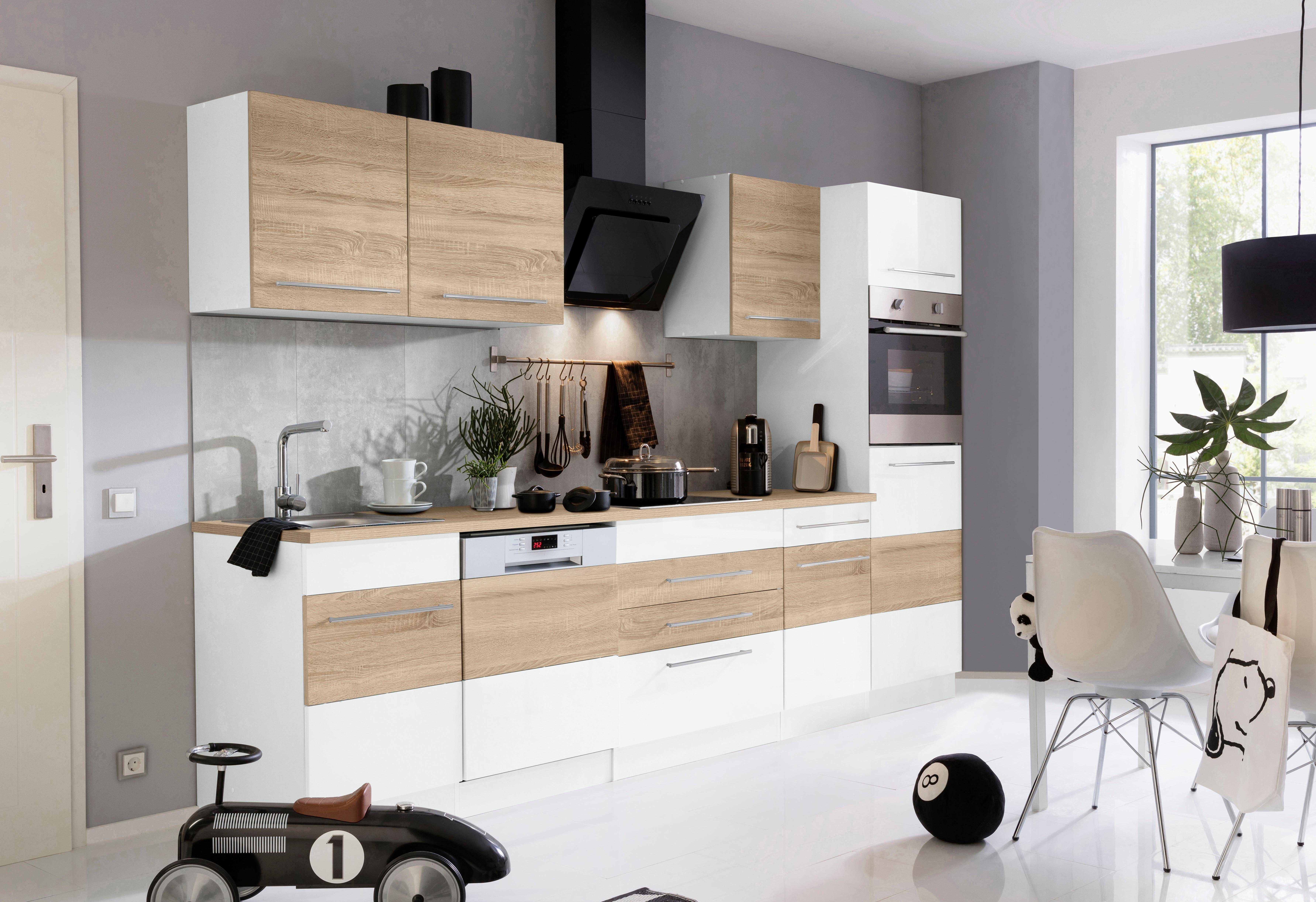 Ausstattung | Durchgehende Arbeitsplatte Einlegeböden der Hängeschränke höhenverstellbar Griffe glänzend verchromt inkl. Edelstahl-Auflagespüle, mit Abtropffläche |