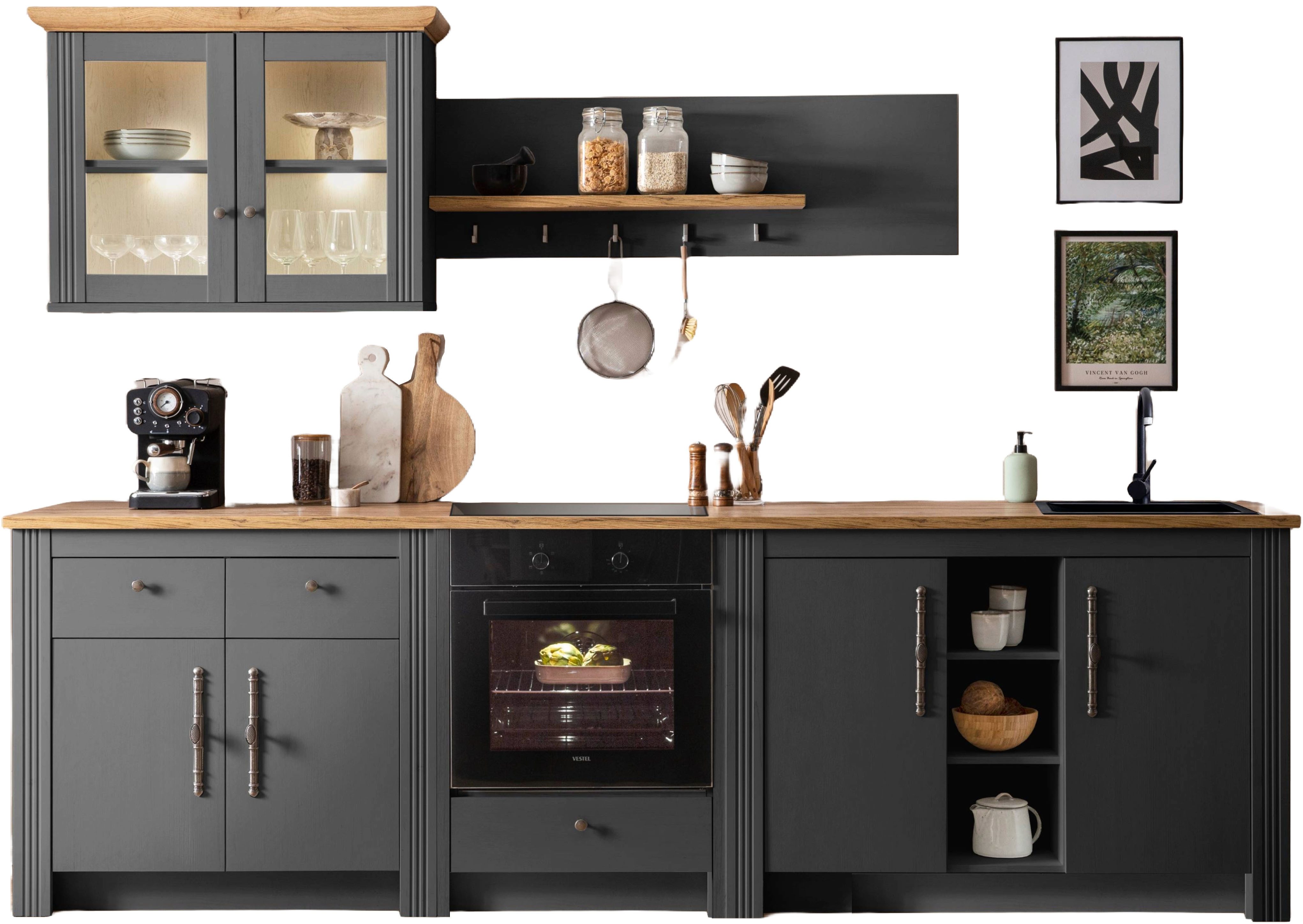 Set beinhaltet | 2x Kommoden, 1x Wandpaneel, 1x Hängeschrank, 1x Herdumbau |