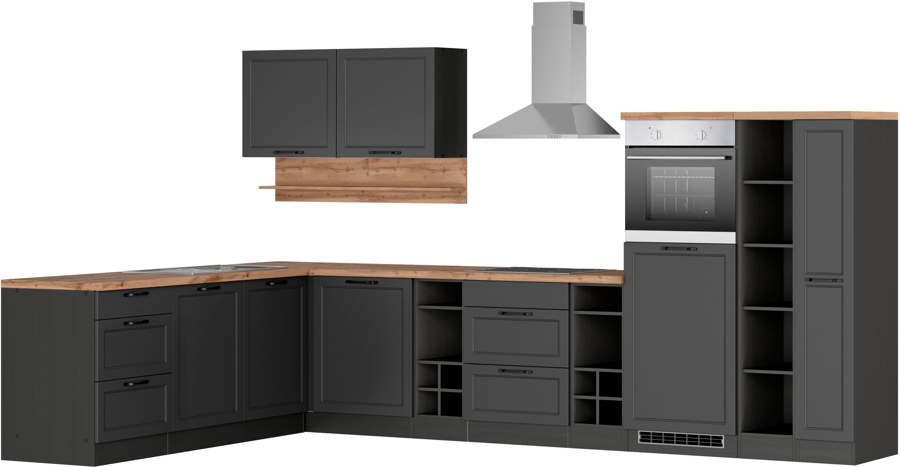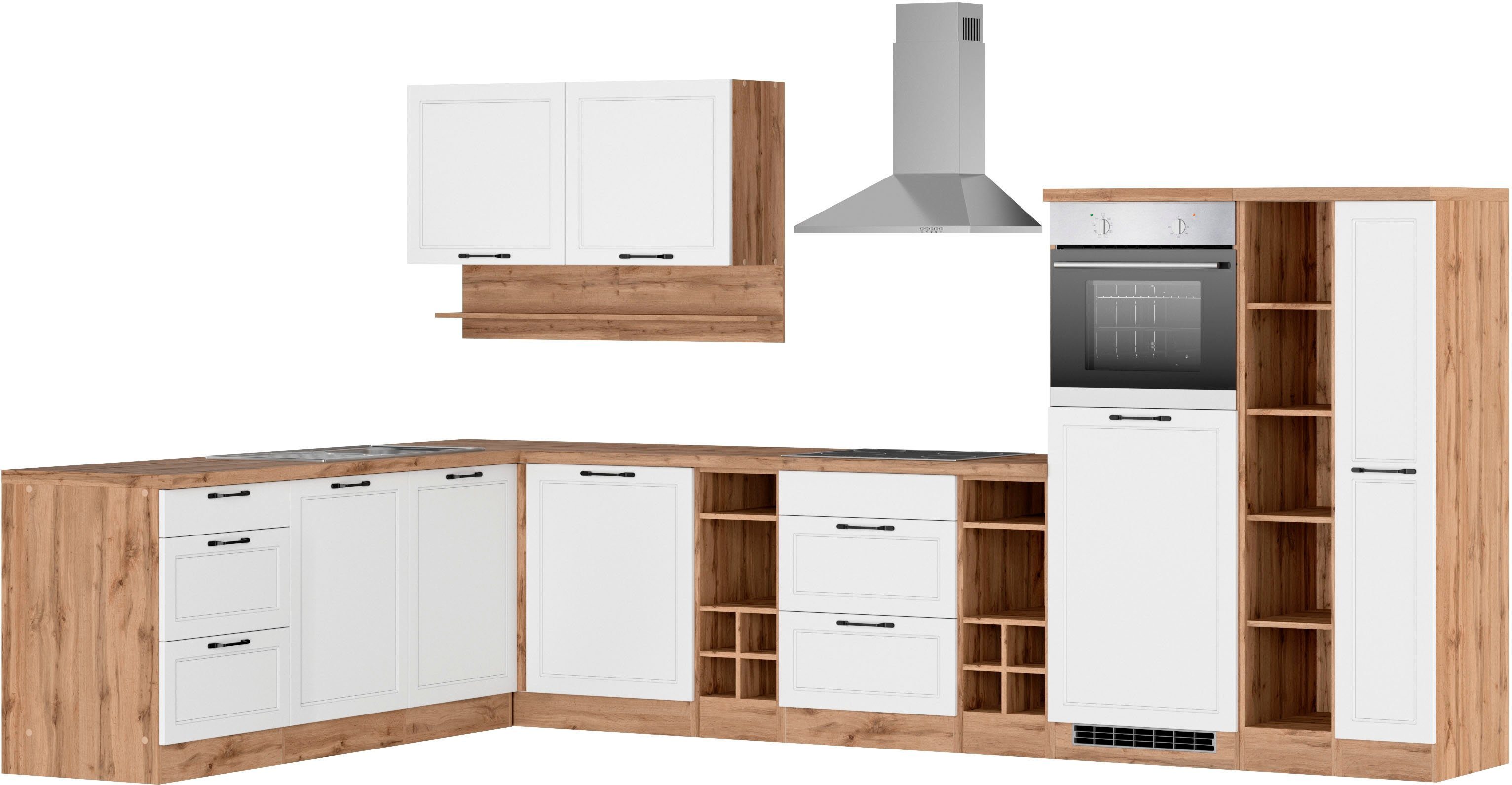 Ausstattung | Durchgehende Arbeitsplatte Einlegeböden höhenverstellbar Laufleisten der Schubkästen aus Metall Metallgriffe inkl. Edelstahl-Auflagespüle, mit Abtropffläche ohne E-Geräte |
