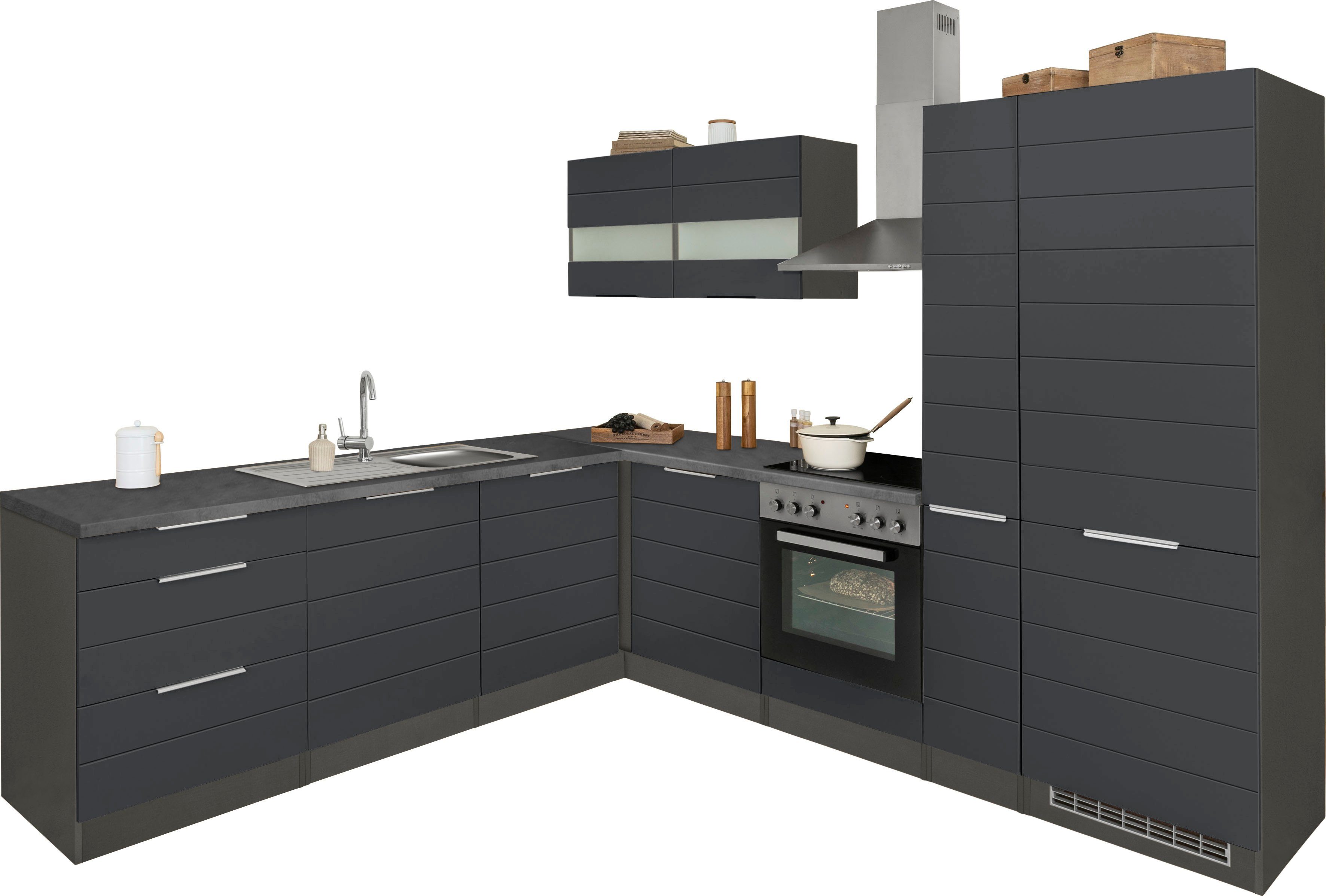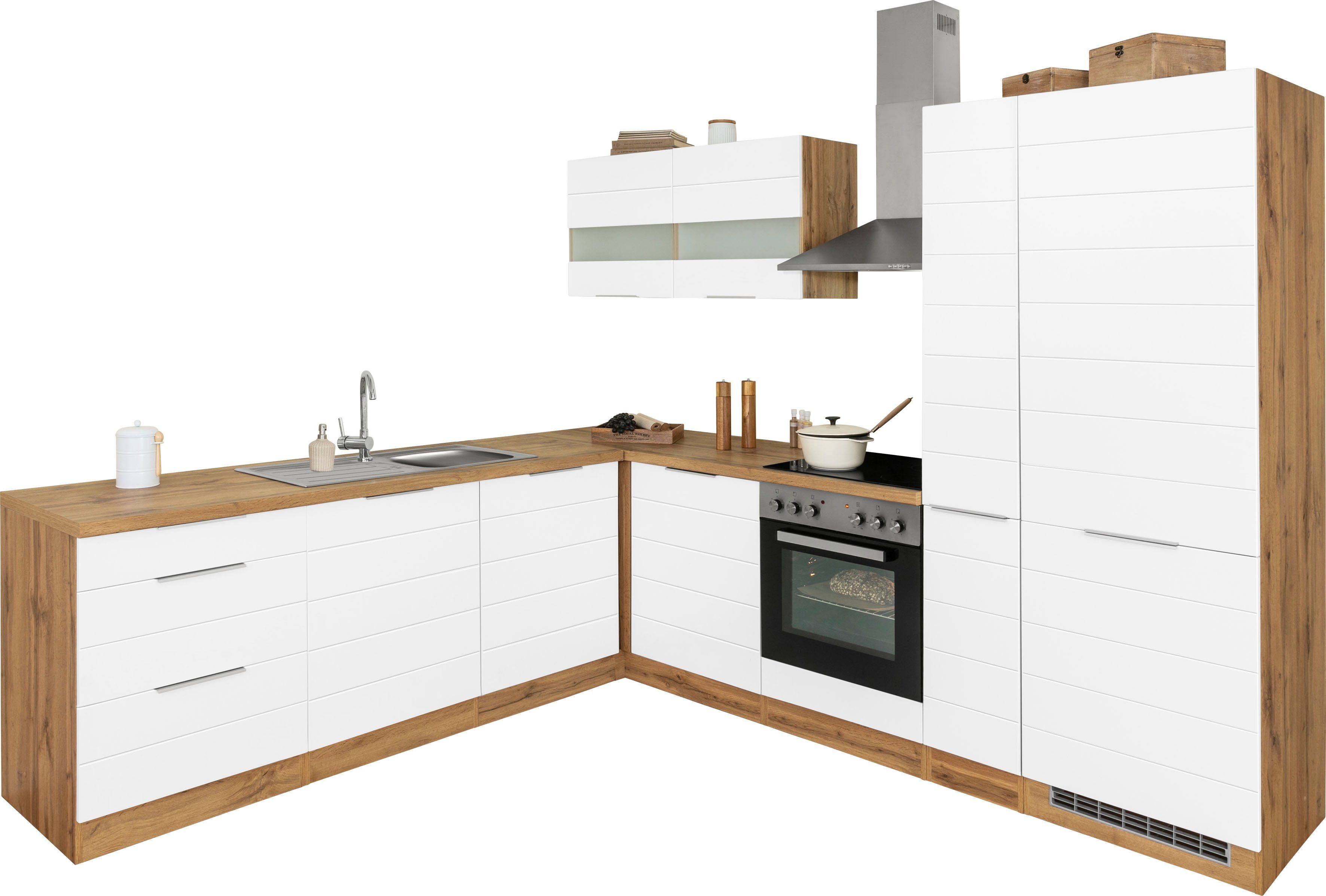 Ausstattung | Durchgehende Arbeitsplatte Einlegeböden höhenverstellbar Griffleiste Metallgriffe Seitenverkehrt stellbar Türen wahlweise rechts/links montierbar inkl. Edelstahl-Einbauspüle, mit Abtropffläche ohne E-Geräte |