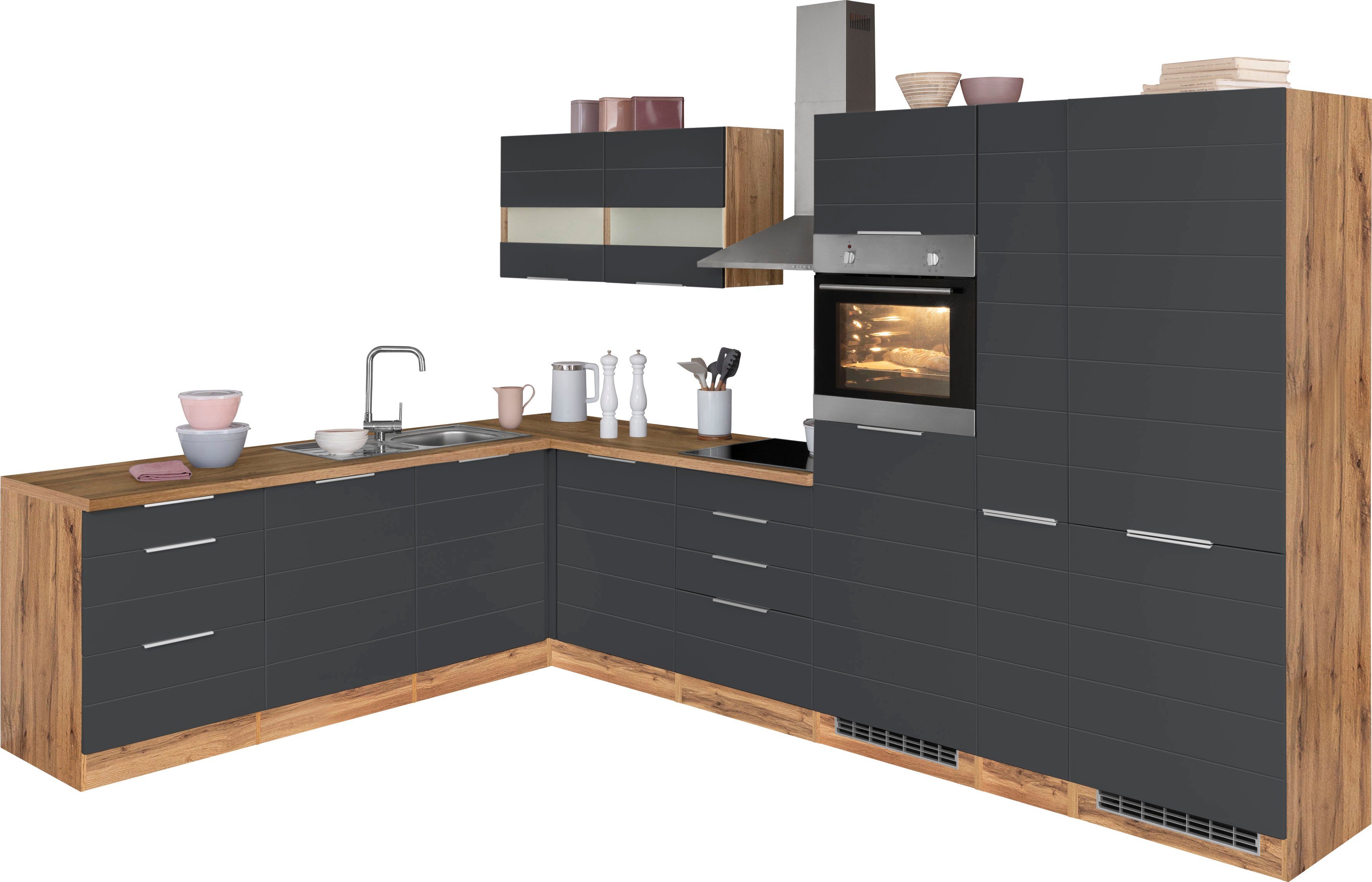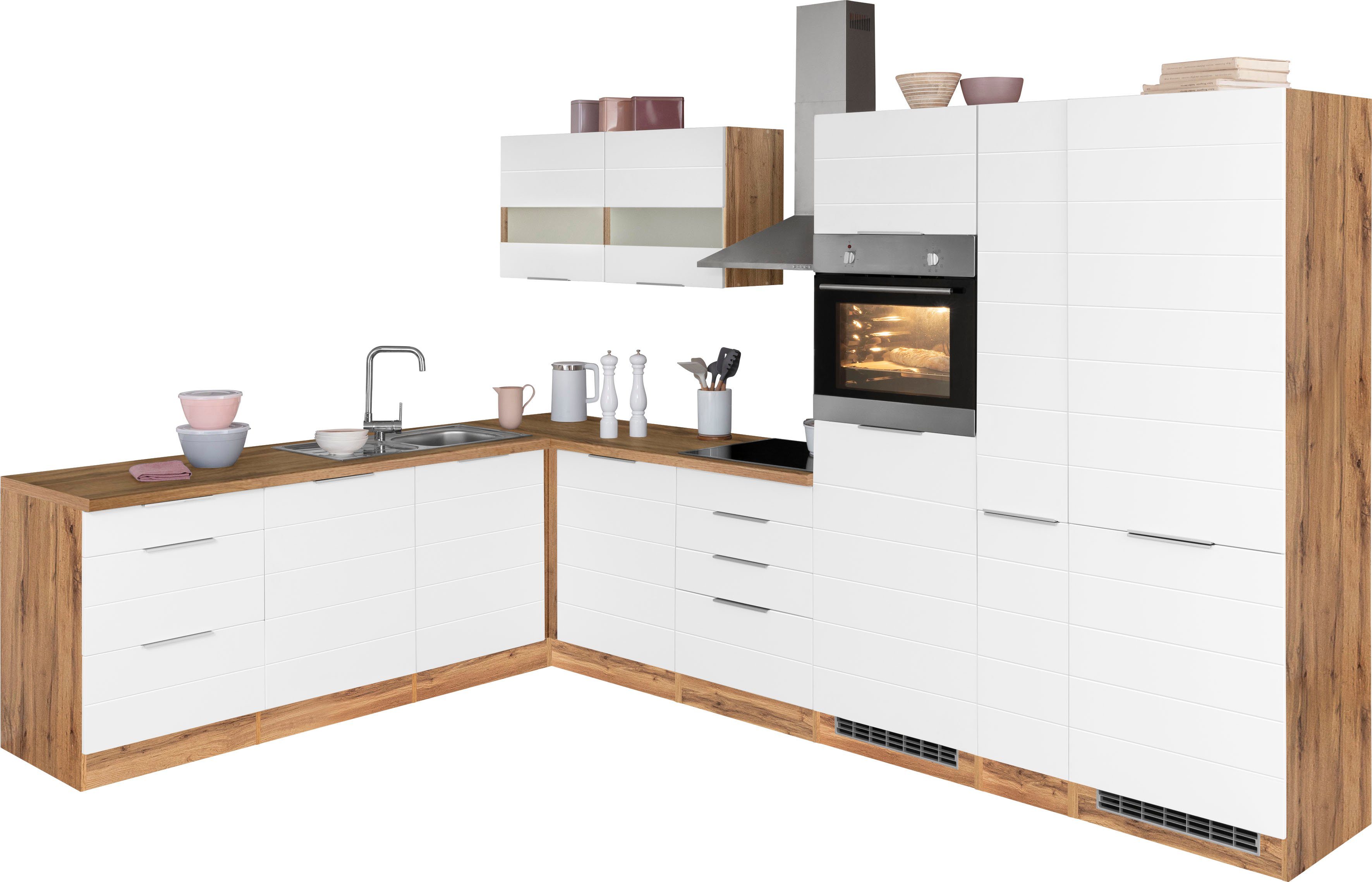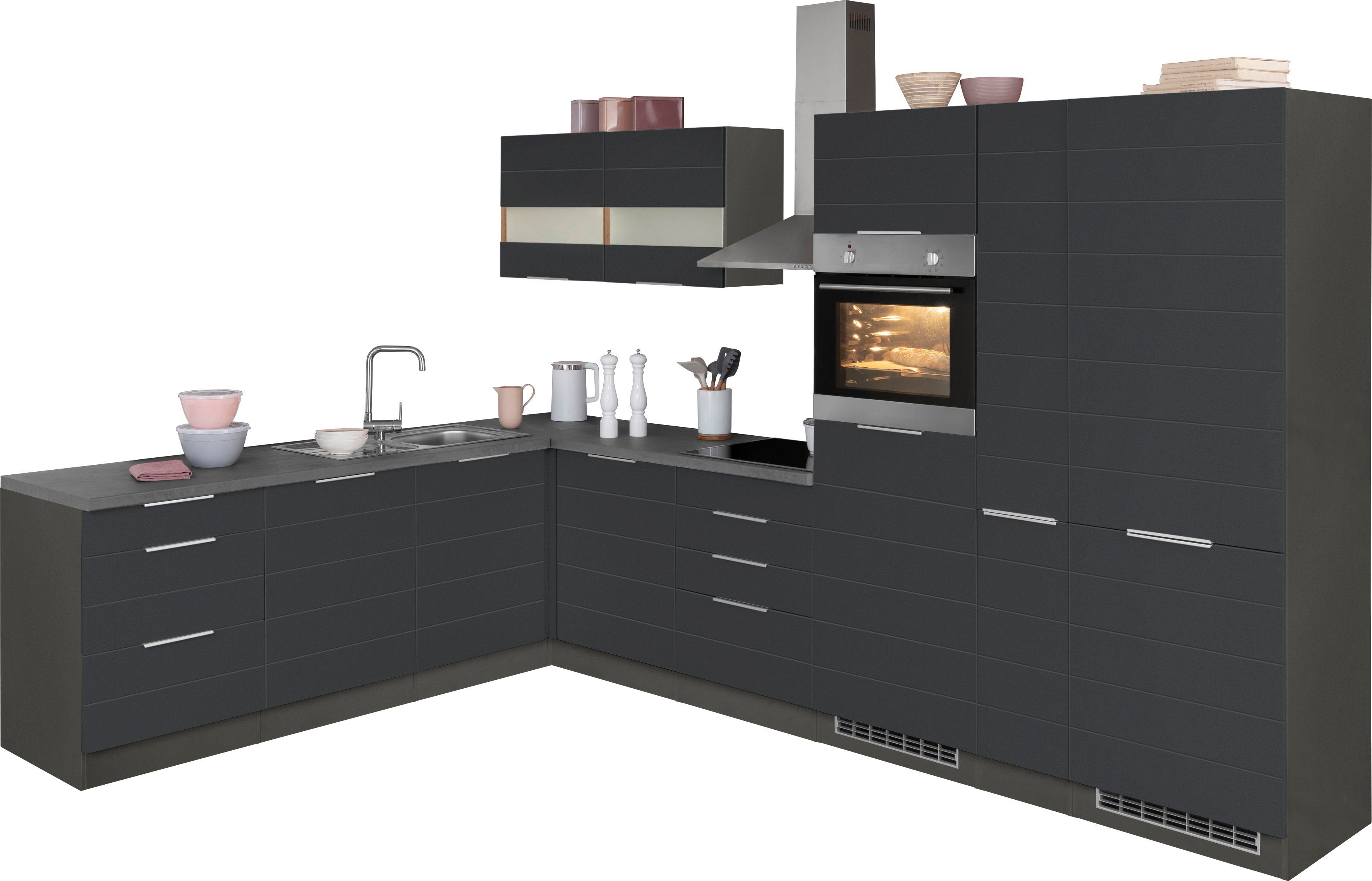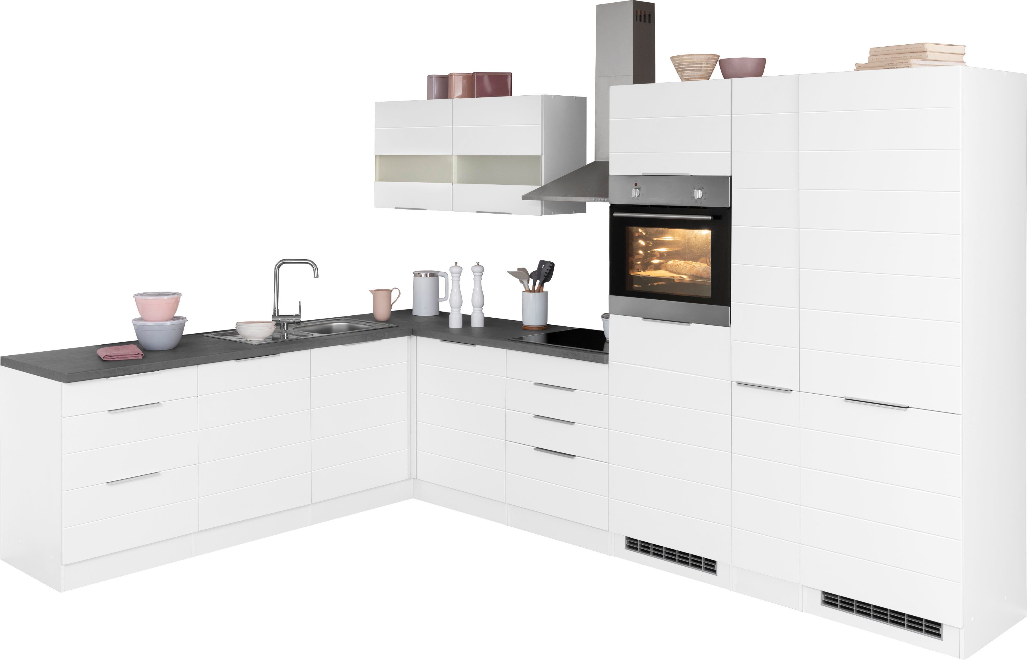 Ausstattung | Durchgehende Arbeitsplatte Einlegeböden höhenverstellbar Griffleiste Metallgriffe Seitenverkehrt stellbar Türen wahlweise rechts/links montierbar inkl. Edelstahl-Einbauspüle, mit Abtropffläche ohne E-Geräte |