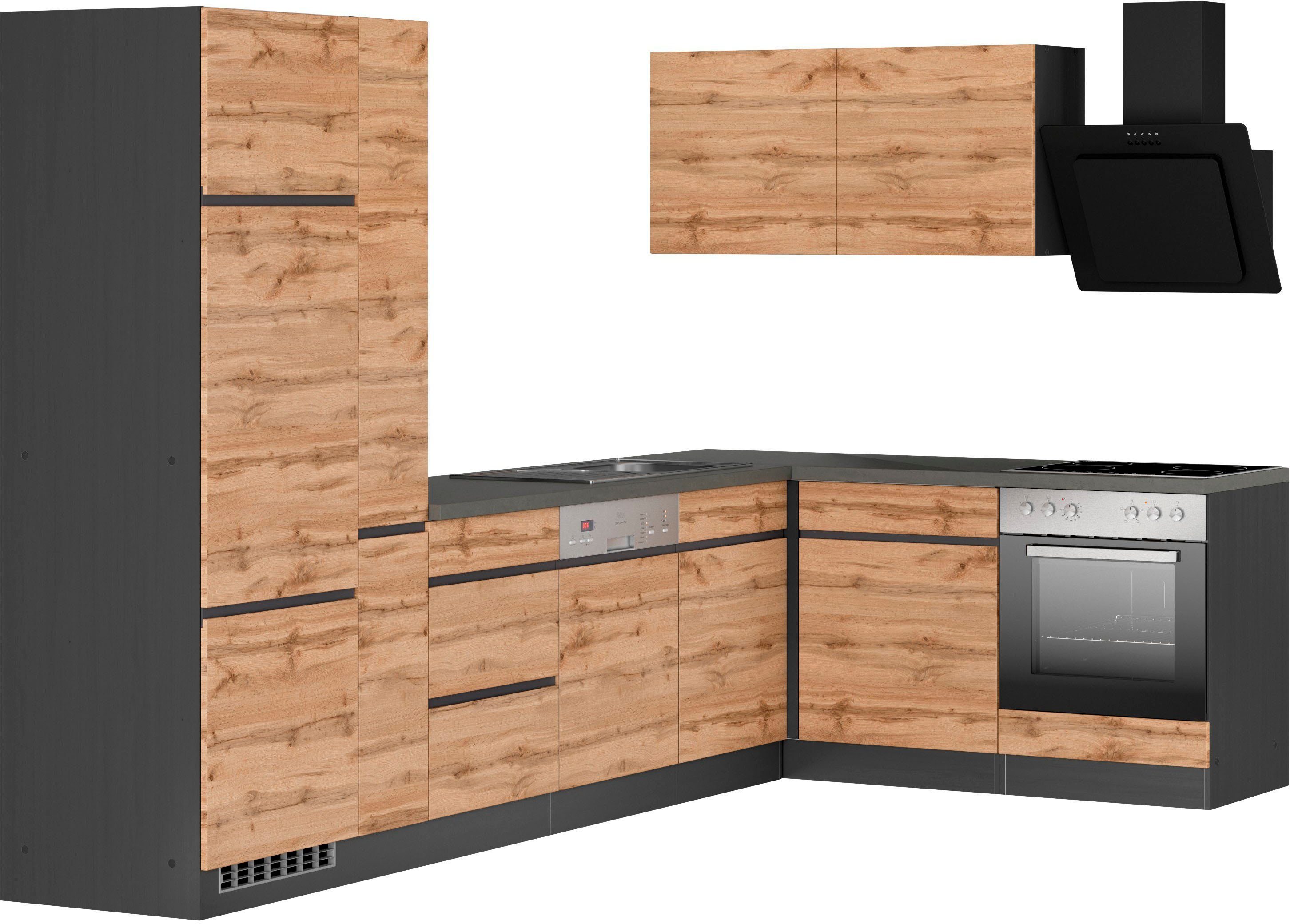 Ausstattung | Durchgehende Arbeitsplatte Einlegeböden höhenverstellbar Seitenverkehrt stellbar Sockelhöhe nicht verstellbar Stellschrauben in den Unterschränken als Montagehilfe zum Ausgleichen von Unebenheiten: 0-4 cm Türen wahlweise rechts/links montierbar inkl. Edelstahl-Auflagespüle, mit Abtropffläche ohne E-Geräte |
