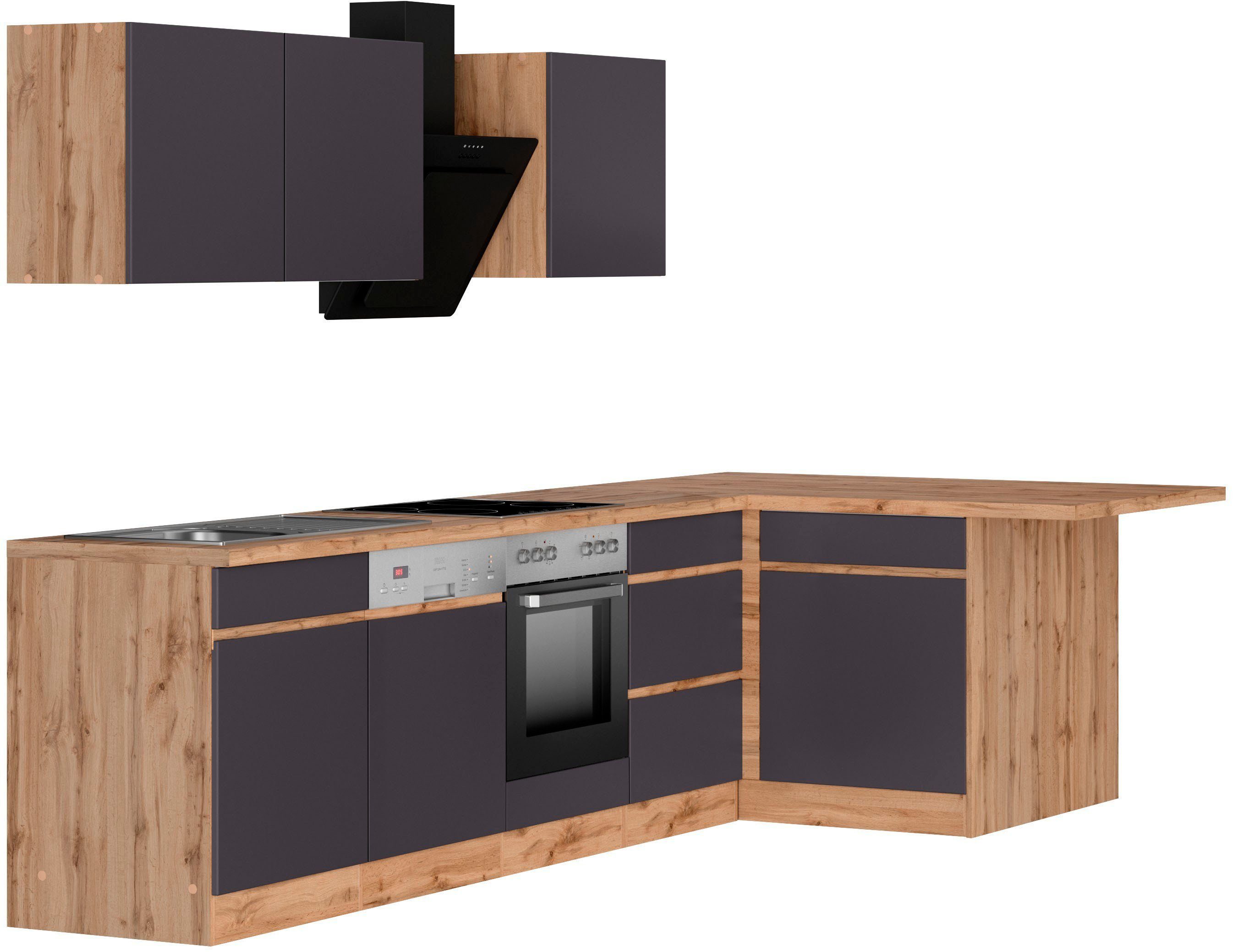Ausstattung | Durchgehende Arbeitsplatte Einlegeböden höhenverstellbar Seitenverkehrt stellbar Sockelhöhe nicht verstellbar Stellschrauben in den Unterschränken als Montagehilfe zum Ausgleichen von Unebenheiten: 0-4 cm Türen wahlweise rechts/links montierbar inkl. Edelstahl-Auflagespüle, mit Abtropffläche ohne E-Geräte |