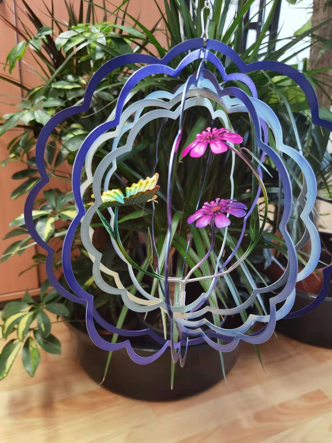 Biegen Sie die einzelnen Ringe gleichmäßig und vorsichtig so weit ausreichender, bis die Mittelfläche ungefähr im 45-Grad-Winkel zu dem Außenring steht. Befestigen Sie den Metallaufhänger in einem der beiden dafür vorgesehenen Löcher. Hängen Sie das Windspiel an dem Metallaufhänger an der gewünschten Position auf. Achten Sie darauf, dass sich das Windspiel frei im Wind bewegen kann. (Achtung: Die 3D-Figueren sind nicht biegsam.)