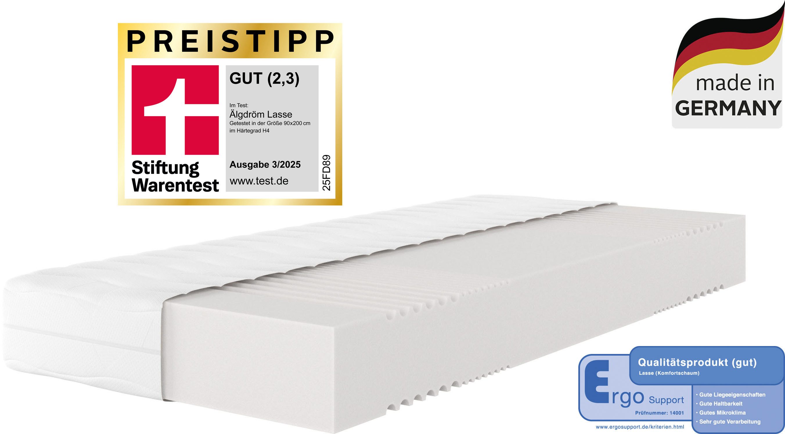 Kernaufbau | Lasse Standard: Komfortschaum (20 cm hoch, H2 - 32 kg/m³, H3 - 35 kg/m³; H4 - 39 kg/m³); Lasse Premium: Gelschaumtopper (5cm hoch 39 kg/m³ ), Komfortschaum (20 cm hoch, H2 - 32 kg/m³, H3 - 35 kg/m³; H4 - 39 kg/m³) |
