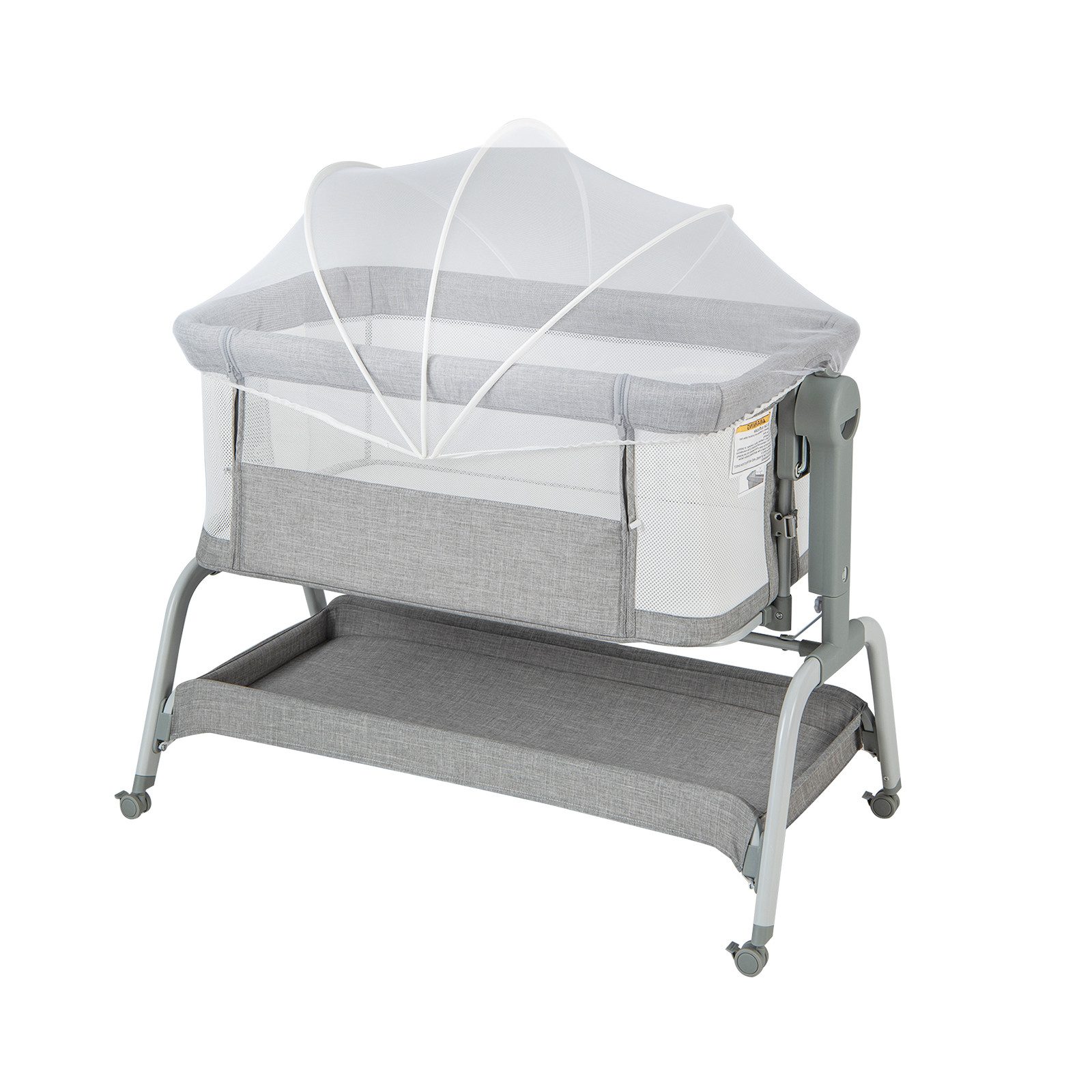 In unserem kuscheligen Babybett kann das Baby nachts friedlich neben einem Erwachsenen schlafen. Wenn es Nacht wird, stellen Sie das Reisebett auf die Höhe des Erwachsenenbettes ein, klappen die Seite herunter und befestigen das Bettchen mit den Befestigungsgurten am Erwachsenenbett, so dass Ihr Neugeborenes direkt vor Ihren Augen liegt. Auf der weichen Baumwollmatratze mit Moskitonetz zum Schutz vor Mücken und Insekten lässt sich das Bettchen flach schaukeln, damit Ihr Baby in einen süßen Schlummer fallen kann. Wenn Sie Ihr Baby täglich füttern, kann das Bettchen außerdem in einem geeigneten Neigungswinkel eingestellt werden, um zu verhindern, dass Ihr Baby spuckt. Es ist erwähnenswert, dass der Bezug des Bettbezugs (nicht waschmaschinenfest) und der Matratzenbezug abnehmbar und waschbar sind.
