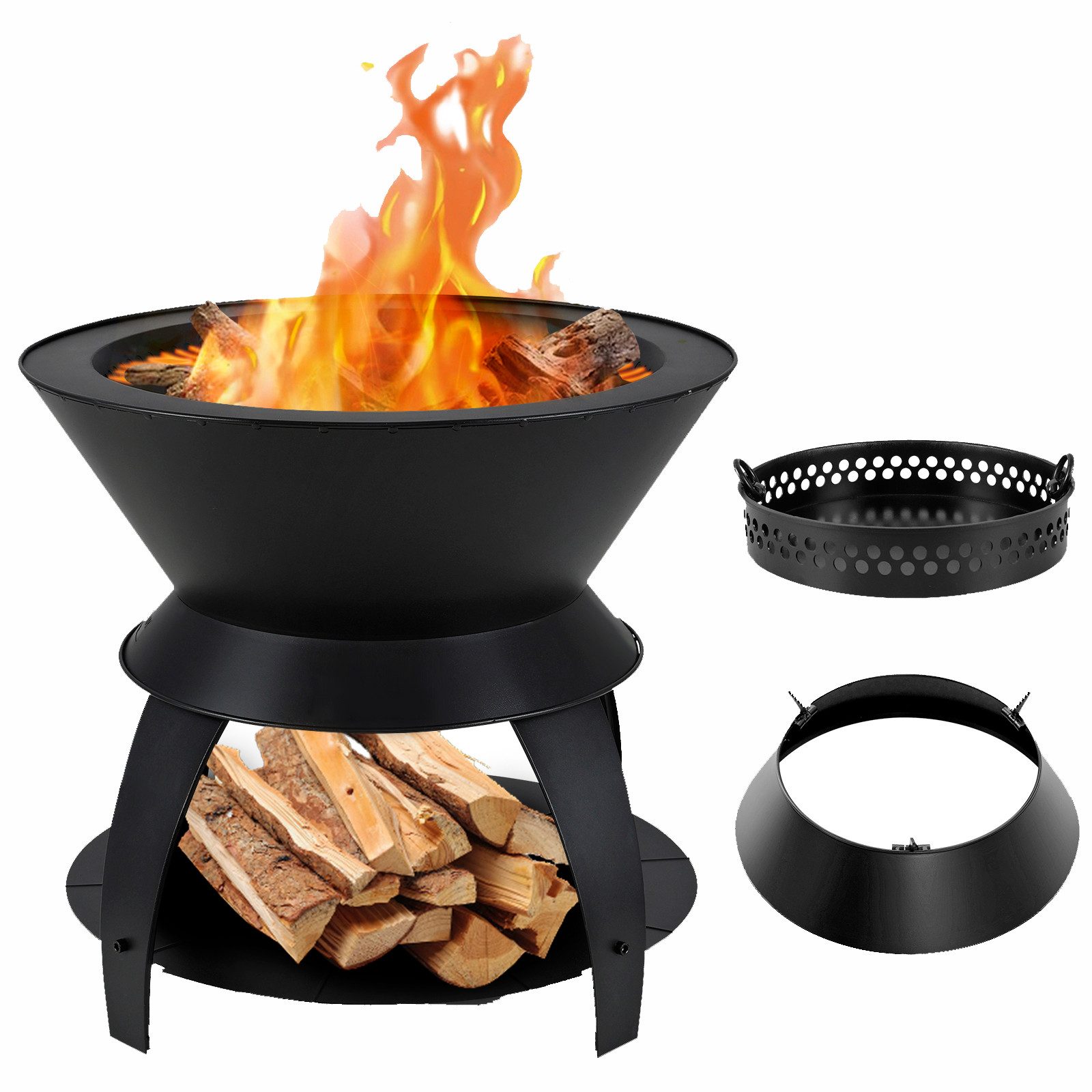 Diese auf Effizienz ausgelegte rauchfreie Feuerstelle verfügt über ein zweites Verbrennungssystem und ein 360°-Luftstromsystem, das eine vollständige Verbrennung fördert. Die Feuerstelle besteht aus einer hitzebeständigen Zink-Eisen-Legierung und garantiert zahlreiche unvergessliche Camping-, Grill- und Gartentreffen. Genießen Sie die Vielseitigkeit dieser 3-in-1-Feuerstelle, die gleichzeitig als Grill- und Topfstation mit Wok-Ring dient. Darüber hinaus sind unterschiedliche Brennstoffe wie Brennholz, Pellets oder Holzkohle zulässig, um Ihnen die Wärme und den Charme einer traditionellen Feuerstelle mit modernen Funktionen zu bieten. Auf der unteren Ablage können Sie Kraftstoffarten und Werkzeuge aufbewahren. Insgesamt ist die runde Feuerschale einfach zu verwenden und zu warten, was sie zu einer großartigen Wahl für den Außenbereich macht.
