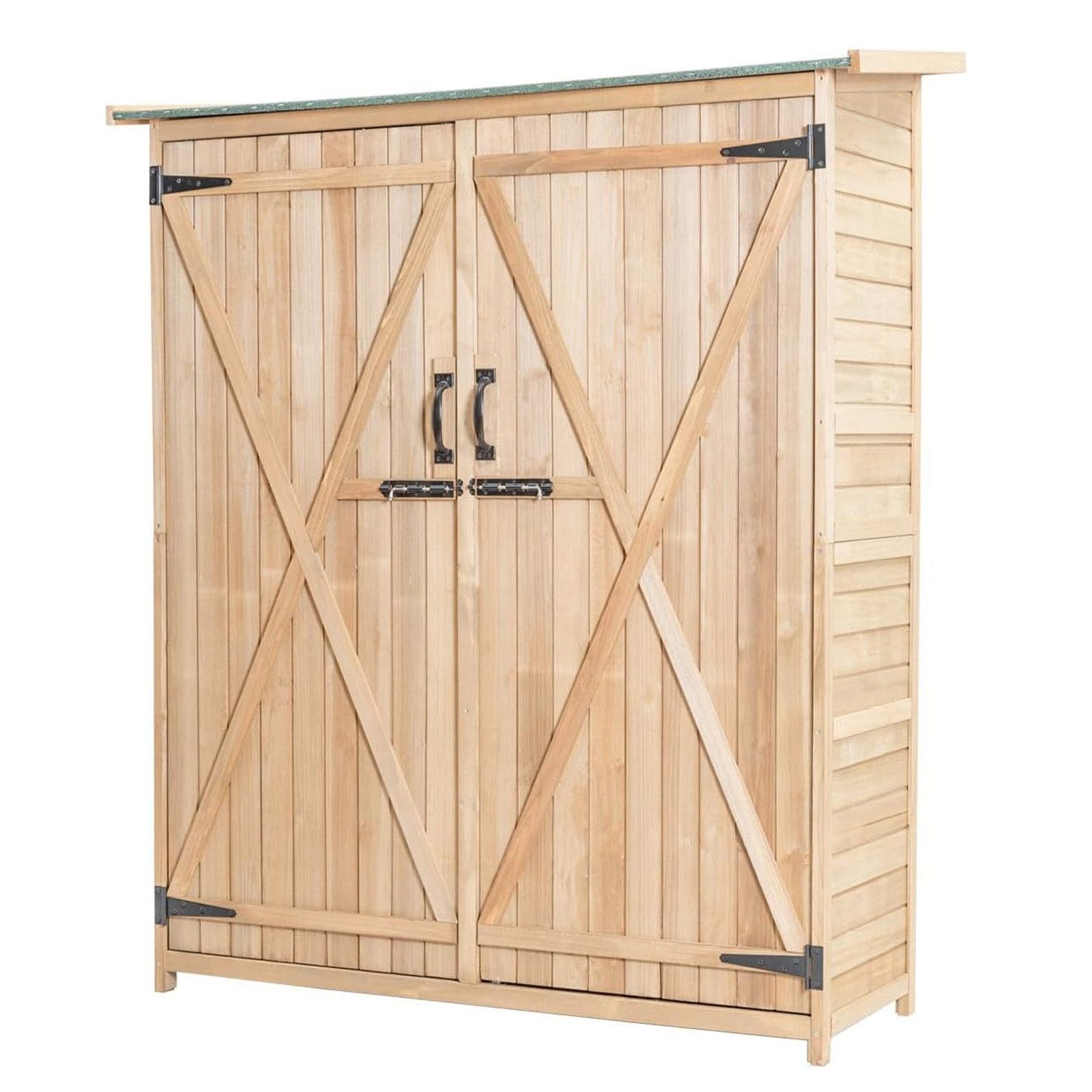 Unser Außengerätehaus mit drei Einlegeböden und einem Schrank mit großer Kapazität eignet sich perfekt zur Aufbewahrung einer Vielzahl von Gartengeräten wie Scheren, Schaufeln, Handschuhen, Schweißgeräten, Unkrautvernichtern und mehr. Die Doppeltüren sind mit stabilen Schlössern ausgestattet, um Ihr Eigentum sicher aufzubewahren und gleichzeitig Ungeziefer fernzuhalten. Das Gartenhaus besteht hauptsächlich aus massivem und haltbarem Tannenholz mit einer lackierten, wetterfesten Oberfläche. Erwähnenswert ist, dass das Schrägdach mit Asphalt beschichtet ist, was nicht nur verhindert, dass sich Regenwasser ansammelt, sondern es auch sehr wasserdicht macht. Daher eignet es sich für eine Vielzahl von Gelegenheiten im Freien, wie Gärten, Rasenflächen, Hinterhoe und so weiter.