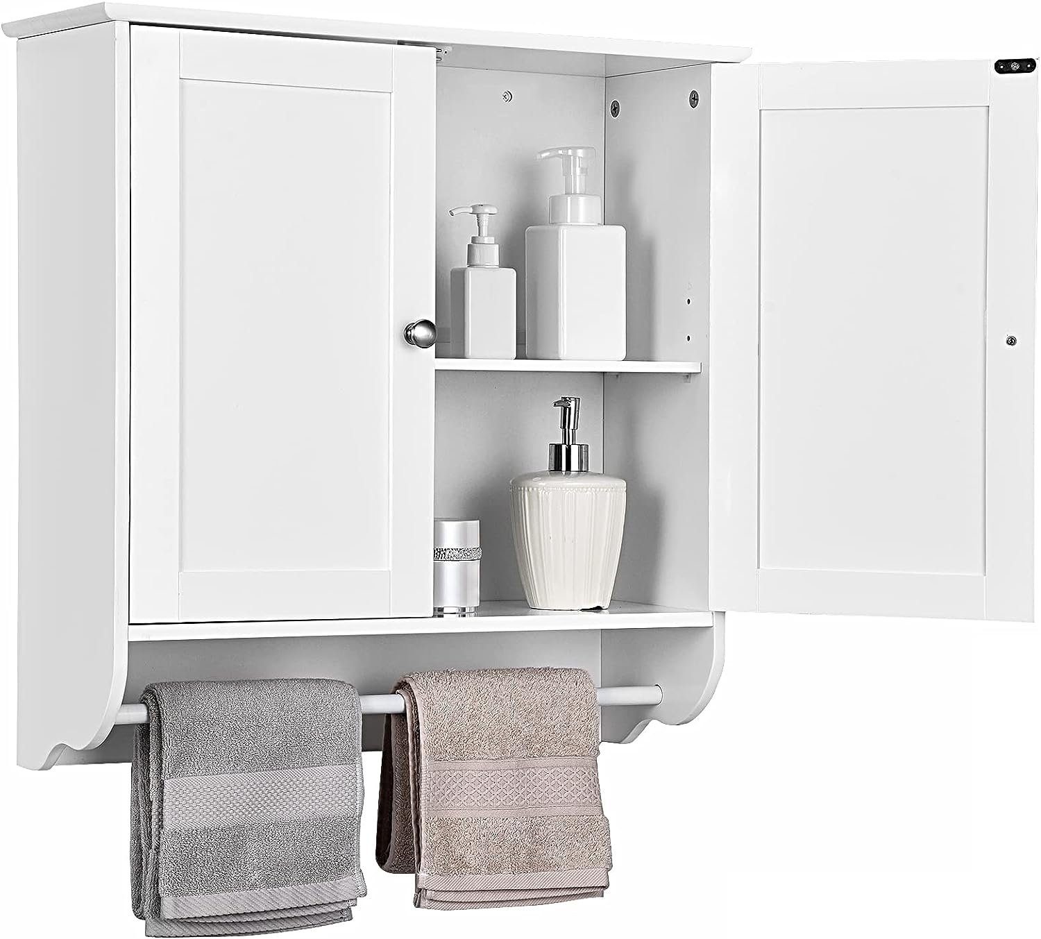 Dieser Wandschrank ist mit 2 geschlossenen Fächern und 1 Handtuchstange ausgestattet. Darüber hinaus können Sie das innere Regal in 3 Positionen verstellen, um Gegenstände unterschiedlicher Размер unterzubringen. Er verfügt außerdem über Doppeltüren mit praktischen Türknöpfen für Privatsphäre und Staubschutz. Für zusätzliche Bequemlichkeit haben wir ihn mit einer magnetischen Türverriegelung und hochwertigen Metallscharnieren ausgestattet. Dank seiner wandmontierten Struktur eignet er sich ideal für kleine Räume und kann in Ihrem Badezimmer, Ihrer Küche, Ihrem Esszimmer, Ihrem Wohnzimmer, Ihrem Eingangsbereich und vielem mehr verwendet werden.