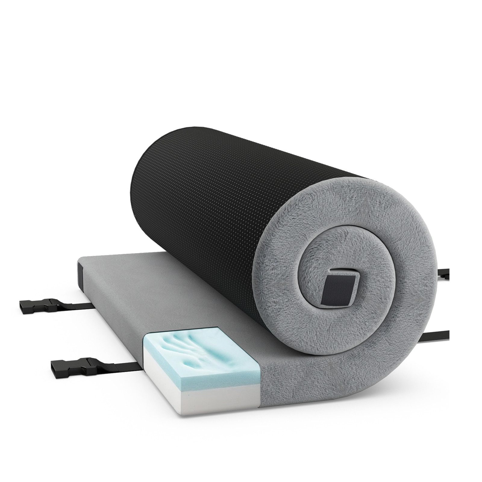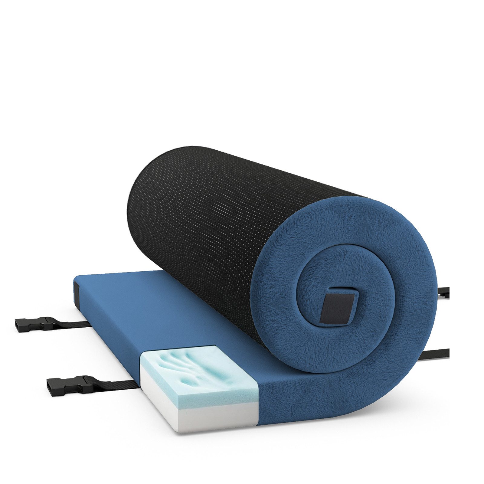 Der Memory-Schaum der Matratze behält seine Form und Festigkeit und bietet Nacht für Nacht gleichbleibende Unterstützung. Darüber hinaus sorgt der wasserdichte Kurzplüschbezug für Wärme und Widerstandsfähigkeit gegen die Elemente, sodass Sie bei Ihren Outdoor-Abenteuern trocken und komfortabel bleiben. Außerdem ist die Schlafunterlage mit einem rutschfesten Bodentuch ausgestattet, das Stabilität gewährleistet und unerwünschte Bewegungen während des Gebrauchs verhindert. Bei Nichtgebrauch kann die tragbare Bodenmatte zusammengerollt und in der Tragetasche verstaut werden. Durch ihr kompaktes und leichtes Design lässt sie sich leicht transportieren, perfekt für Campingausflüge oder Übernachtungsgäste zu Hause. Mit integrierten Klettverschlüssen können Sie mehrere stützende und bequeme Campingmatratzen miteinander verbinden, um eine größere Schlaffläche zu bilden.