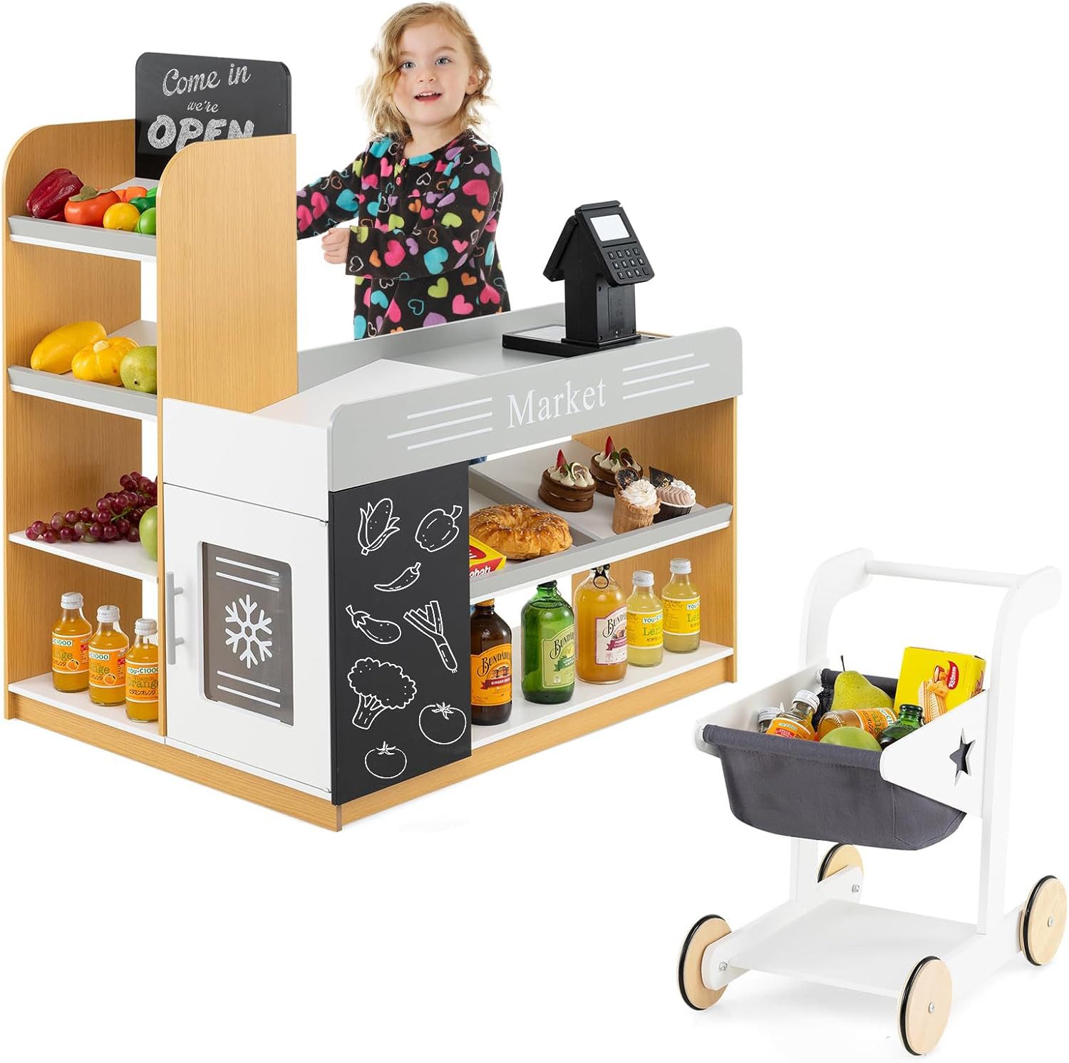 Der tolle Kaufladen sorgt für unzählige fröhliche und lehrreiche Stunden im Kinderzimmer. Mit einem Einkaufswagen, Registrierkasse, Scanner, Kartenlesegerät, Kreditkarte und Münzen zur kreativen Gestaltung ist er nicht nur niedliche und hübsch, sondern vor allem auch sinnvoll ausgestattet. Die offenen Fächer und der Kühlschrank bieten viel Raum für Süßwaren, Getränke und andere Köstlichkeiten. An der Kreidetafel können Kinder die Angebote anschreiben oder den Laden dekorieren. Außerdem überzeugt dieser Verkaufsstand durch sein neutrales Farbkonzept im skandinavischen Stil und ist ein echter Hingucker in jedem Kinderzimmer oder Kindergarten.