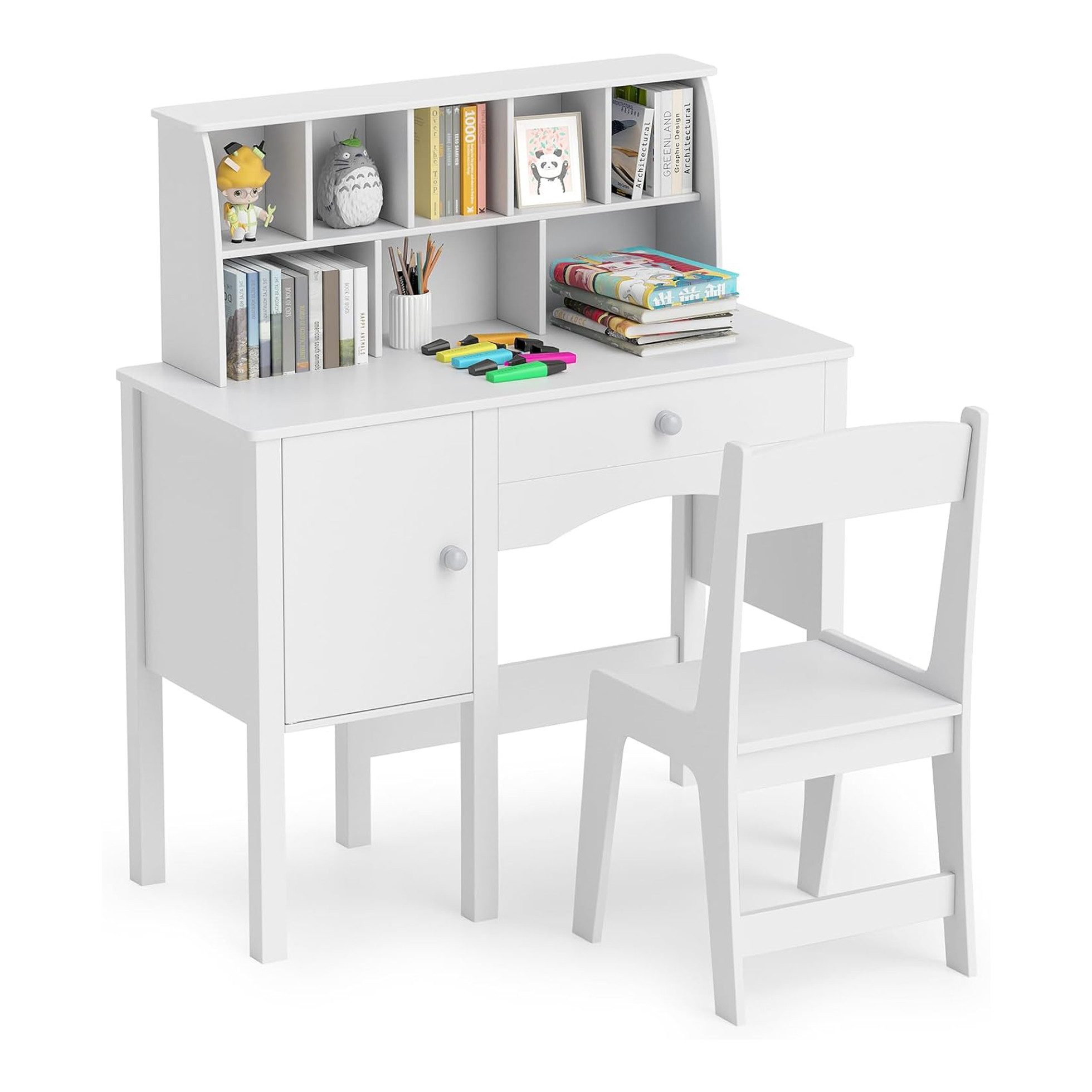 Ausgestattet mit einem offenen Regal mit acht Fächern, einer geräumigen Schublade und einem großen Schrank bietet der Kinderschreibtisch ausreichend Platz, um die Tischplatte übersichtlich zu halten und Ordnung bei Kindern zu fördern. Darüber hinaus erfüllt die geräumige Tischplatte die unterschiedlichen Bedürfnisse von Kindern wie Lesen, Schreiben, Zeichnen oder Spielen. Der passende Stuhl mit ergonomischer Rückenlehne stützt den Rücken des Kindes und sorgt für optimalen Komfort bei längeren Lerneinheiten. Dank Kippschutz steht der Schreibtisch stabil und wackelt nicht.