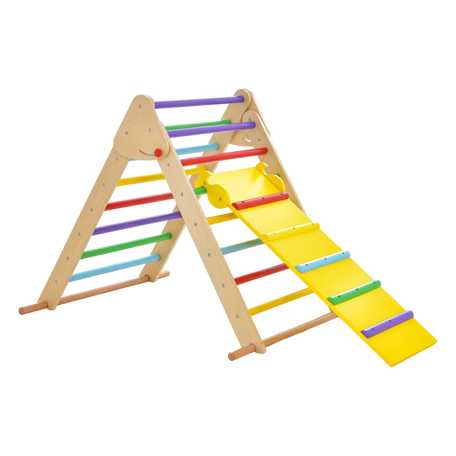 Mit diesem Kletterdreieck-Set hat Ihr Kind jede Menge Spaß! Das Set besteht aus einem Kletterdreieck und einer doppelseitigen Rampe, um den unterschiedlichen Bedürfnissen Ihres Kindes beim Klettern und Rutschen gerecht zu werden. Eine Seite der doppelseitigen Rampe kann als Rutsche zum Gleiten verwendet werden und die andere Seite ist mit erhöhten Querstangen zum Klettern ausgelegt. Sie können auch die Höhe der Rampe einstellen, um den Schwierigkeitsgrad des Spiels zu bestimmen und die motorischen Fähigkeiten Ihres Babys zu entwickeln. Hochwertige Holzmaterialien und eine stabile Dreieckskonstruktion sorgen für Langlebigkeit und können bis zu 60 kg tragen. Darüber hinaus schützen die gratfreie Oberfläche und die glatten Kanten die Haut der Kinder. Kinder können beim Spielen mit diesem Kletterspielzeug-Set ihre Körperbeherrschung und Koordination verbessern und sind ein tolles Geschenk. Außerdem kann das Dreiecksklettergerüst nach dem Gebrauch zur einfachen Aufbewahrung zusammengeklappt werden.