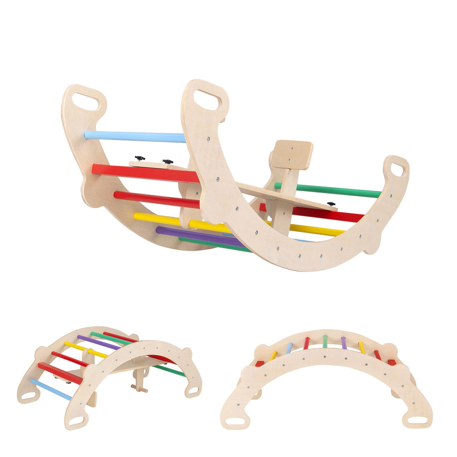(мы ещё работаем над переводом, извините за неудобство): Verschenken Sie endlose Möglichkeiten mit unserem 4-in-1-Schaukelspielzeug aus Holz! Dieses Spielzeug mit abnehmbarem Sitz lässt sich in einen Kletterbogen, einen Schaukelbogen und einen Krabbeltunnel verwandeln und bietet so vielfältige Spielmöglichkeiten. Sicherheit hat oberste Priorität, und zwar mithilfe eines Schaukelwinkels von 35° und Kippschutz. Die kinderfreundliche Rückenlehne und der Griff sorgen für zusätzlichen Komfort. Mit stabilen Bodenpfählen aus Metall und sorgfältig angeordneten Stufen können Kinder sicher klettern. Dieses Montessori-Kletterspielzeug ist außerdem zuverlässig und verfügt über eine splitterfreie Oberfläche für sorgenfreies Spielen. Dieses vielseitige Schaukelspielzeug ist perfekt für Kinder im Alter von 1 bis 5 Jahren und ein ideales Geschenk, das motorische Fähigkeiten, körperliche Fitness und kritisches Denken fördert. Ob zu Hause, im Kindergarten oder im Vorschulsport, dieses 4-in-1-Schaukelpferd verspricht, den Kleinen Freude und einen pädagogischen Wert zu bringen.