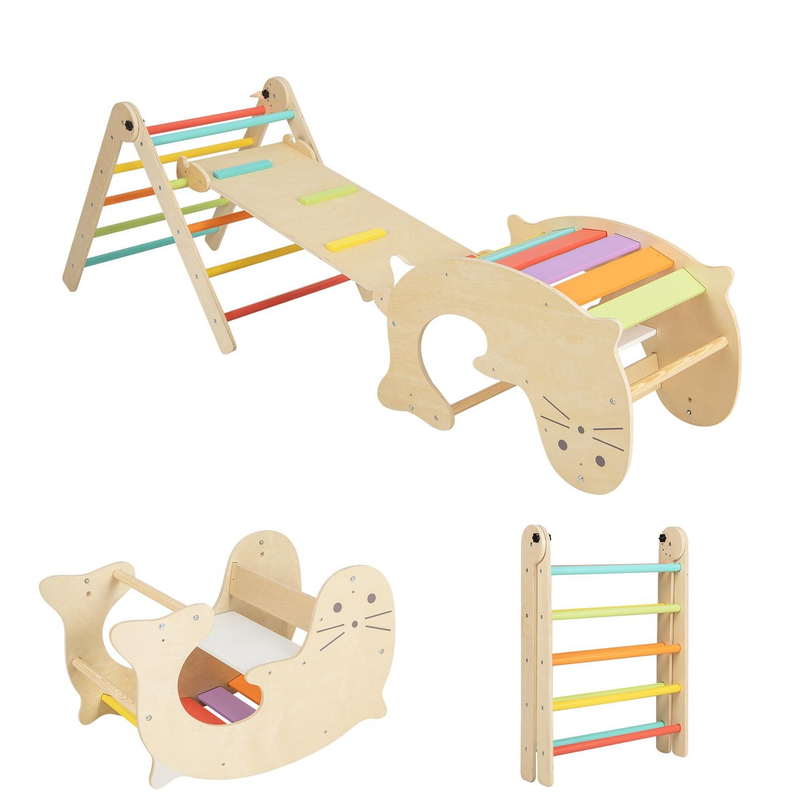 Dieses vielseitige, von Montessori inspirierte Kletterspielzeug-Set wird komplett mit einer umkehrbaren Rampe, einer Seelöwen-Wippe und Kletterer, einem Spieltisch und einem Kletterdreieck geliefert. Kinder können die glatte Rutsche hinuntersausen oder die Rutsche umdrehen und die Felsen für weitere Aktivitäten anbringen. Außerdem ist das Bogen-Spielzeug nicht nur ein Kletterbogen, sondern auch eine Wippe und ein Spieltisch. Und die Leiter kann auf die geeignete Höhe für Kinder zum Klettern eingestellt werden. Dieses multifunktionale Turnhallen-Set eignet sich perfekt, um aktives Spielen zu fördern, die körperliche Entwicklung zu unterstützen, Balance und Koordination zu fördern sowie Kreativität und Vorstellungskraft anzuregen.