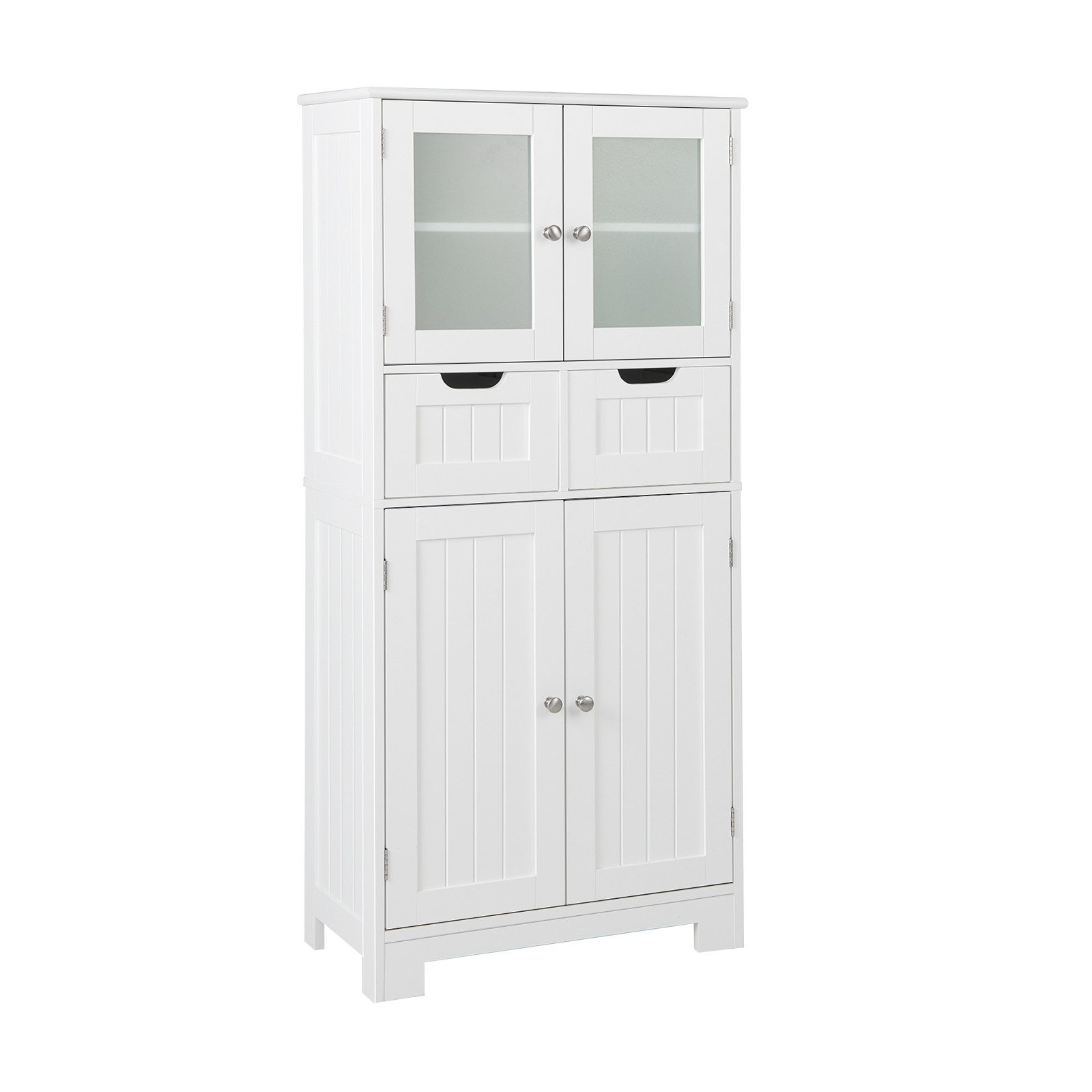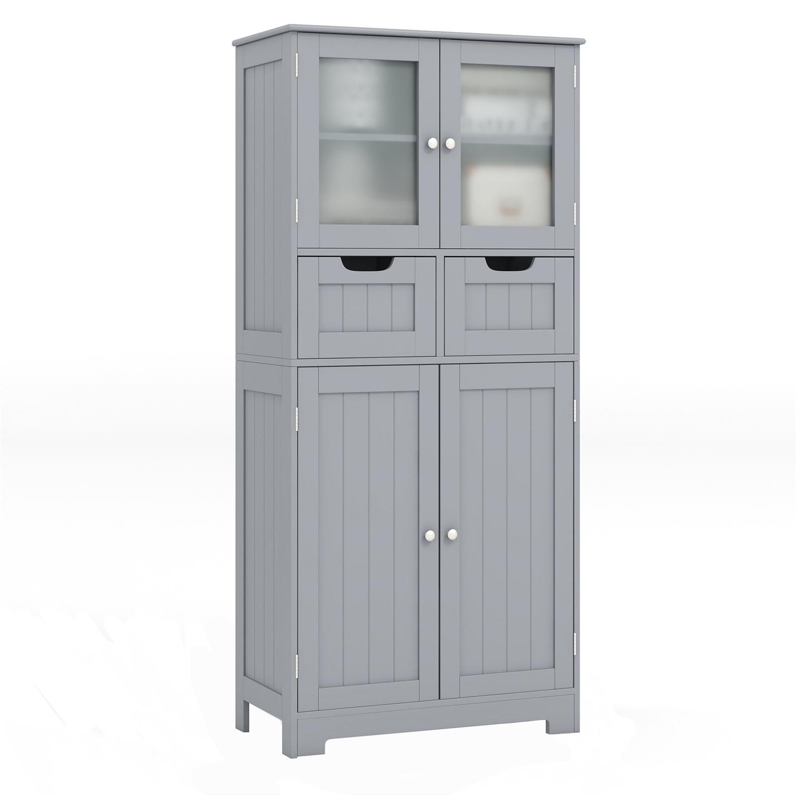 Dieser Schrank bietet viel Stauraum und sorgt für Ordnung in Ihrem Zimmer. Zwei Schränke mit Türen und zwei Schubladen schützen Ihre Privatsphäre. Die verstellbaren Einlegeböden sind sehr praktisch und das MDF-Material ist robust, wasserfest und strapazierfähig. Das gehärtete Glas hat eine ausgezeichnete Festigkeit und bricht nicht leicht. Die Metallgriffe sind leicht zu greifen. Die Kippsicherung sorgt für Sicherheit bei der Benutzung. Dieser Aufbewahrungsschrank kann als Bücherregal, Hauswirtschaftsschrank, Badezimmerschrank und mehr verwendet werden.