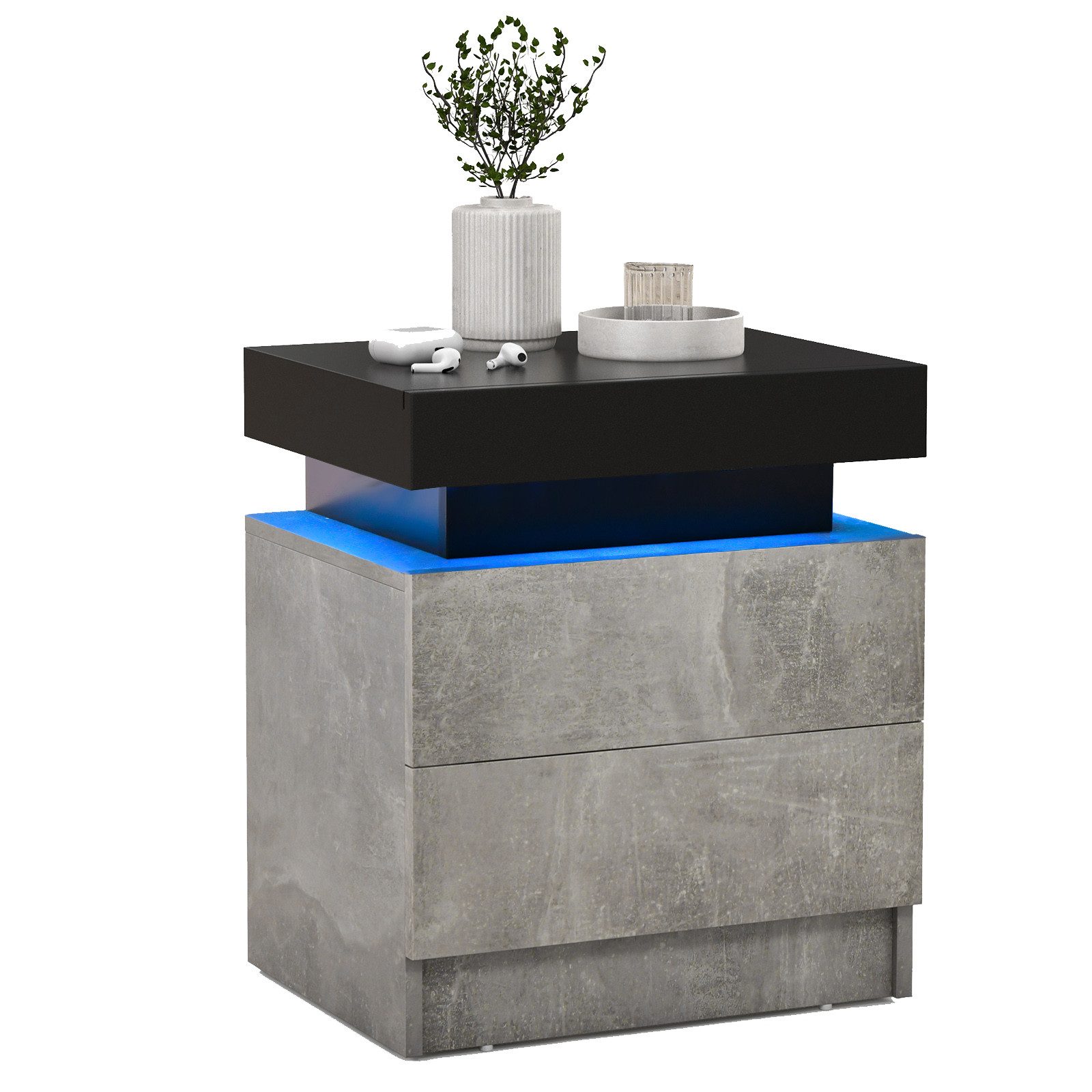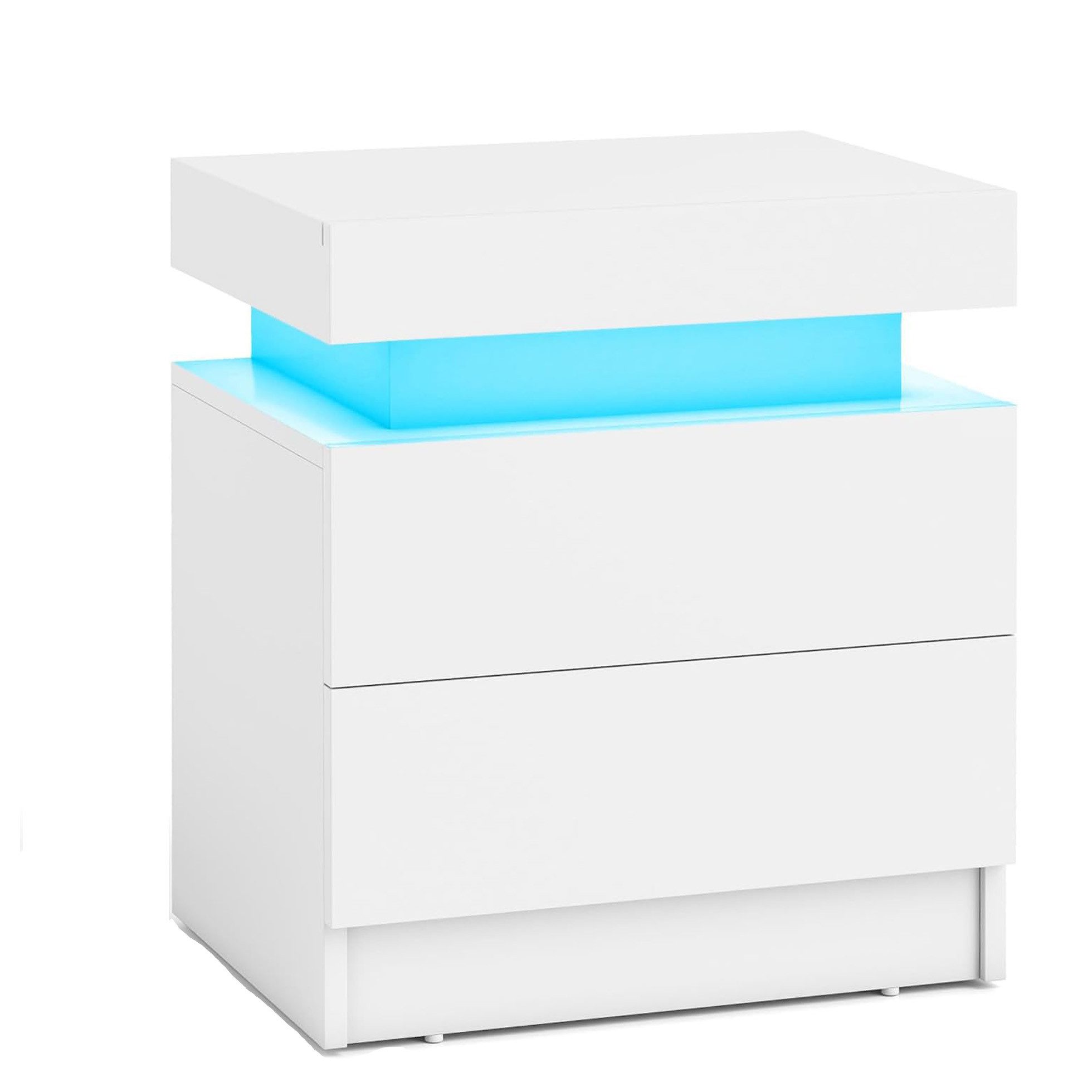 Schaffen Sie eine warme und moderne Atmosphäre in Ihrem Schlafzimmer mit unserem Nachttisch mit LED-Beleuchtung, der 22 dynamische Modi und 20 statische Farben bietet. Mit einer geräumigen Tischplatte und zwei großen Schubladen hält er alle Ihre Essentials organisiert und griffbereit. Ein Muss für die Verschönerung Ihres Innenraums mit Stil und Zweckmäßigkeit. Dank der glatten und wasserabweisenden Oberfläche ist er im Alltag leicht zu reinigen und zu pflegen. Halten Sie Ihr Zuhause mit diesem minimalistischen Nachttisch aufgeräumt!