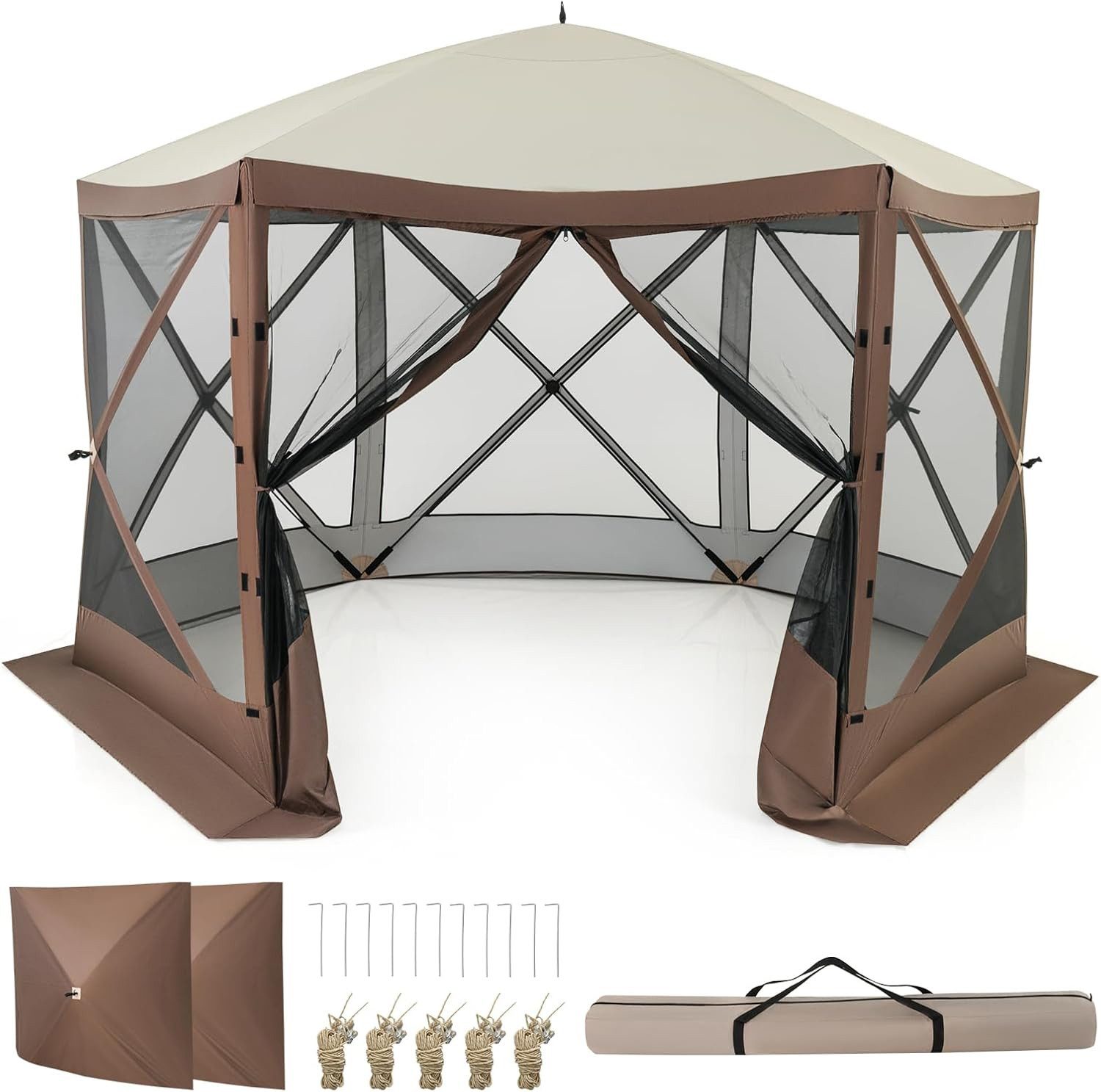 Das Pop-up-Design ermöglicht eine einfache Montage, und der großzügige Raum von 350 x 350 cm bietet Platz für 6-8 Familienmitglieder und Freunde. Die Reißverschlusstür und die integrierten Haken erleichtern den Zugang und das Aufhängen von Gegenständen. Das 6-seitige Netzdesign ermöglicht nicht nur den Genuss der Umgebung, sondern fördert auch die Luftzirkulation im Inneren. Das PU- und Silber-beschichtete Oxford-Gewebe, die robusten Glasfaserstützen und die sechseckige Struktur bieten einen vollständigen Wetterschutz.