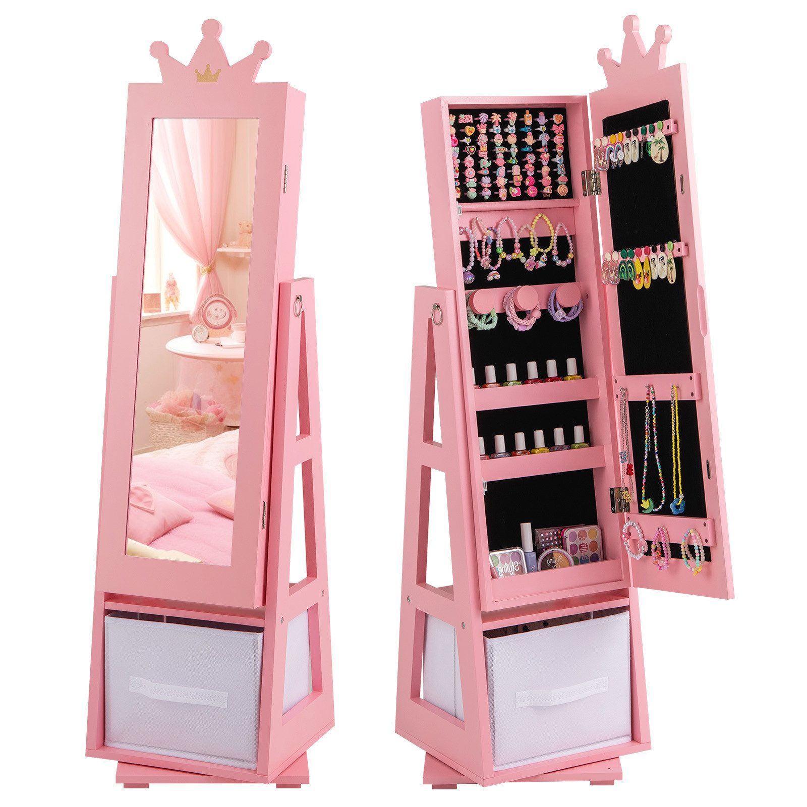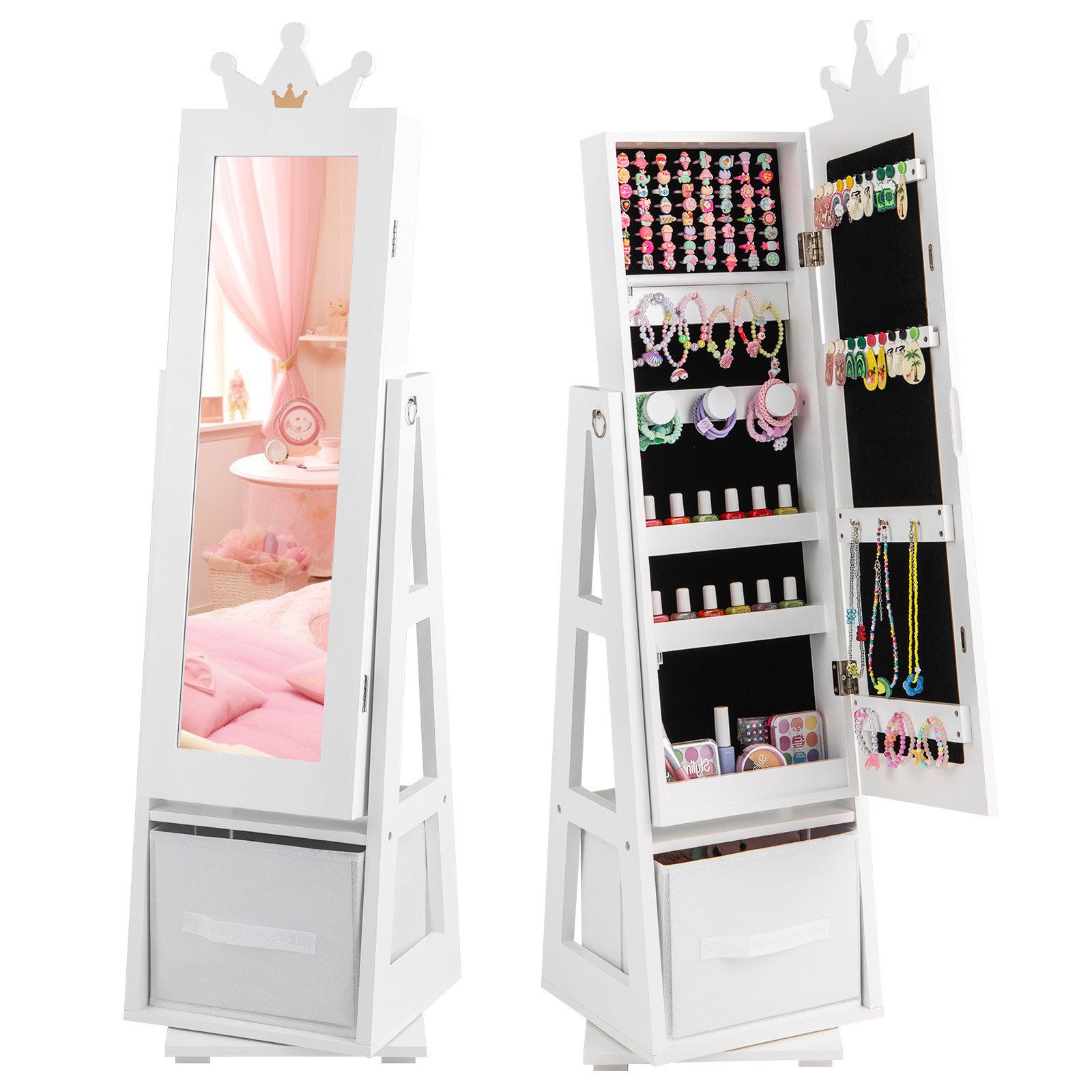 Dieser elegante und niedliche Kinderspiegelschrank wird Ihre kleine Prinzessin sicher sehr glücklich machen. Unser Produkt ist aus hochwertigem MDF gefertigt, der Bodenständer, die rutschfesten Füße und die Kippsicherung machen es sehr stabil und sicher. Das bezaubernde Kronendesign, der klare, durchgehende Spiegel und die Prinzessinnen-Farbpalette werden die Aufmerksamkeit Ihrer Kinder auf sich ziehen. Der Innenraum enthält 6 Armbänderhaken, 4 Halskette/Armbandhaken, 4 Ablagefächer, 18 Ohrringschlitze und 3 Aufbewahrungsschubladen. die Höhe von 113 cm fördert die Gewohnheit, Dinge selbstständig aufzubewahren und zu organisieren, damit Kinder lernen, unabhängig zu sein. Es ist das beste Geschenk für Kinder.