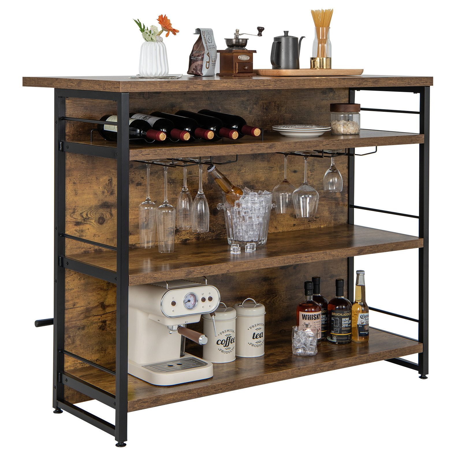 Nutzen Sie unseren Küchentisch als perfekte Lösung, um Ihre Küchenutensilien geordnet zu organisieren oder bequem den Nachmittagstee zuzubereiten. 4 offene Regale, 5 Flaschenhalter oder 4 Reihen von Weinglashaltern sorgen für eine sinnvolle Organisation Ihrer verschiedenen Gegenstände. Außerdem sorgen die ergonomischen Fußstützen für zusätzlichen Komfort bei der Benutzung der Insel. Die Sicherheit steht immer an erster Stelle, daher ist diese Kücheninsel aus dicken Holzpaneelen und stabilen Metallbeschlägen gefertigt, um eine lange Lebensdauer zu gewährleisten. Dank der verstellbaren Füße steht sie stabil auf jeder Oberfläche. Mit seiner Vintage-Ästhetik und seiner vielseitigen Verwendbarkeit ist dieser Couchtisch perfekt für eine Vielzahl von Umgebungen wie Küchen, Kneipen, Cafés und mehr. Werten Sie Ihren Raum noch heute mit einem unserer Beistelltische auf.