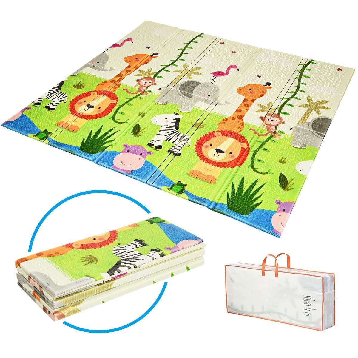 Unsere Baby-Krabbelmatte ist wasseabweisend, rutschfest und geruchlos, schadet der Gesundheit Ihres Babys nicht und hat eine starke Elastizität zum Schutz der Knie Ihres Babys. Das gedruckte Design mit kleinen Tieren auf beiden Seiten kann die Augen des Babys anziehen. Diese Krabbelmatte ist faltbar und daher sehr bequem zu packen und zu tragen.
