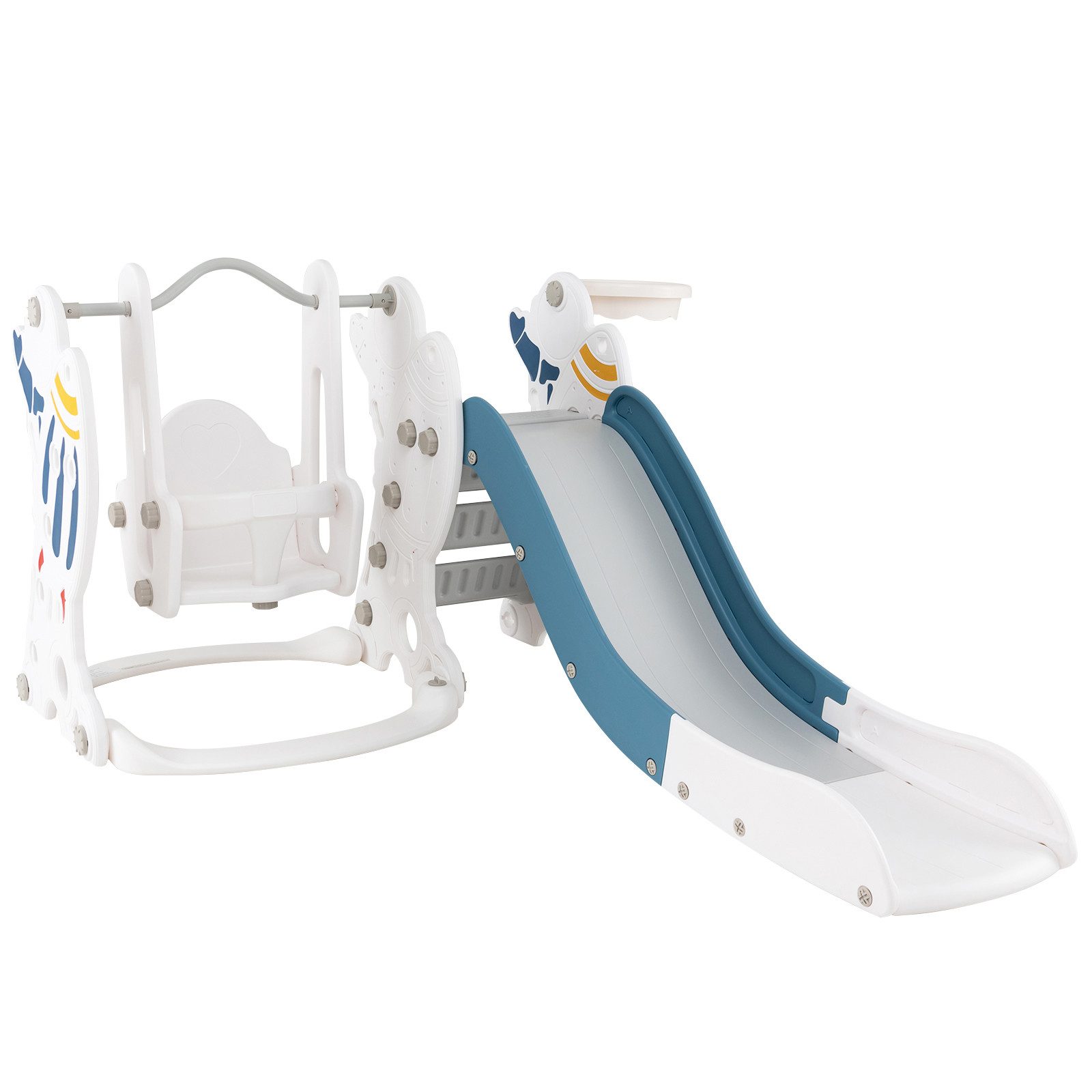 (мы ещё работаем над переводом, извините за неудобство): Schaffen Sie einen angenehmen und sicheren Indoor-Spielbereich mit diesem Rutschen- und Schwingenset! Unser 4-in-1-Spielset umfasst 1 Rutsche, 1 Klettergerüst, 1 Schaukel und 1 Basketballkorb, die es Kindern ermöglichen, mit ihren Freunden zu rutschen, zu klettern, zu schwingen oder auf den Korb zu werfen. Ein Basketball und eine Pumpe sind enthalten. Die Rutsche kann separat verwendet werden, während die Schaukel nicht entfernt werden kann. Darüber hinaus ist unsere Rutsche mit einem zusätzlichen Pufferbereich für sicheres Landen ausgestattet. Der Antikipp-Balken sorgt ebenfalls für die Sicherheit der Kinder. Rutschfeste Stufen und seitliche Handläufe ermöglichen es den Kindern, sicher auf- und abzusteigen. Die füllbare Schwingbasis sorgen für zusätzliche Stabilität.