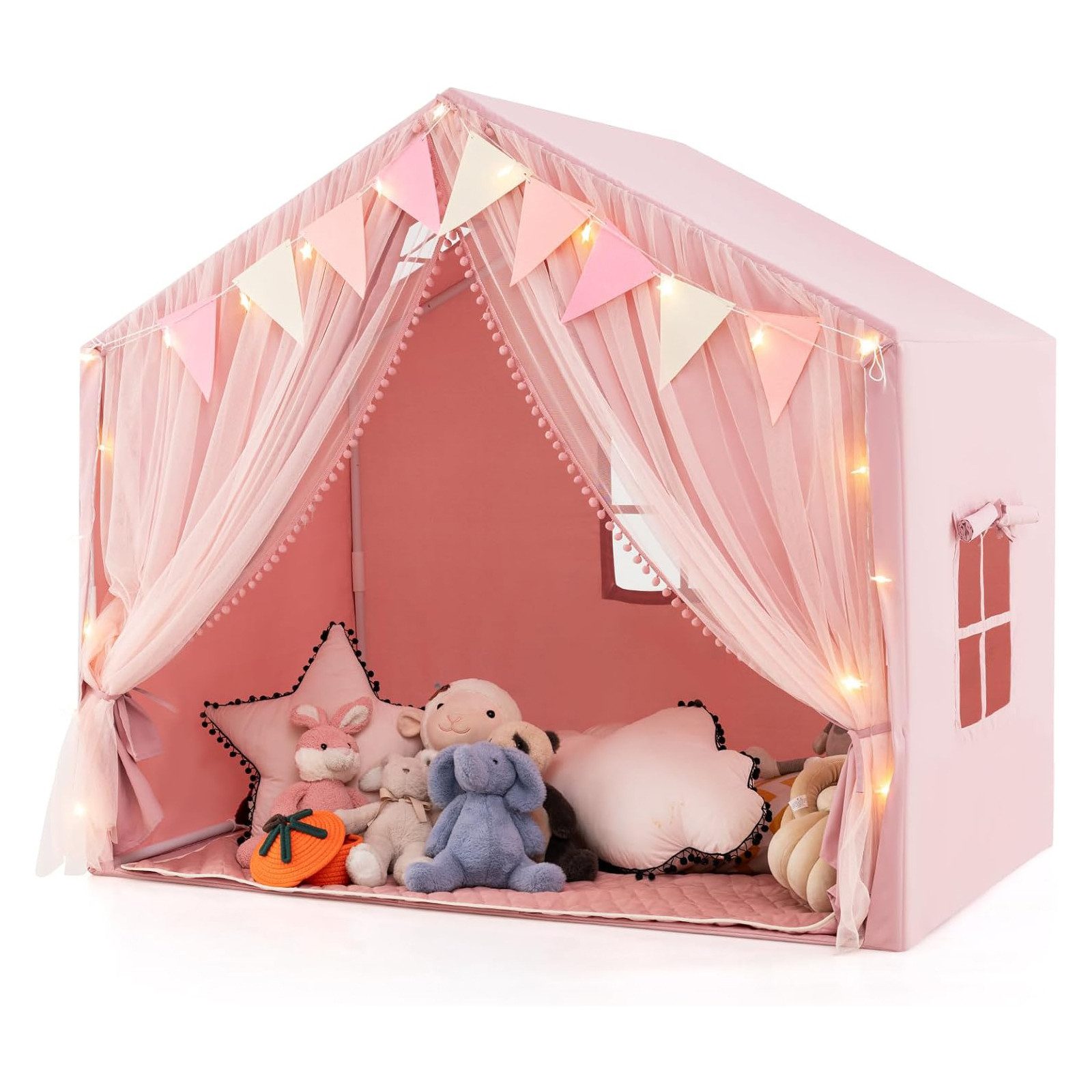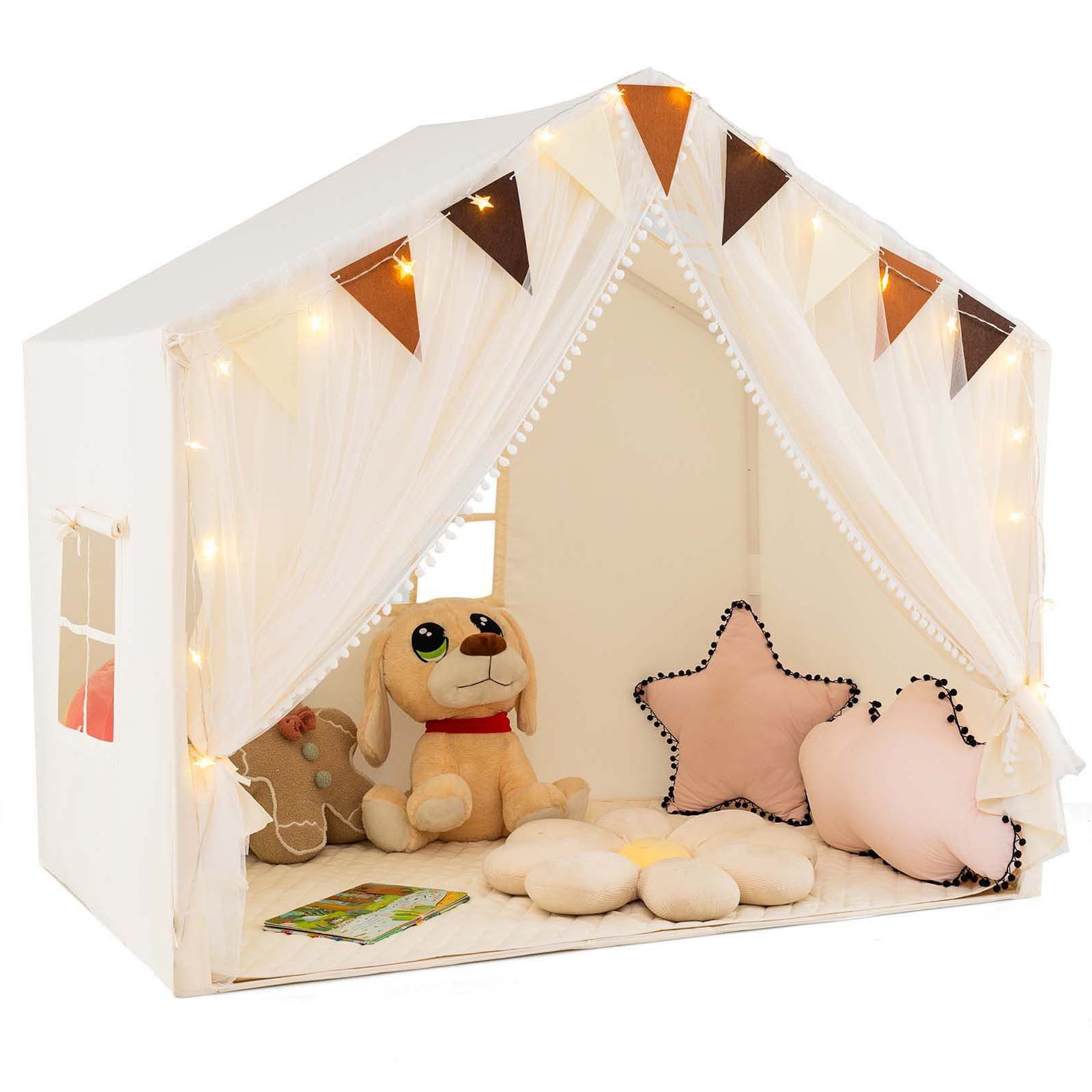 Unser Indoor-Spielhaus für Kinder bietet einen großzügigen Spielbereich, in dem bequem 3–4 Kinder oder ein Kinderbett mit einer Breite von bis zu 125 cm Platz finden. Dieses geräumige Design ermöglicht Ihren Kindern verschiedene Aktivitäten wie Spielen, Lesen oder Schlafen. Das Spielzelt ist mit einer großen Tür ausgestattet, die zur besseren Belüftung geöffnet und zum Schutz der Privatsphäre geschlossen werden kann. Mit 3 Netzfenstern und einem Netzgitter verbessert das Indoor-Spielhaus für Kleinkinder nicht nur die Belüftung, sondern verleiht dem Gesamtdesign auch einen Hauch von Stil. Um das Spielerlebnis zu verbessern, wird das Tipi-Zelt mit einer Lichterkette und Wimpelbannern geliefert, die dem Raum eine skurrile Note verleihen.