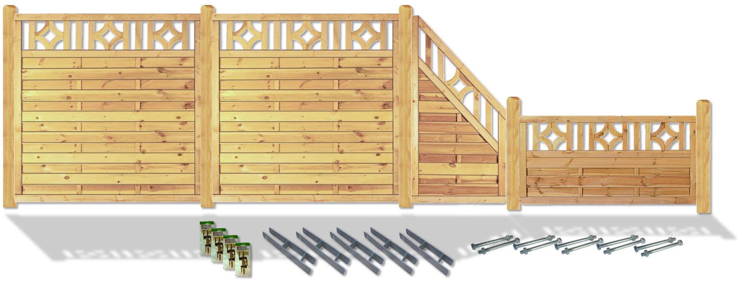 Lieferumfang | 1 Pfosten 9 x 9 x 95 cm 1 Sichtschutzzaun 90 x 180 cm 1 Sichtschutzzaunecke 90 x 180 cm 2 Sichtschutzzäune 180 x 180 cm 4 Pakete Winkelbeschläge 4 Pfosten 9 x 9 x 190 cm 5 H-Pfostenträger 5 Pakete Durchgangsschrauben |