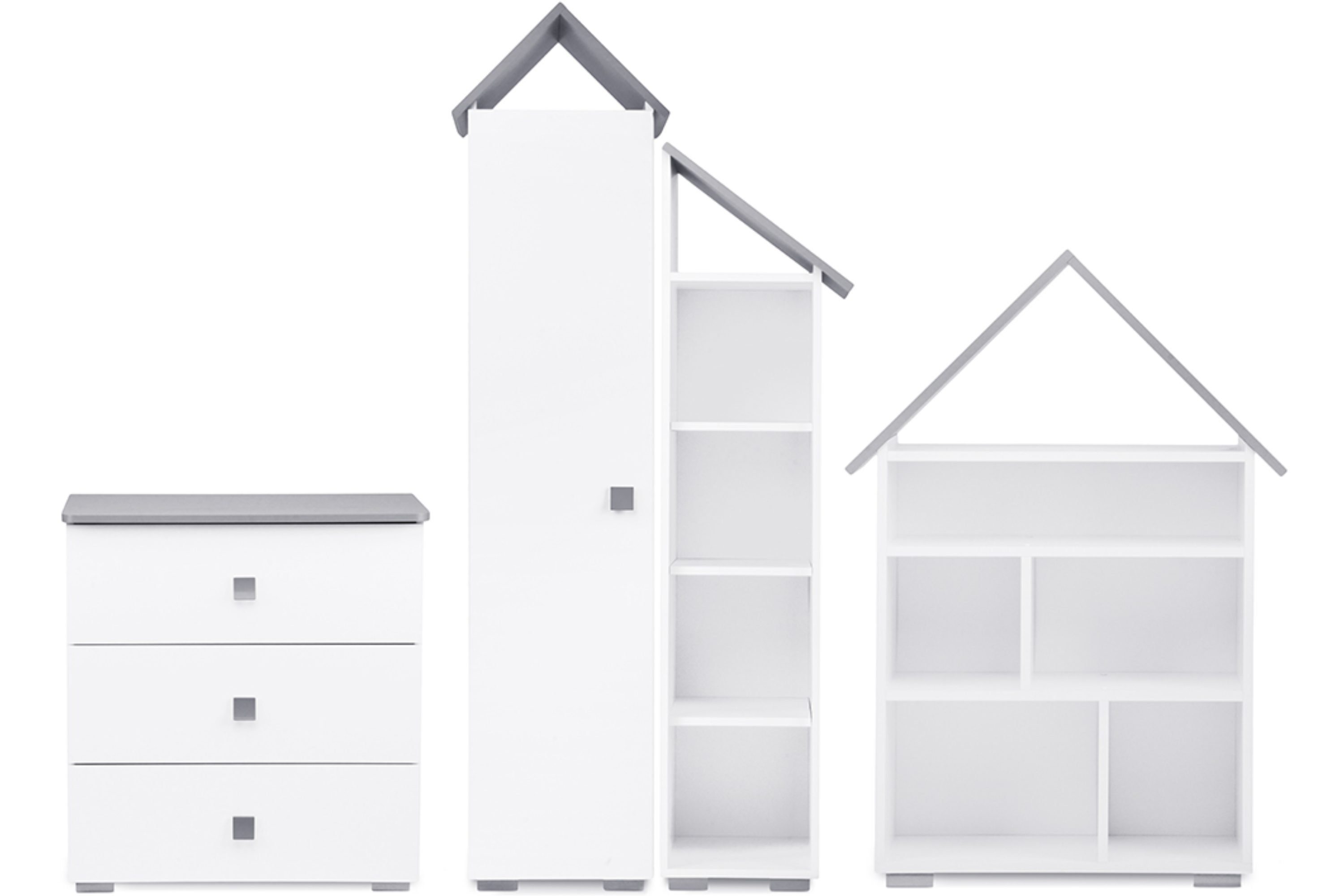 Lieferumfang | 1x Kommode mit Schubladen 1x Kleiderschrank mit Stange 1x Hochregal 1x Unteres Bücherregal |