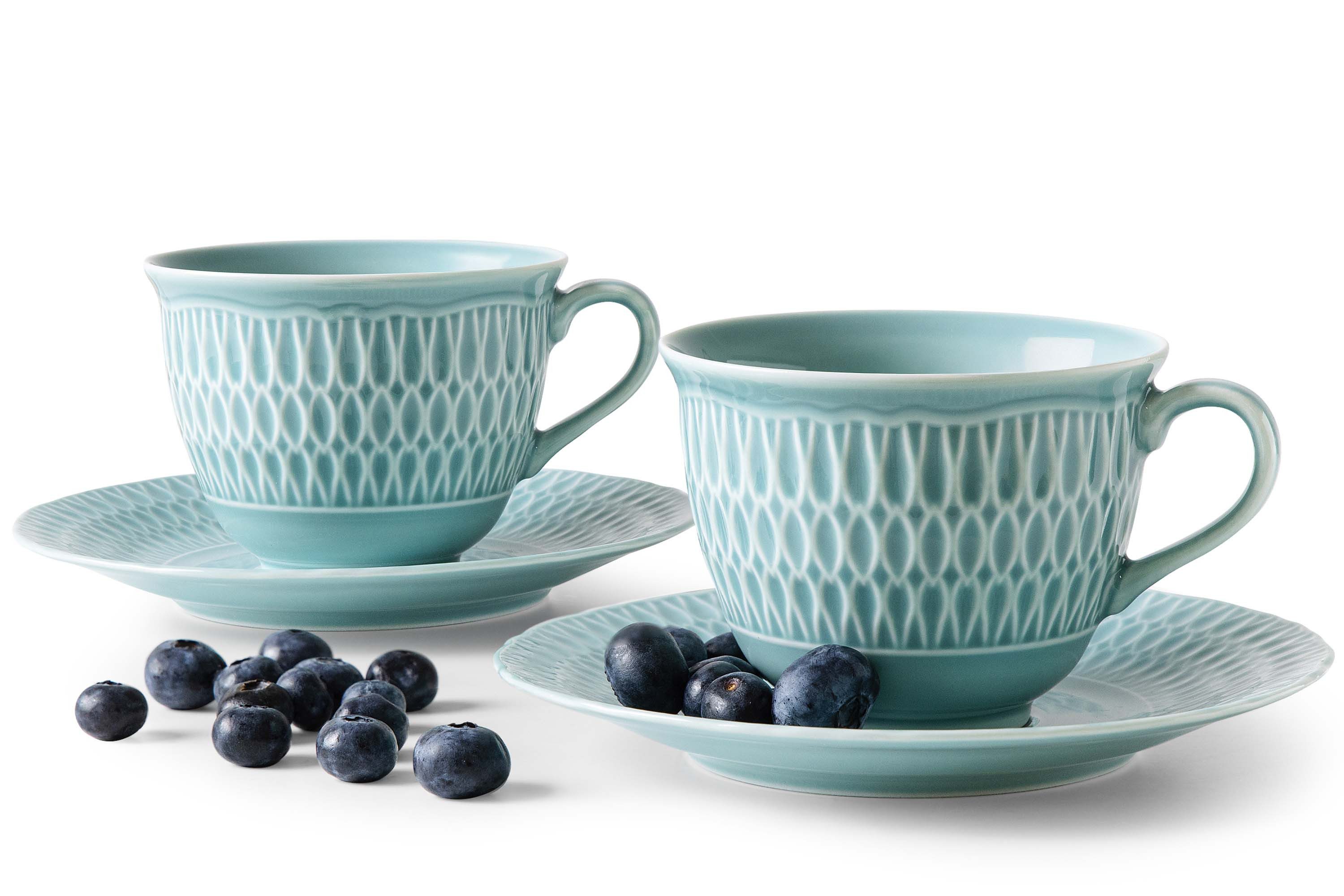 Die Kaffeesets zeichnen sich durch zarte Farben (mondgrau, rosa, smaragdgrün, azur) und feine Rillen aus, die dem Porzellan seinen einzigartigen Charme und seine Finesse verleihen.