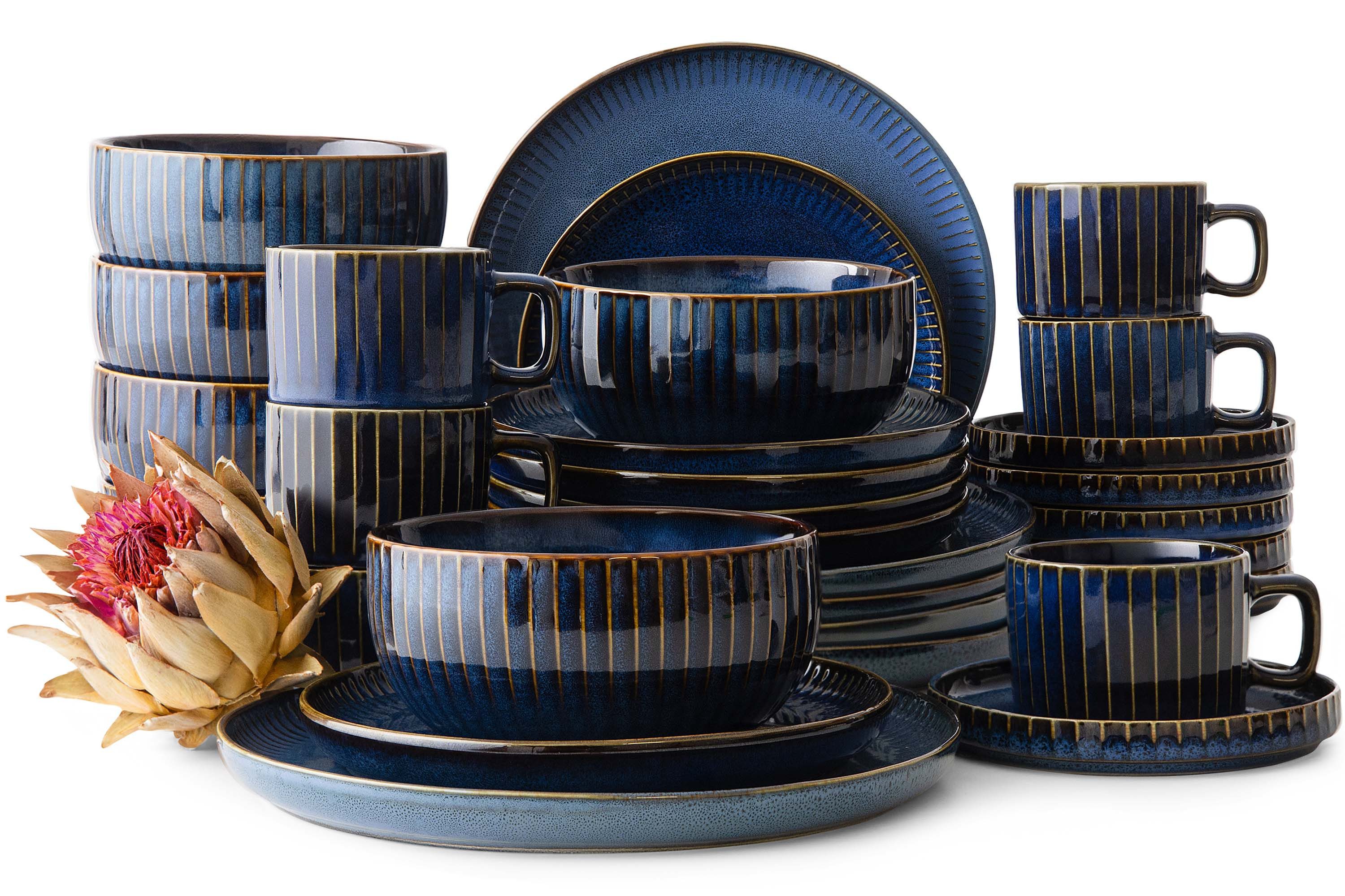 KONSIMO® Kombiservice AD STRIPES Geschirr-Set, Tafelservice, Reaktivglasur (30-tlg), 6 Personen, Porzellan, spülmaschinengeeignet, mikrowellengeeignet, handgefertigt