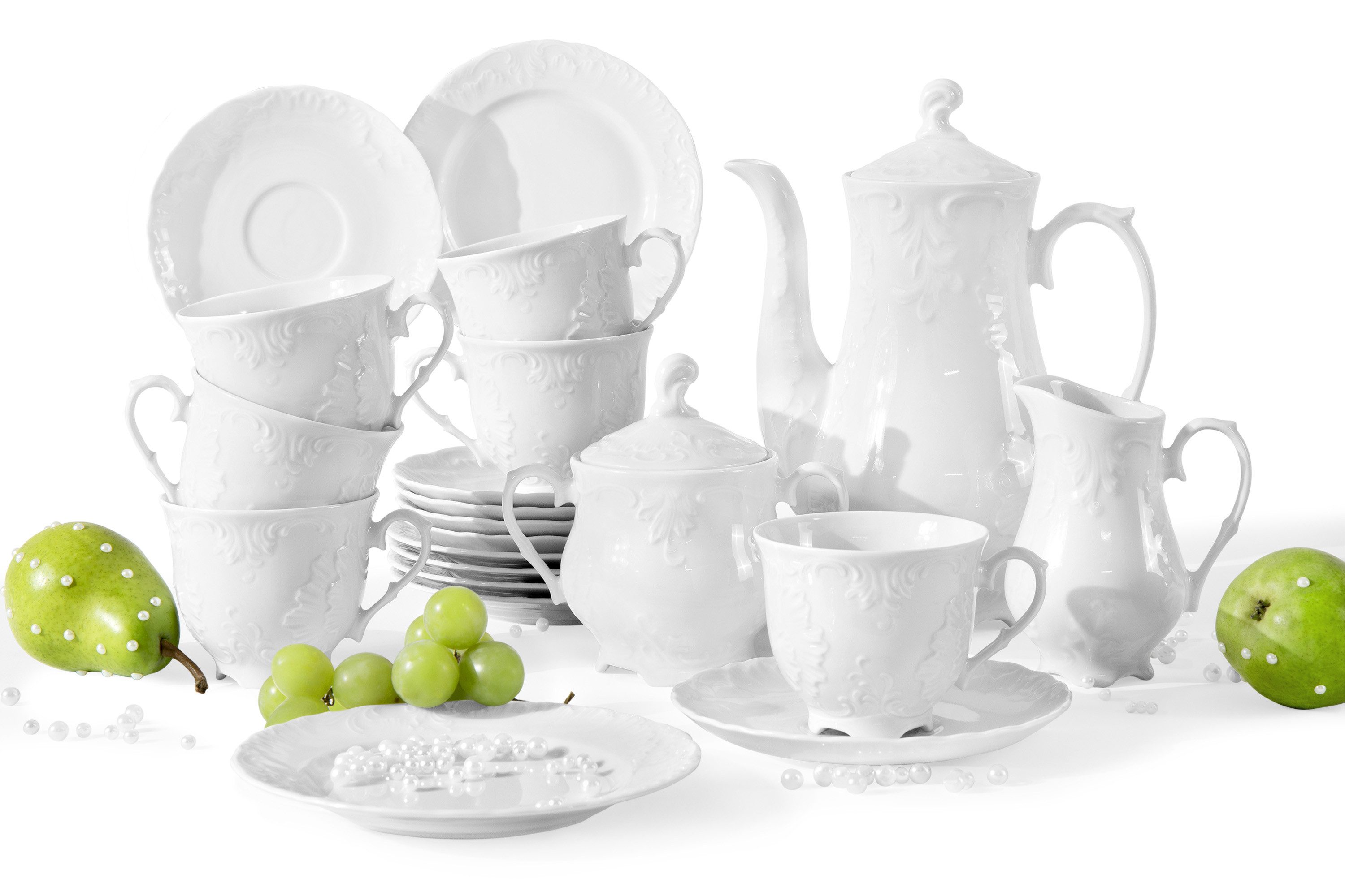 Entdecken Sie die außergewöhnliche ROCOCO-Porzellankollektion, die für alle geschaffen wurde, die höchste Qualität, klassische Eleganz und Liebe zum Detail schätzen. Jedes Teil des Sets ist aus weißem Porzellan mit dezenten Dekoren gefertigt, die ihm einen edlen und zeitlosen Charakter verleihen. Diese Art von Geschirr kommt nie aus der Mode, und seine minimalistische, aber raffinierte Ästhetik fügt sich perfekt in jeden Einrichtungsstil ein.