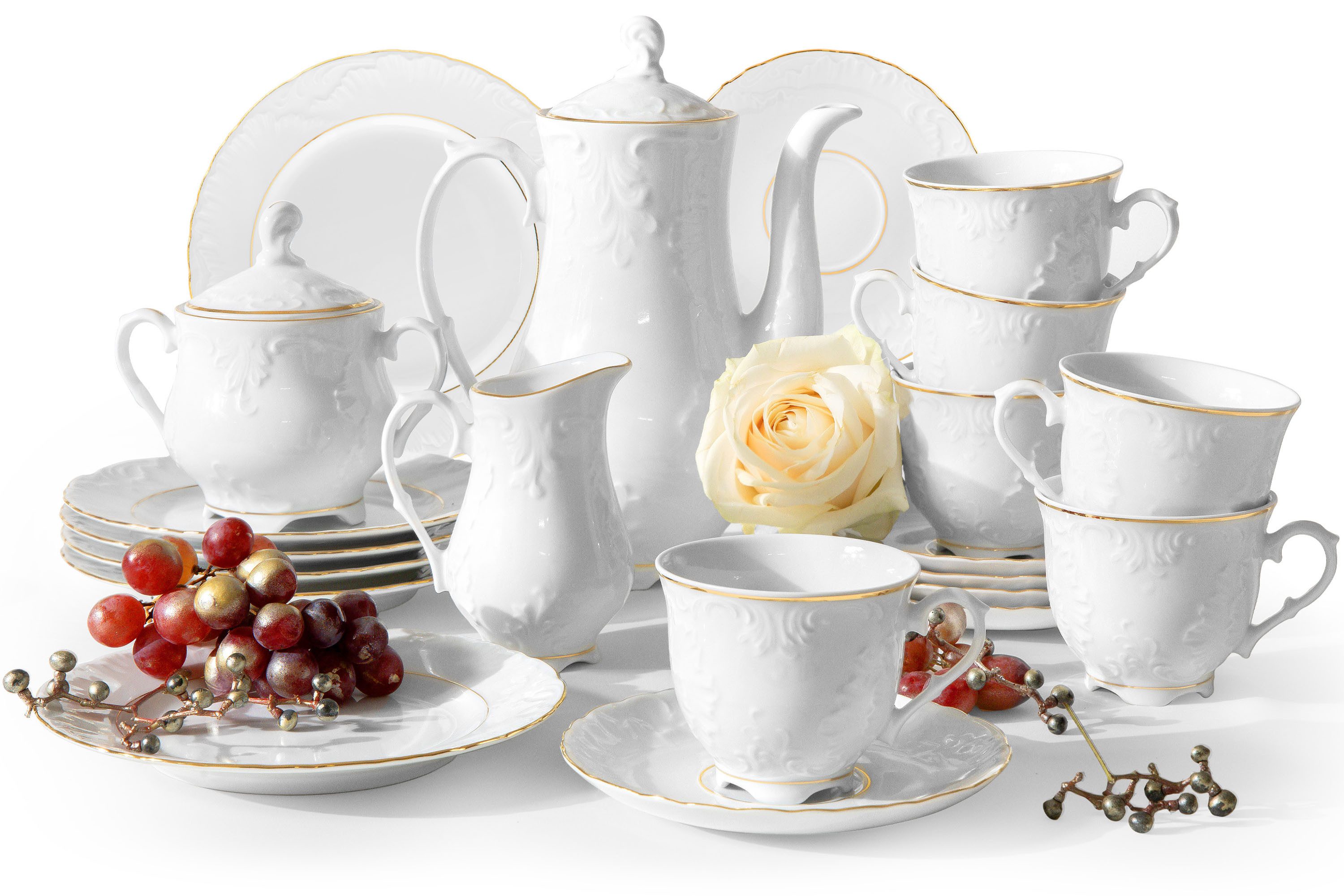 Aber das ist noch nicht alles - diese Kollektion kann nach Belieben erweitert werden, indem man zusätzliche Teile kauft, z. B. eine elegante Zuckerdose, einen stilvollen Krug, ein Eierglas aus Porzellan sowie viele andere Details, die jedem gedeckten Tisch Individualität verleihen. Mit ROCOCO können Sie einzigartige Sets zusammenstellen, die sowohl für den täglichen Gebrauch als auch für Familienfeiern, Feiertage oder romantische Abendessen eine wunderbare Dekoration darstellen, oder Sie verwenden die von uns angebotenen fertigen Sets.