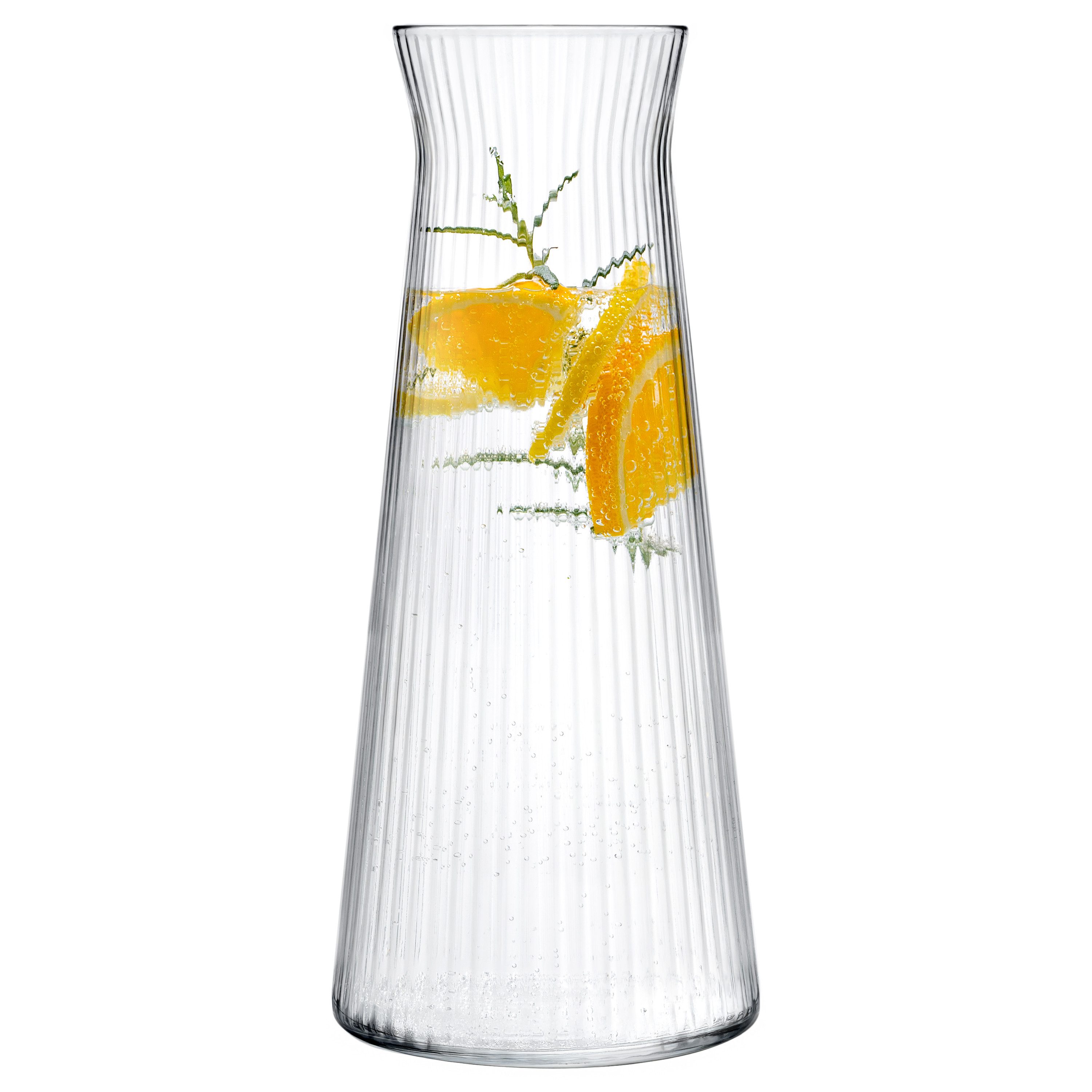 Diese elegante geriffelte Glaskaraffe vereint stilvolles Design mit hoher Funktionalität. Dank ihrer 1-Liter-Kapazität passt sie problemlos in die Tür der meisten Kühlschränke und ermöglicht eine einfache Aufbewahrung von Getränken.