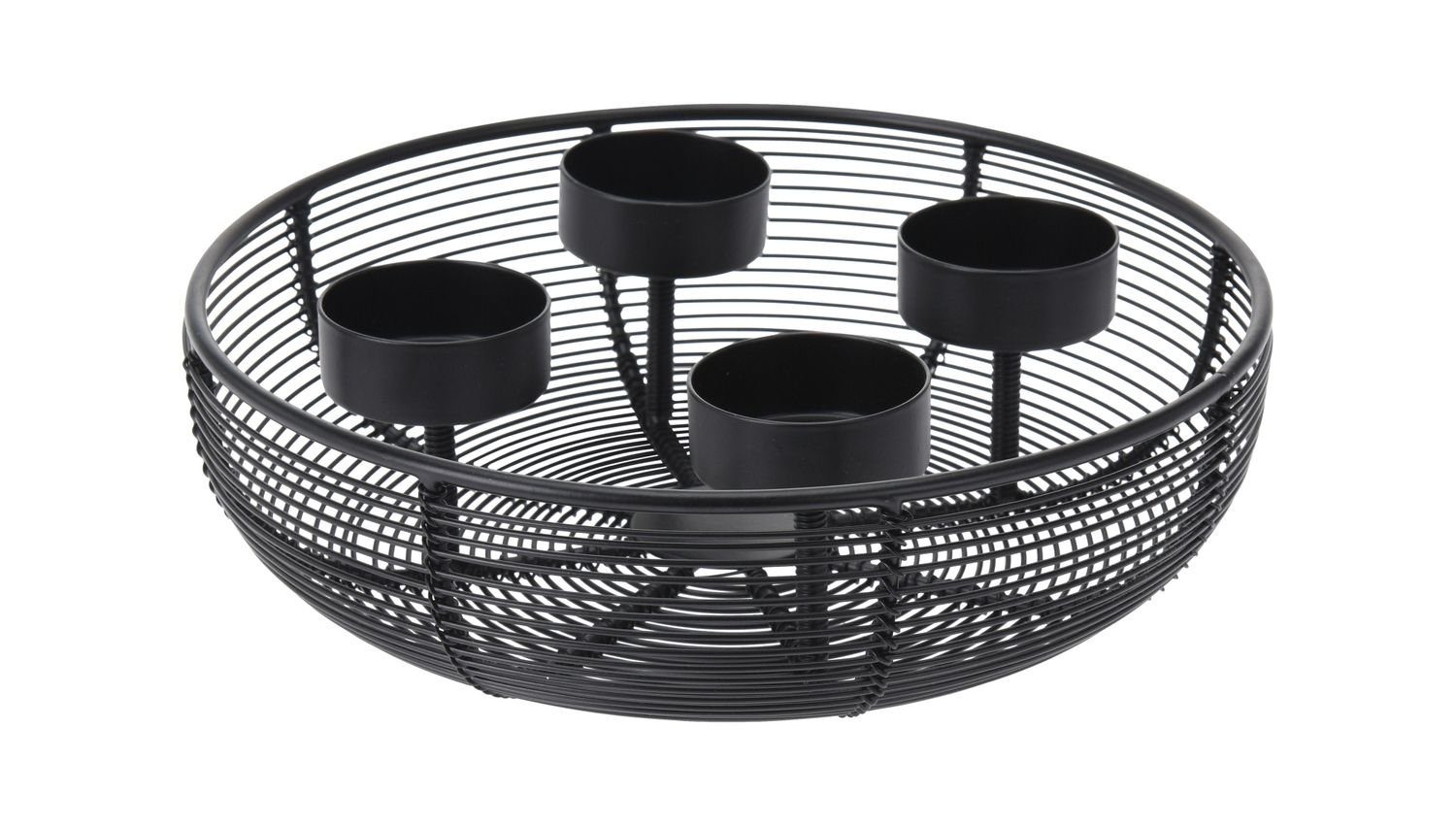 Eine moderne Version eines Adventskranzes mit Platz für eigene Dekorationsideen! Diese schicke Metallschale aus schwarzem Drahtgeflecht mit vier Kerzenhaltern bietet extra Platz für Tannenzweige, Kugeln, Tannenzapfen, Weihnachtsschmuck, Schleifen und mehr. Lassen Sie Ihrer Kreativität freien Lauf und gestalten Sie Ihren ganz persönlichen Adventskranz für Ihr Zuhause.