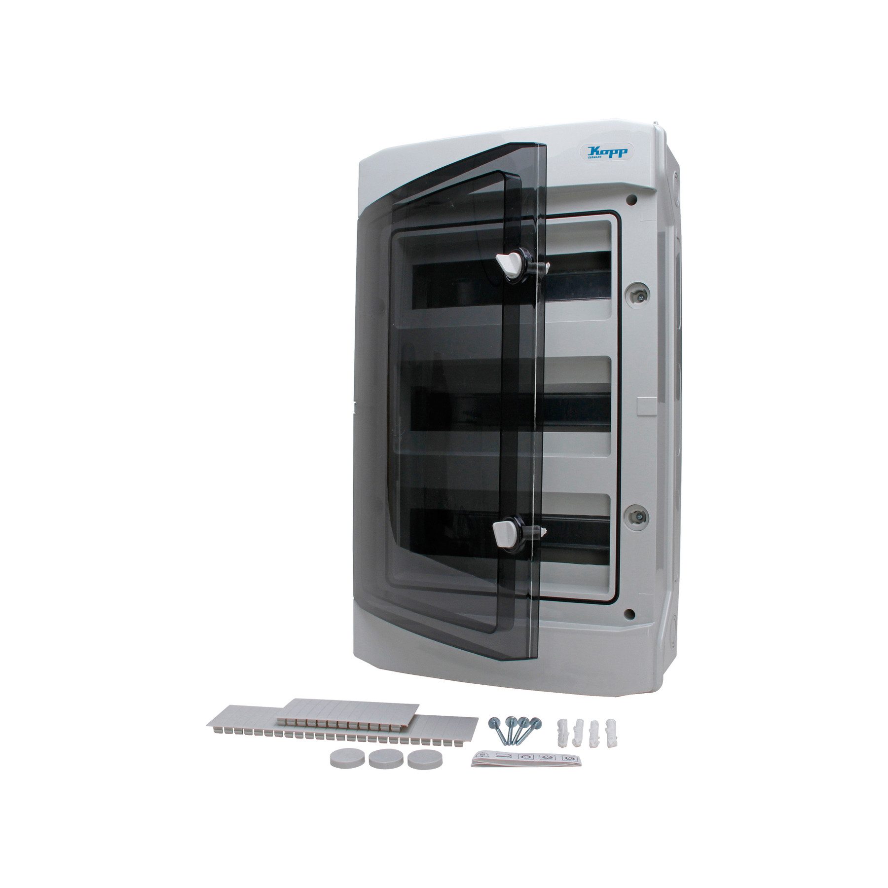 Der Aufputz-Feuchtraum-Verteilerkasten mit IP65-Schutz bietet zuverlässigen Schutz in feuchten Umgebungen. Ausgestattet mit einer robusten Tür, Klemmleiste und weiterem Zubehör ist er für 36 Pole auf einer Reihe ausgelegt. Mit seinen kompakten Abmessungen von 319x144x508mm passt er in jede Installation. Beachten Sie bitte, dass Blindabdeckungen nicht enthalten sind. Ideal für sichere und saubere Stromverteilung in anspruchsvollen Umgebungen.