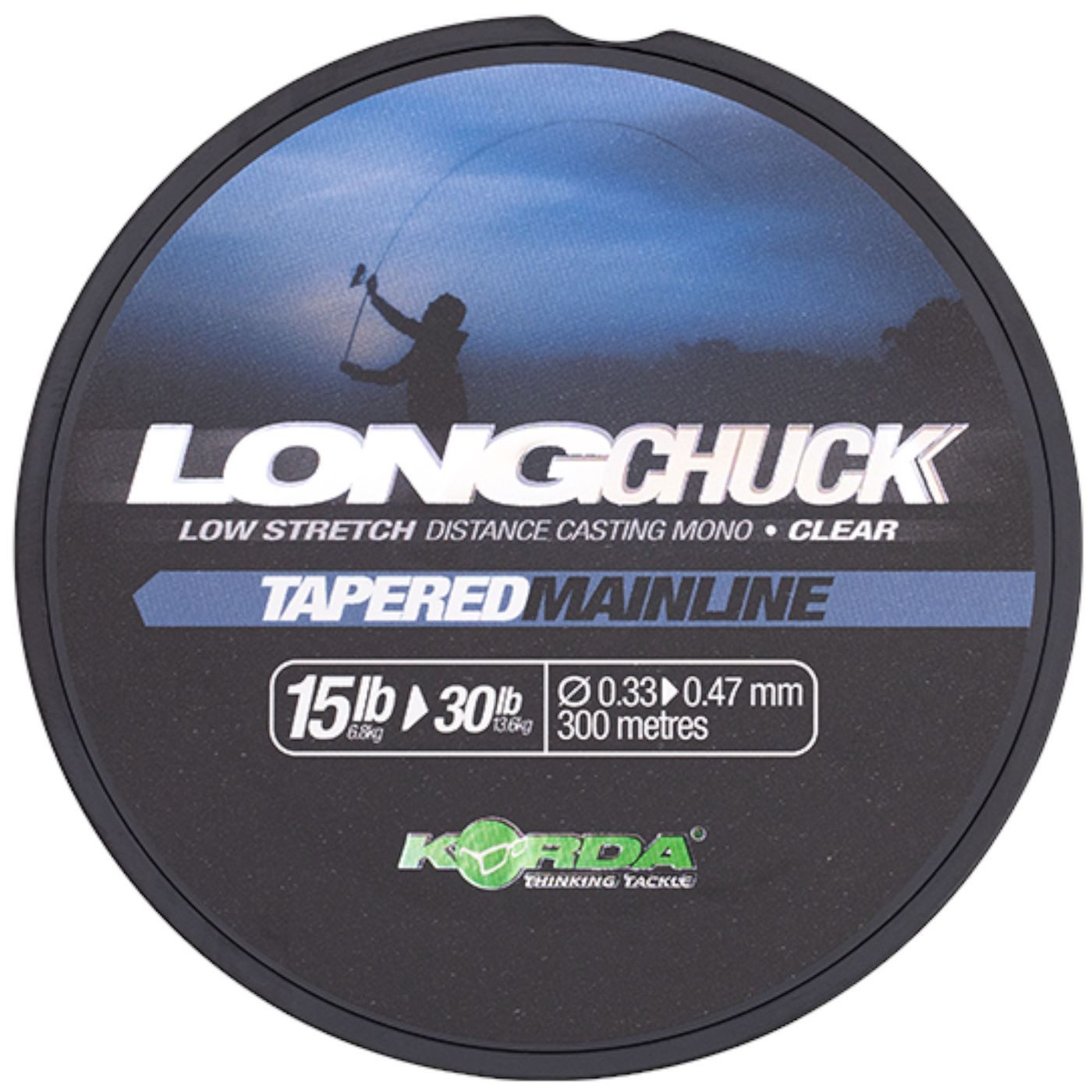 Korda Long Chuck Tapered Mainline - 300m monofile Karpfenschnur - Die Angelschnur aus dem Hause Korda ist eine gute Schnur, die für das Angeln auf Karpfen konzipiert wurde. Sie wurde für das Werfen auf Distanz in Situationen entwickelt, in denen Sie ohne Vorfachknoten direkt durchfischen möchten. Sie bietet sich an, wenn Sie an krautigen Stellen fischen möchten, da sich kein Kraut um den Knoten sammeln und Probleme unter der Rutenspitze darstellen kann. Die Angelschnur verfügt an beiden Enden über einen acht Meter langen Abschnitt, der so konzipiert ist, dass sie die Kraft des Wurfes aufnehmen kann und beim Angeln am Gewässergrund eine gute Abriebfestigkeit bietet - plus einem sich verjüngenden Abschnitt von 2 Metern bis zu dem von Ihnen gewählten Durchmesser der Hauptschnur. Sie ist an beiden enden gleich aufgebaut, sodass Sie bei einem Abriss einfach die Schnur auf ihrer Spule umdrehen und diese erneut verwendet können. Die sich verjüngende Hauptschnur verfügt über geringe Dehnung und eine transparente Farbe.